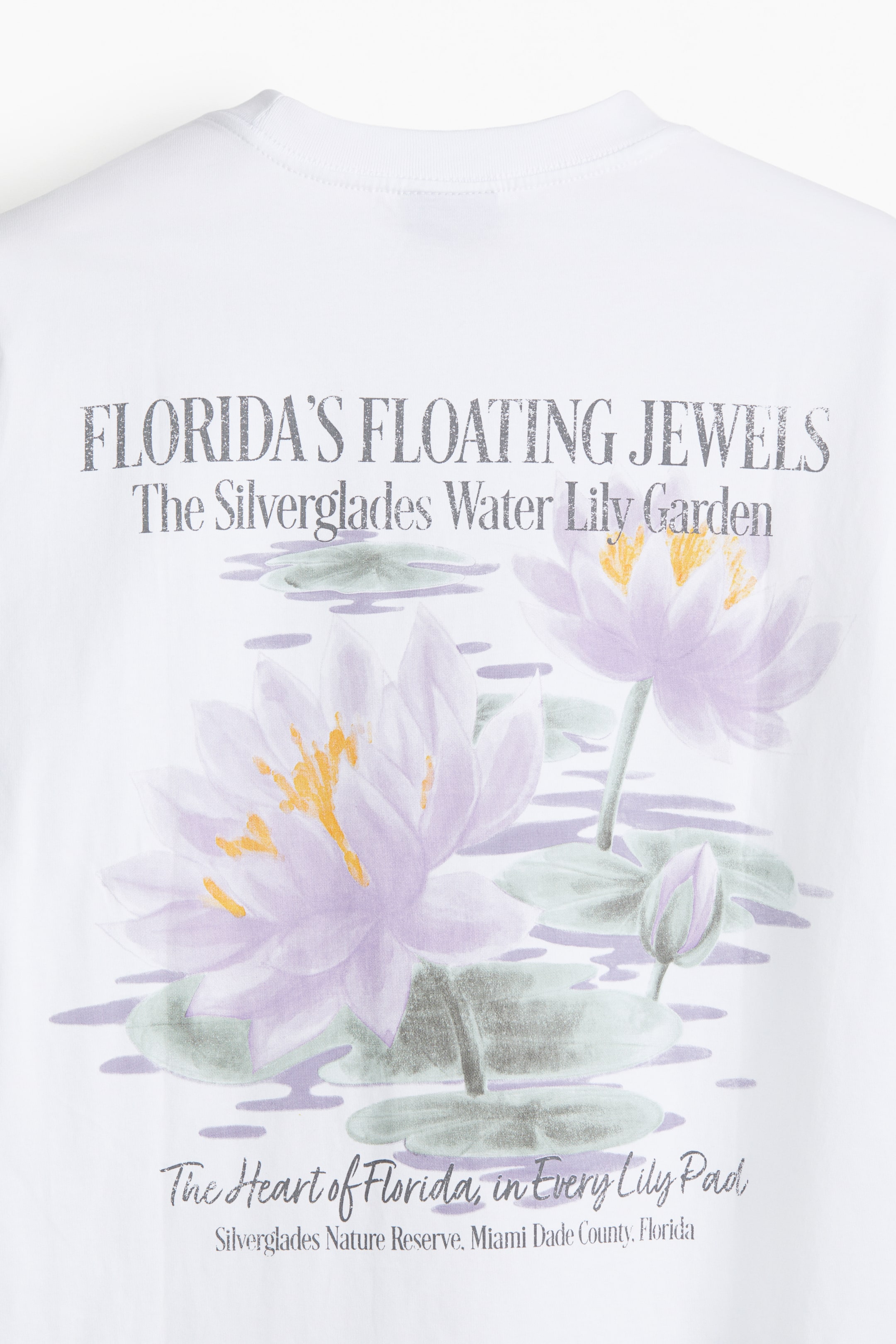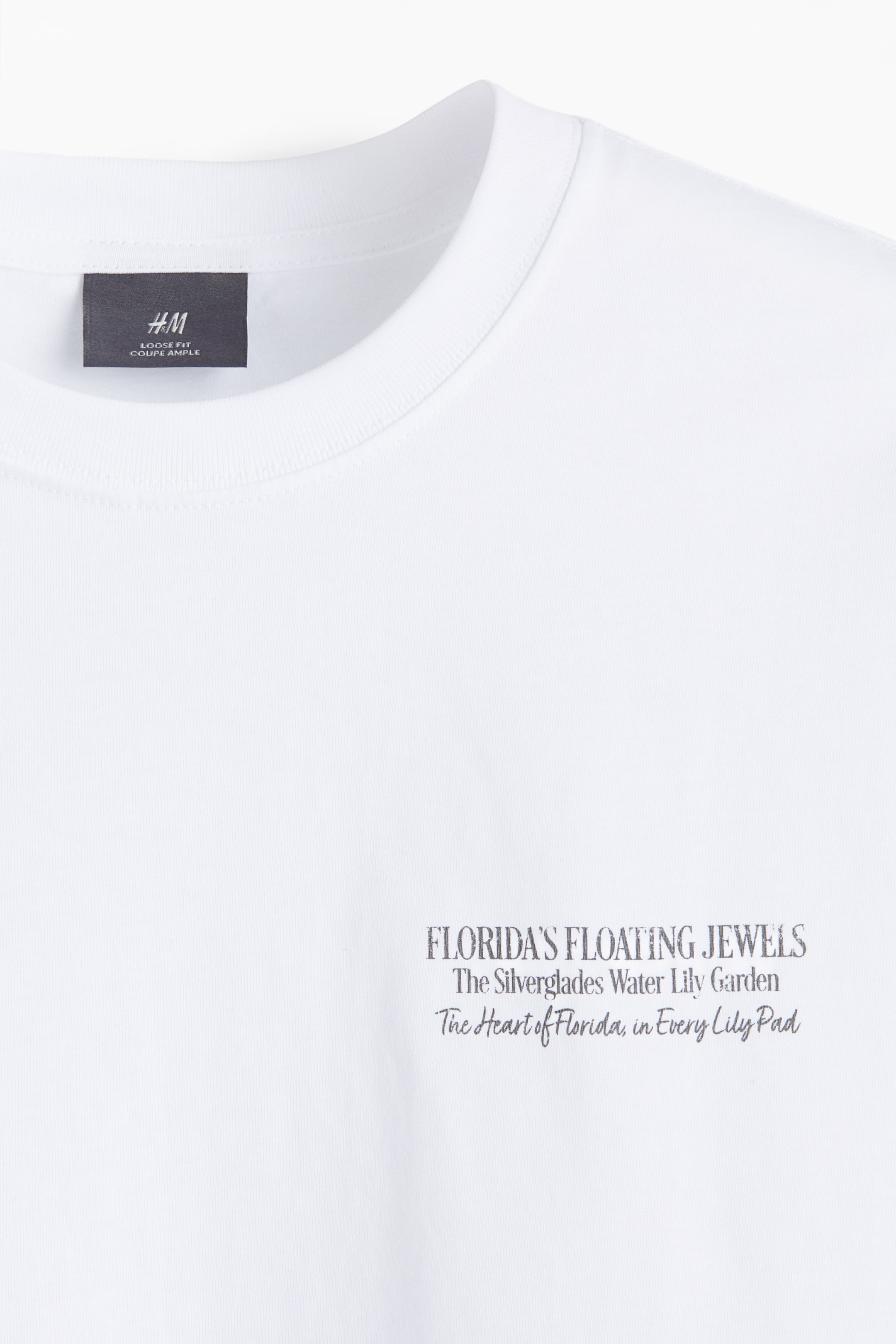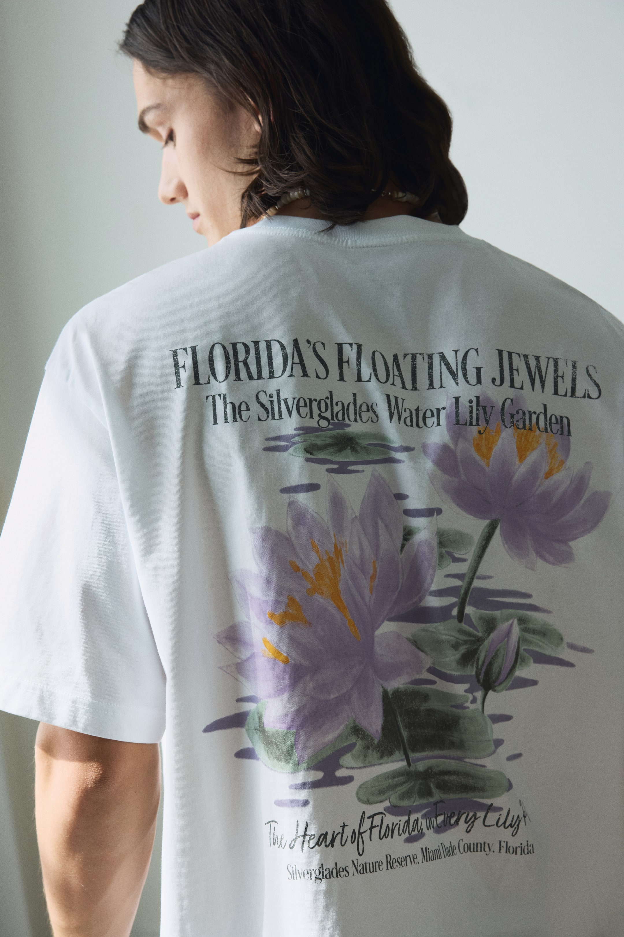 プリントをあしらったTシャツ。中厚手のコットンジャージー素材。ラウンドネックで、ネックラインにリブのトリム付き。ドロップショルダー。ルーズフィット。ゆとりがありつつ、オーバーサイズではないシルエット。