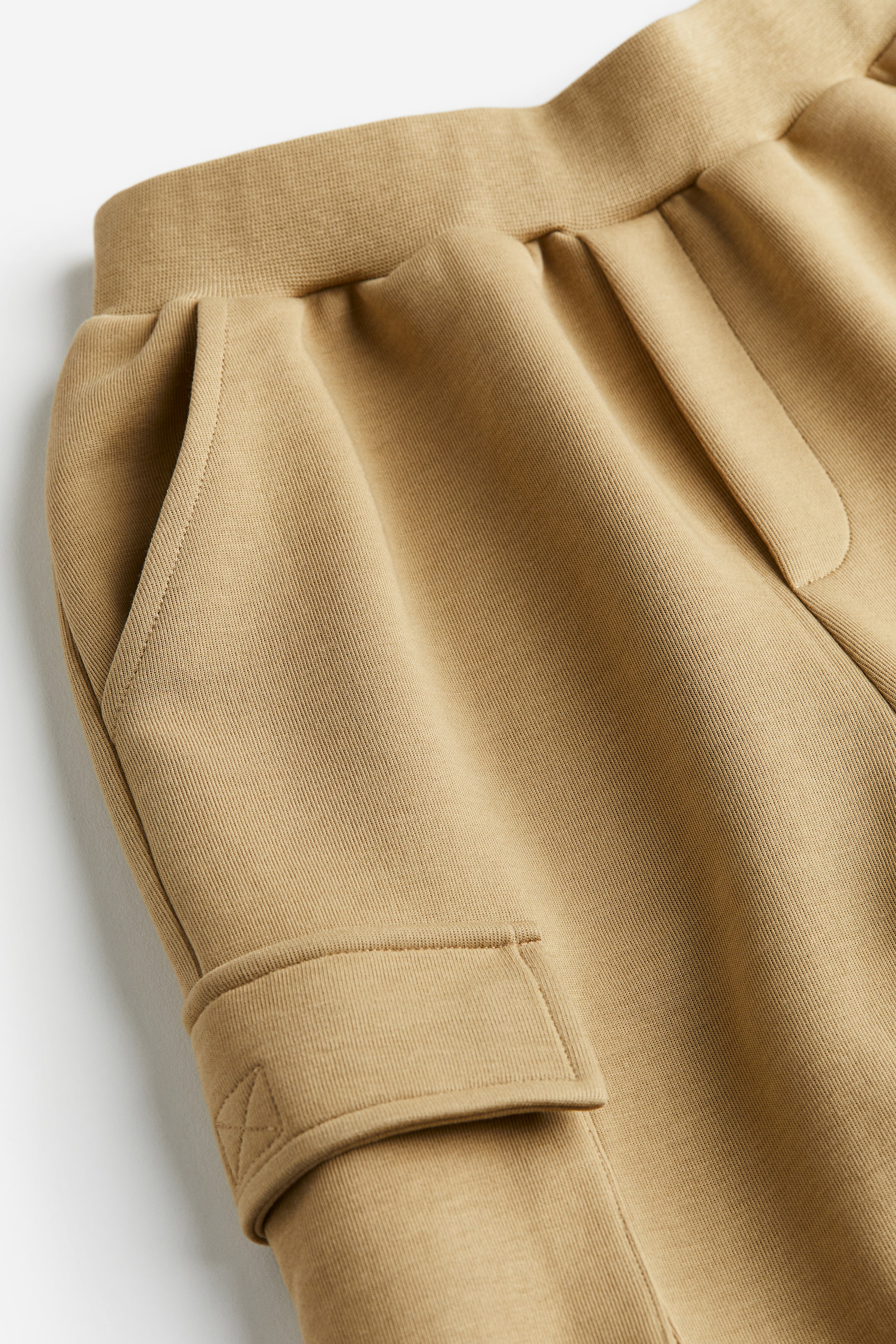 ソフトなスキューバジャージー素材のカーゴジョガーパンツ。ヒップから太ももにかけてレギュラーフィット。ゴムウエストで、前開きはフェイク。斜めフロントポケット付き。レッグ部分に隠し面ファスナー留めのフラップポケット付き。裾にワイドなリブ付き。