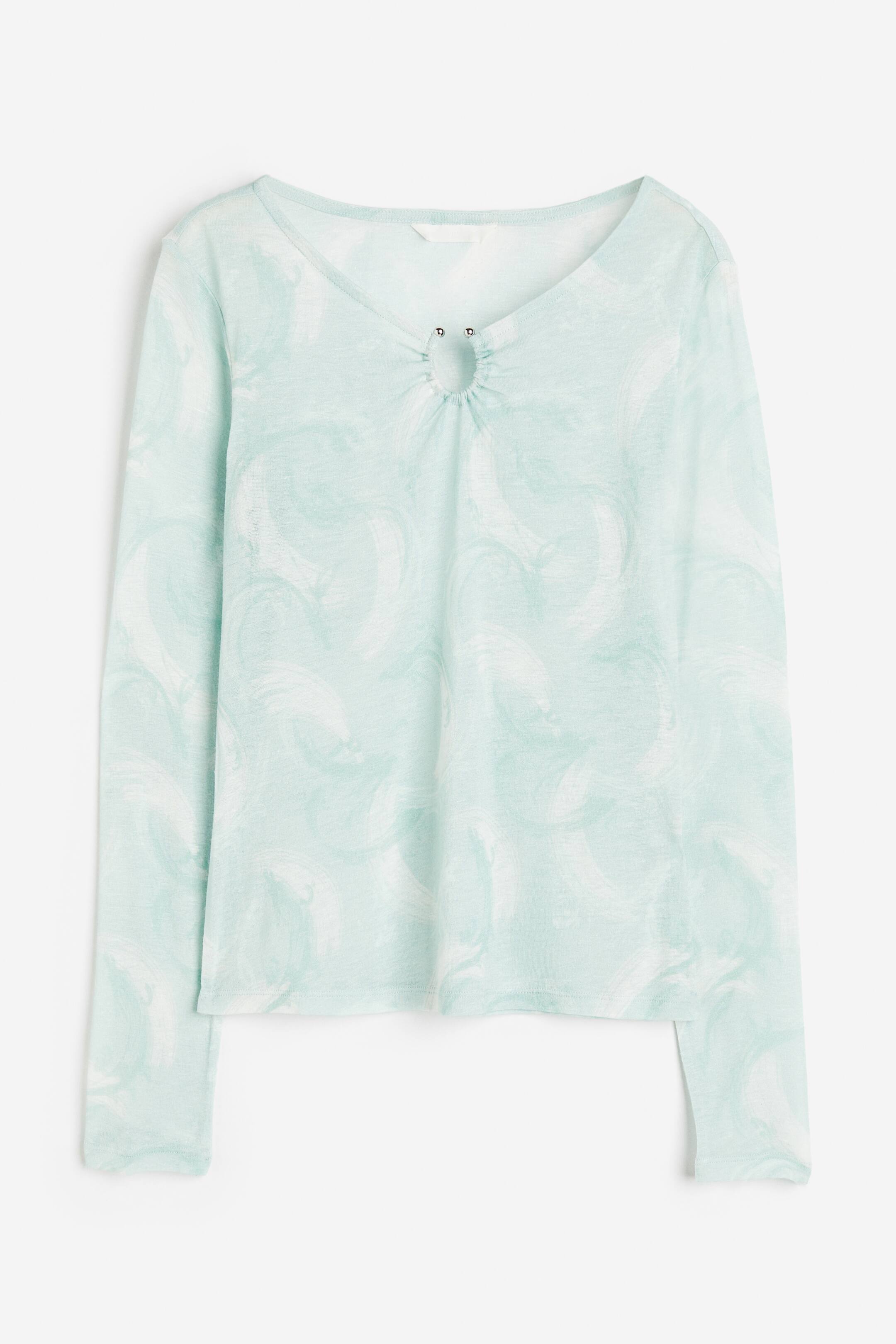 レーヨンとリネン混紡の柄入りジャージー素材を使用したトップス。ボディにフィットするスタイル。ネックラインはV字形で、胸元にあしらったメタルのディテールがゆるやかなドレープを創り出しています。長袖。裾はストレートカット。