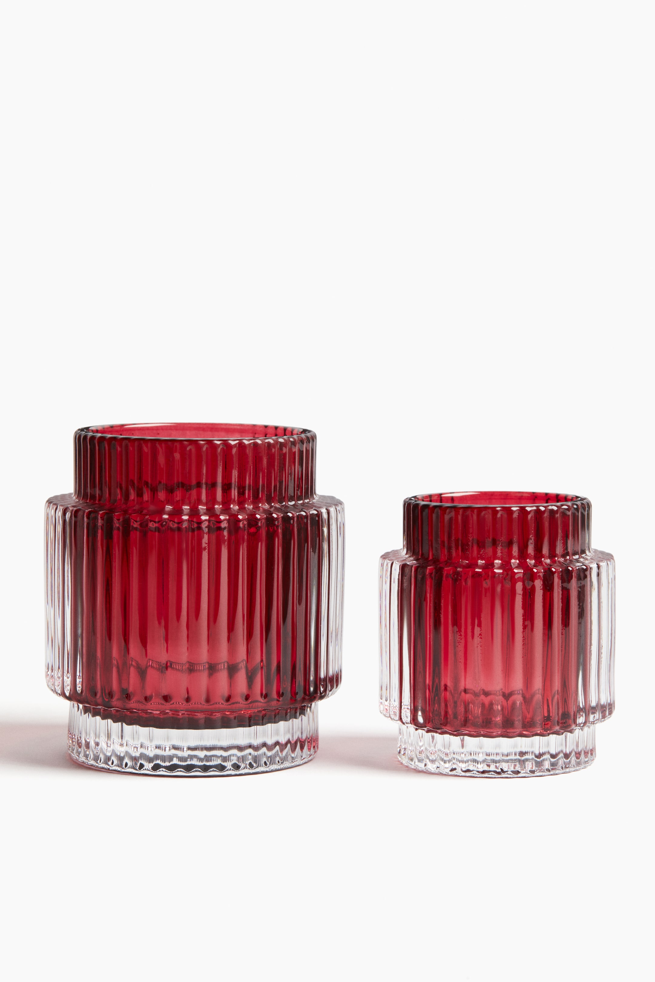 リブが入ったガラス製の円形キャンドルホルダー。直径 9cm、高さ 10cm。