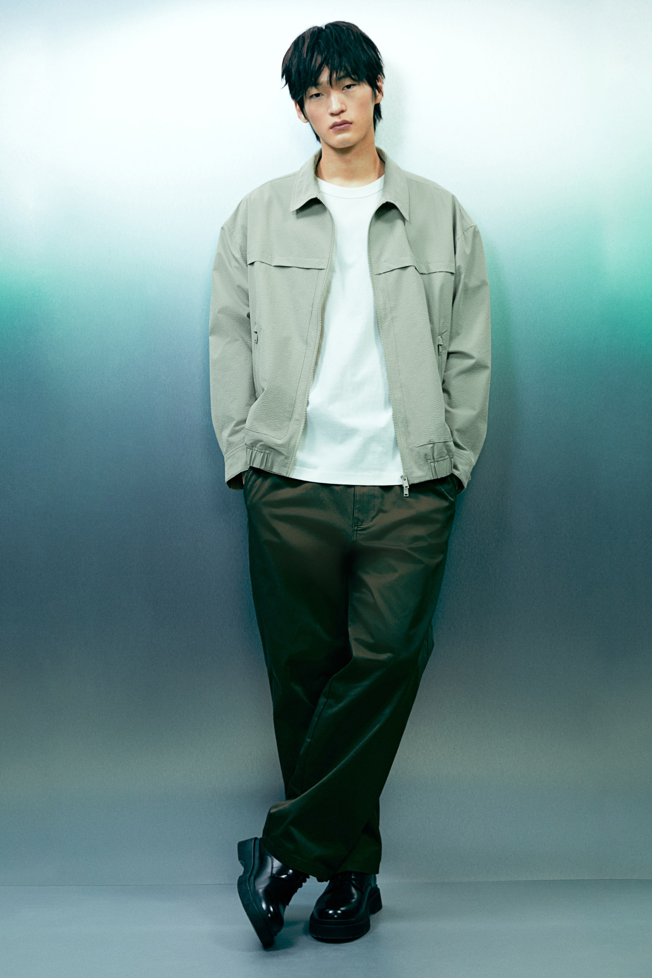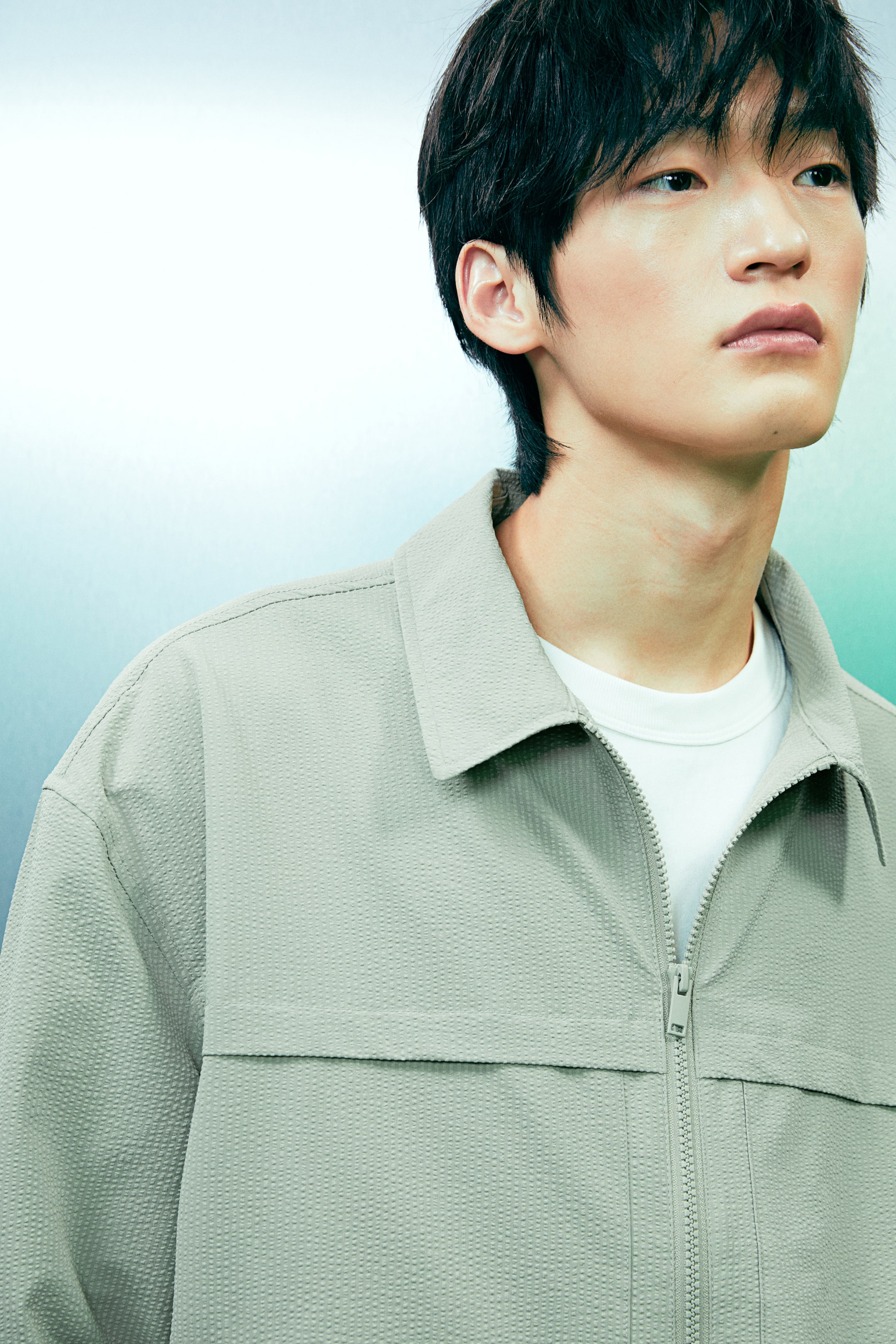 ワッフル織物素材のジャケット。襟付き。フロントジップで、上からも下からも開閉可能なダブルジッパー採用。フロントとバックにヨーク付き。ジッパータイプのサイドポケット付き。ドロップショルダー。袖口はスリット入りで、スナップボタン付き。裾の内側にゴム入り。ルーズフィット。ゆとりがありつつ、オーバーサイズではないシルエット。裏地付き。