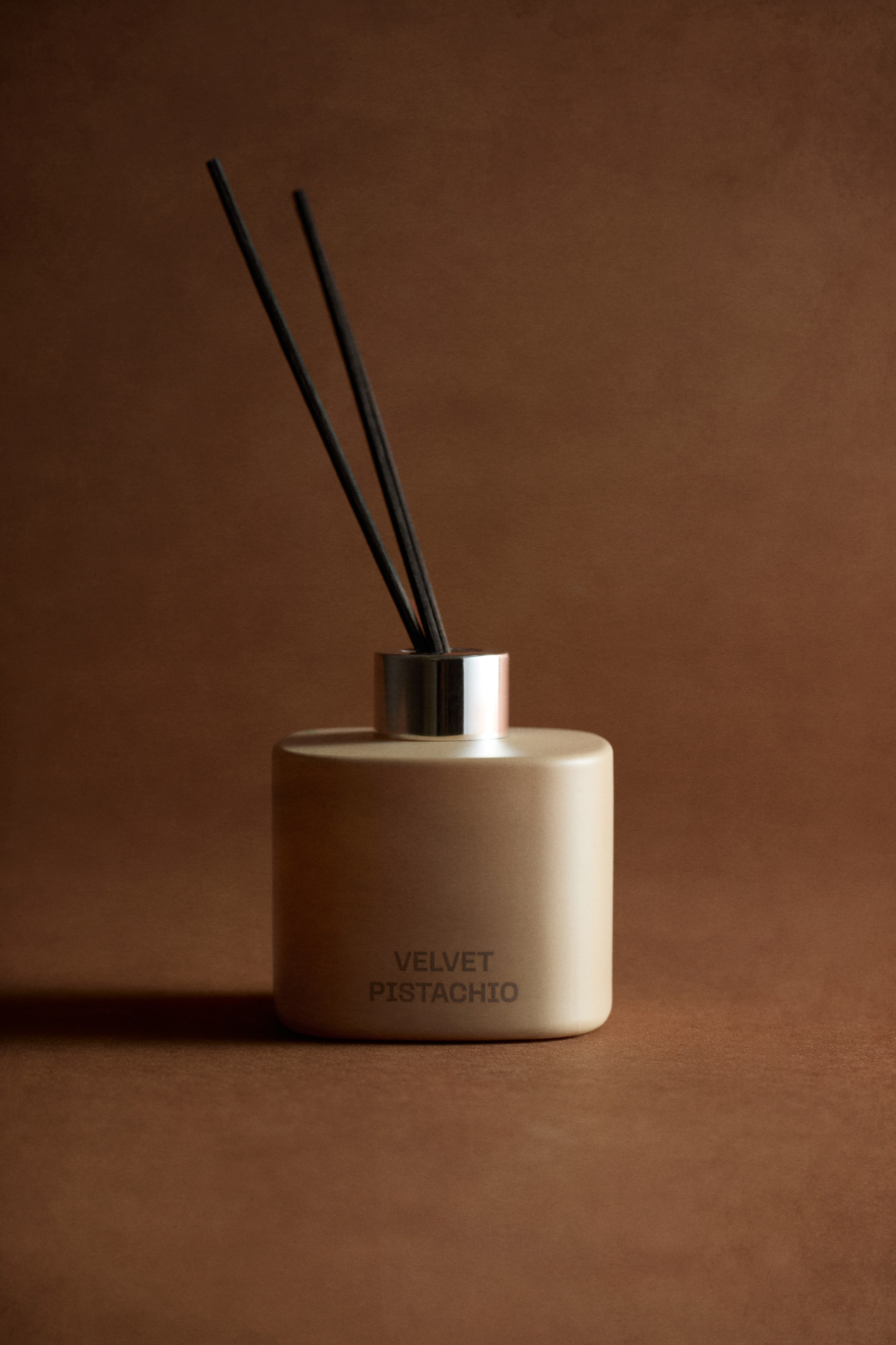 贅沢なサテンのような仕上げを施した、ディフューザースティック付きのガラスボトル。ディフューザースティックが香り付きオイルを吸い上げ、心地よい香りがお部屋に優しく広がります。