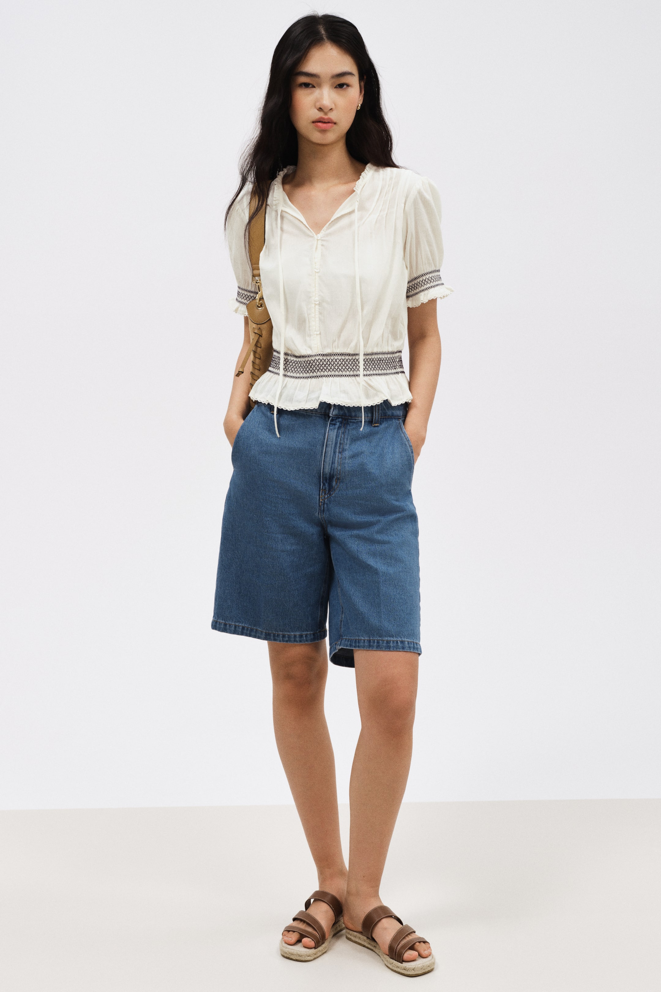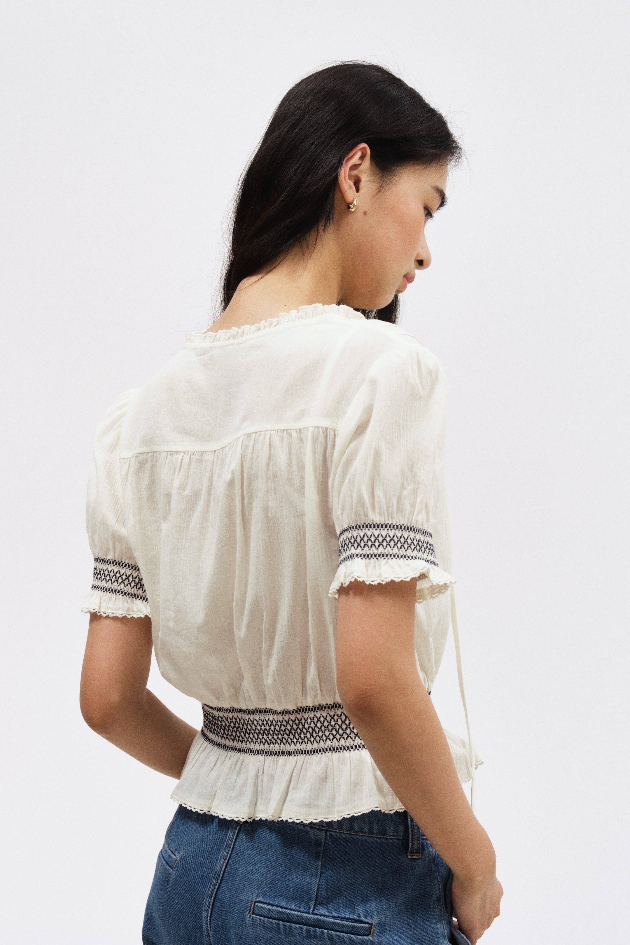 シワ加工コットン織物素材のブラウス。フリルが付いたラウンドネック。フロントがV字形に開いており、結べる細いリボンが付いています。ショルダー周りにピンタック入り。フロントにボタン付き。バックはヨーク切り替えで、ギャザーが寄せられています。半袖のパフスリーブ。袖口とウエスト部分にコントラストカラーのスモッキング刺繍入りパネルを施し、ピコットの縁付きフリルをあしらったデザイン。