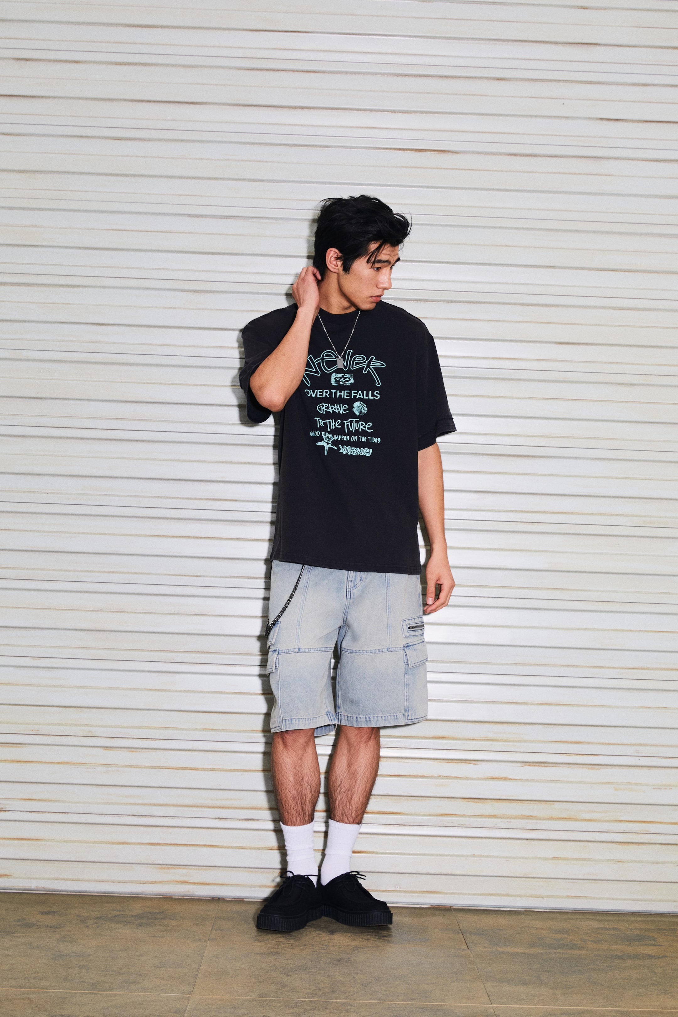 厚手のコットンジャージー素材を使用したTシャツ。プリント入り。ラウンドネックで、ネックラインにリブのトリム付き。ドロップショルダー。裾はストレートカット。ショルダーシームは切りっぱなし。ルーズフィット。ゆとりがありつつ、オーバーサイズではないシルエット。