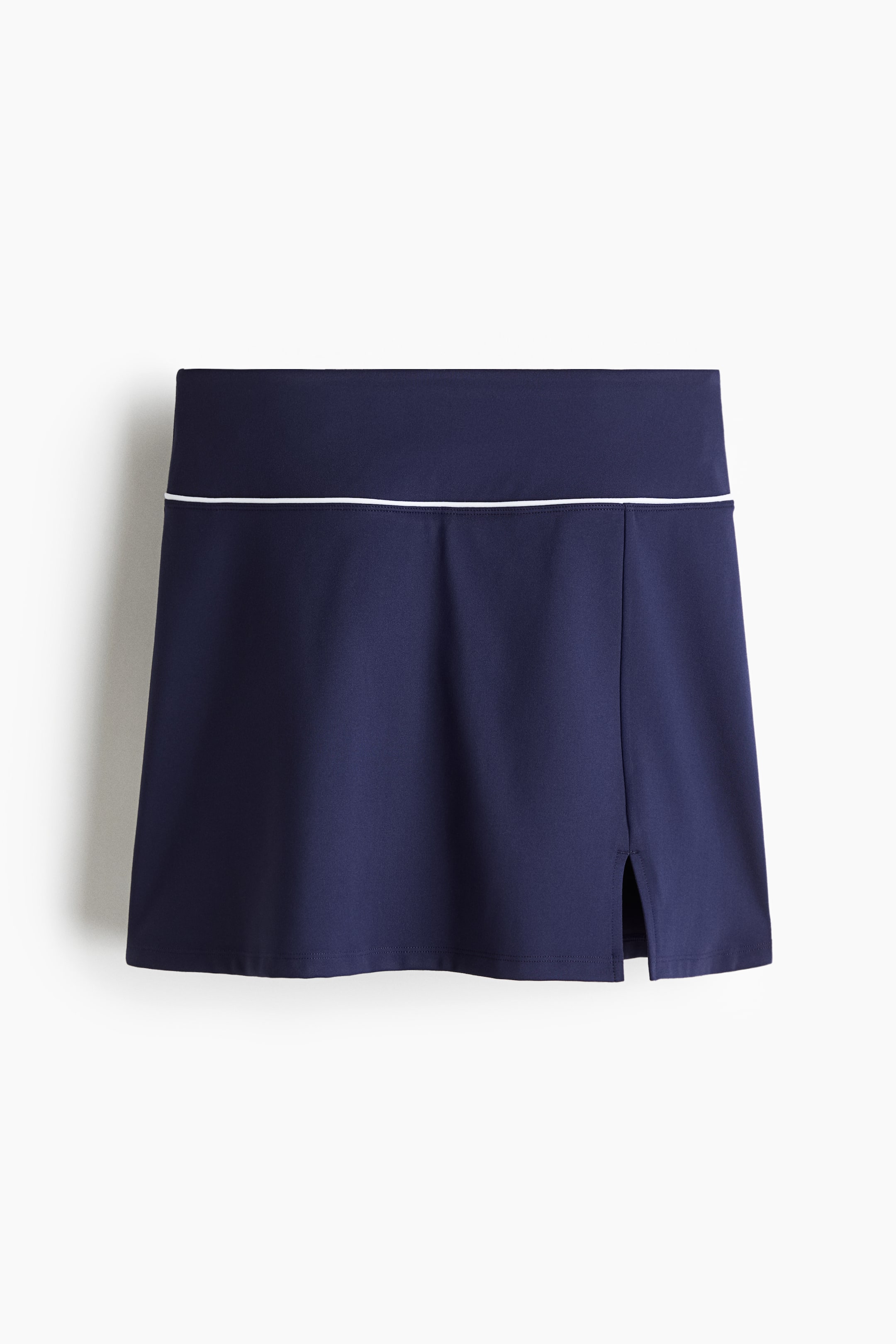 機能性素材のスポーツスカート。肌から湿気を逃がしやすくするDryMove™採用で、運動中もさらりと快適な着用感をキープします。ゴム入りのハイウエスト。片方のサイドにスリット入り。ジャージー素材のホットパンツの上にスカートを重ねたスタイルで、片方のレッグにポケット1つ付き。