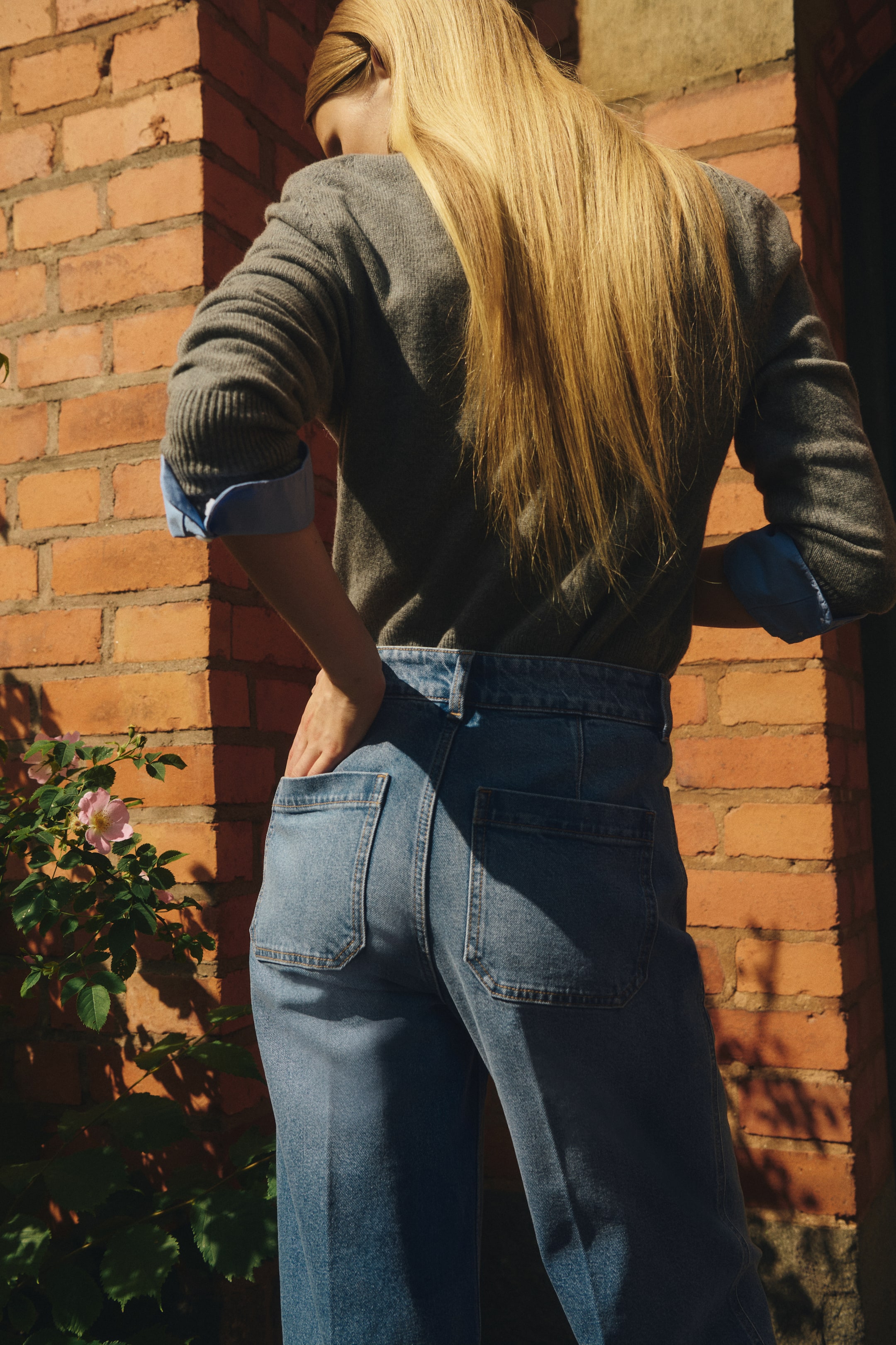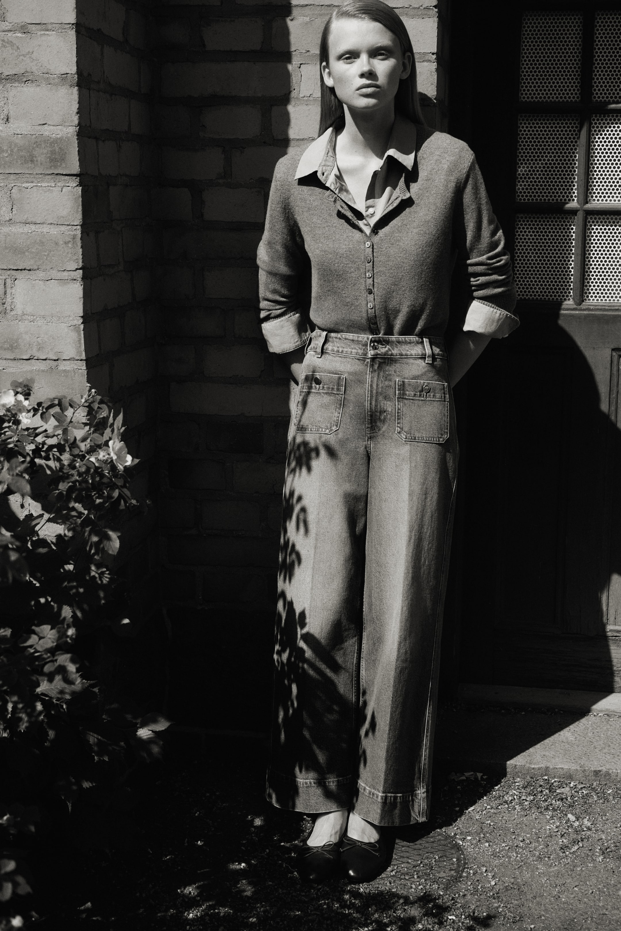 コットンデニムのジーンズ。わずかにストレッチが効いており、快適な着用感。ワイドレッグ。ウエストからヒップにかけてレギュラーフィットで、太ももから裾にかけてはワイドスタイル。ハイウエスト。ボタン&ジップフライ。ボタン留めのフロントポケット付き。オープンタイプのバックポケット付き。フロントに折り目付き。アンクル丈で、裾がくるぶしにかかるようデザインされています。どんなスタイリングでも、さりげなくきれいに見せてくれるデニム。