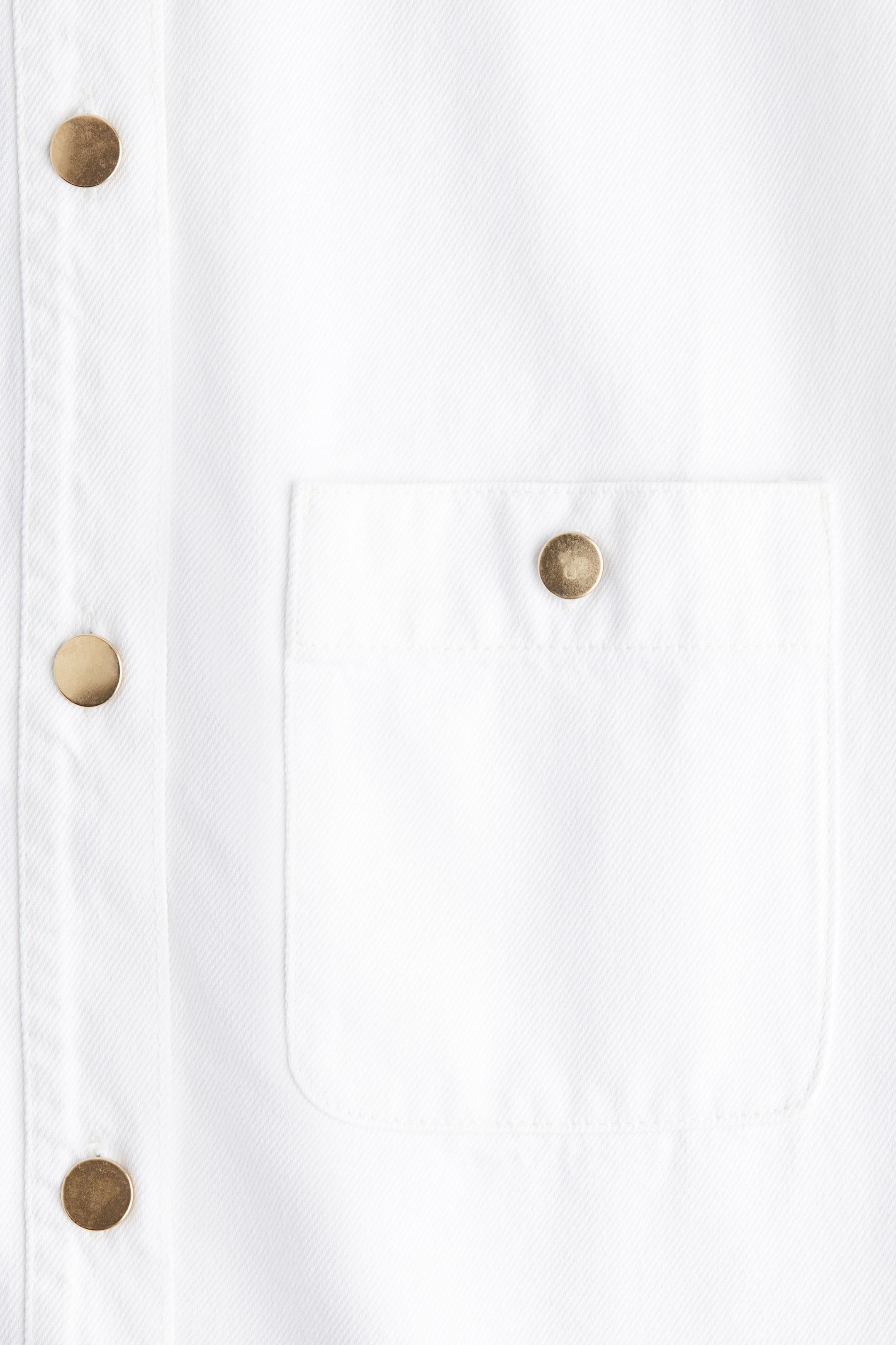 コットンのリジッドデニムを使用したショートワンピース。フィット感のあるスタイル。ノースリーブシルエット。ラウンドネック。フロントをボタンで留めるデザイン。胸元にボタンをあしらった飾りポケットフラップ付き。フロントにボタン留めのフラップポケット付き。