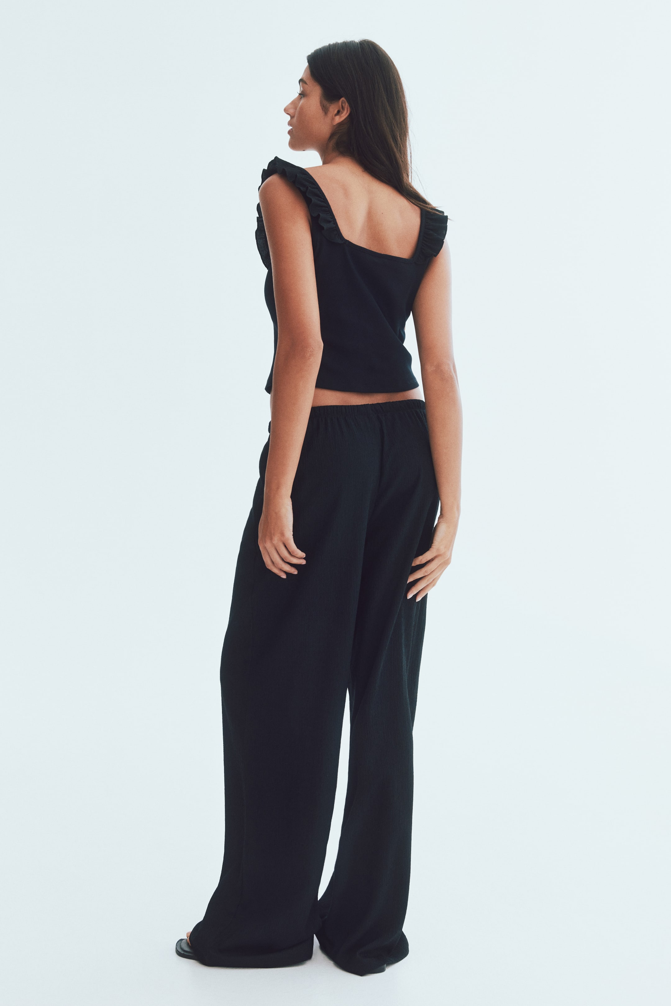 コットンのリブジャージー素材を使用したタンクトップ。ショート丈で、ボディにフィットするスタイル。スクエアネックで、ネックラインからショルダーストラップにかけて、シワ加工を施したフリルトリムをあしらったデザイン。