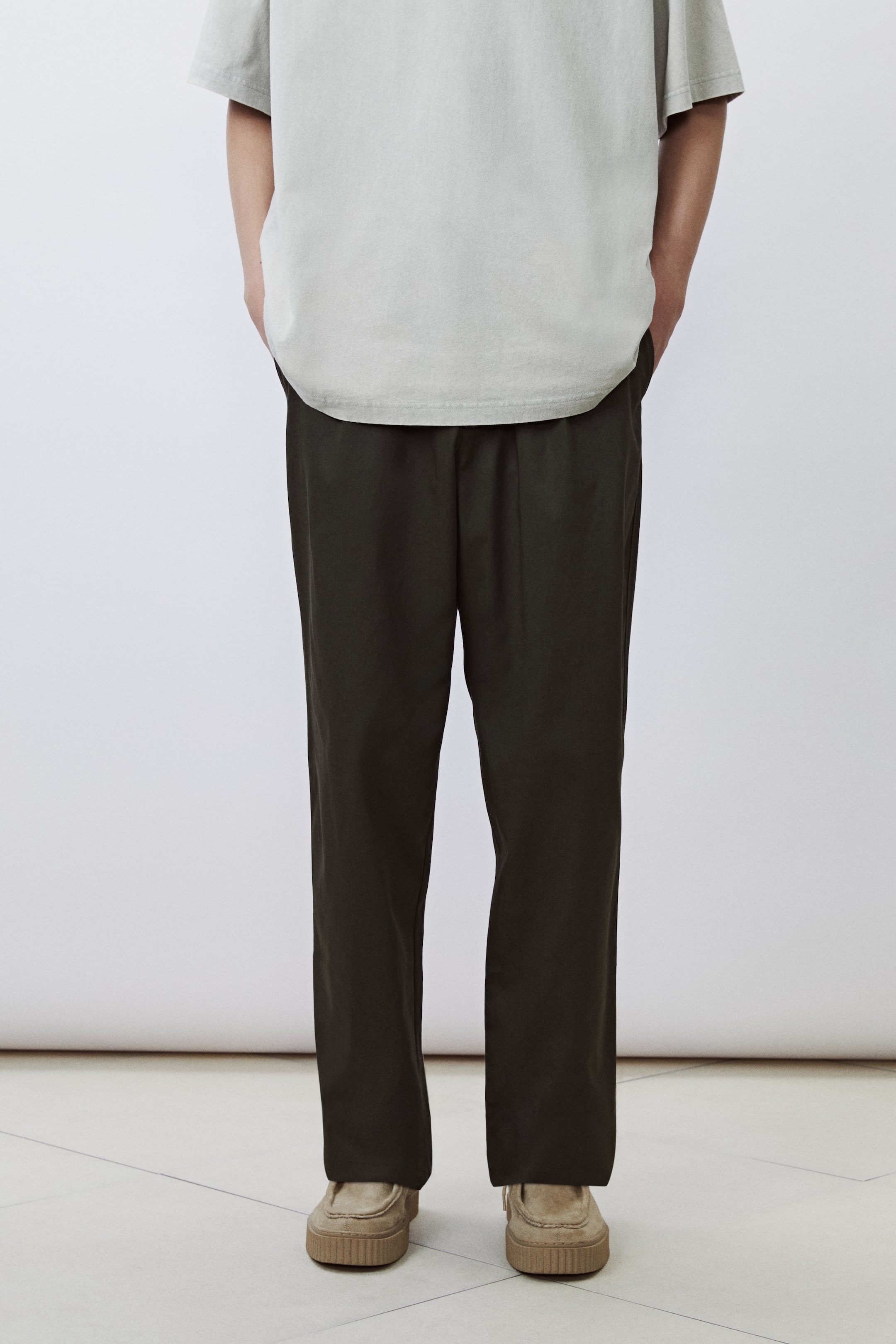 ソフトなコットン織物素材のアンクル丈チノパンツ。バックゴム仕様のウエストバンド付きで、内側にドローストリング入り。ゴム部分は素材でカバーされています。ボタン&ジップフライ。ウエストタック入り。斜めサイドポケット付き。バックにウェルトポケット付き。ルーズフィット。ゆとりがありつつ、オーバーサイズではないシルエット。