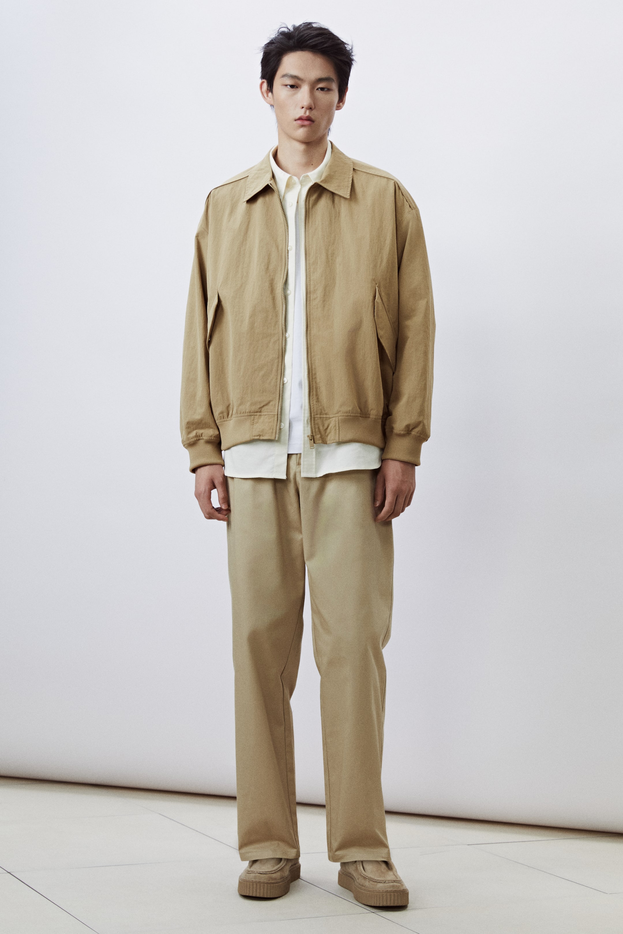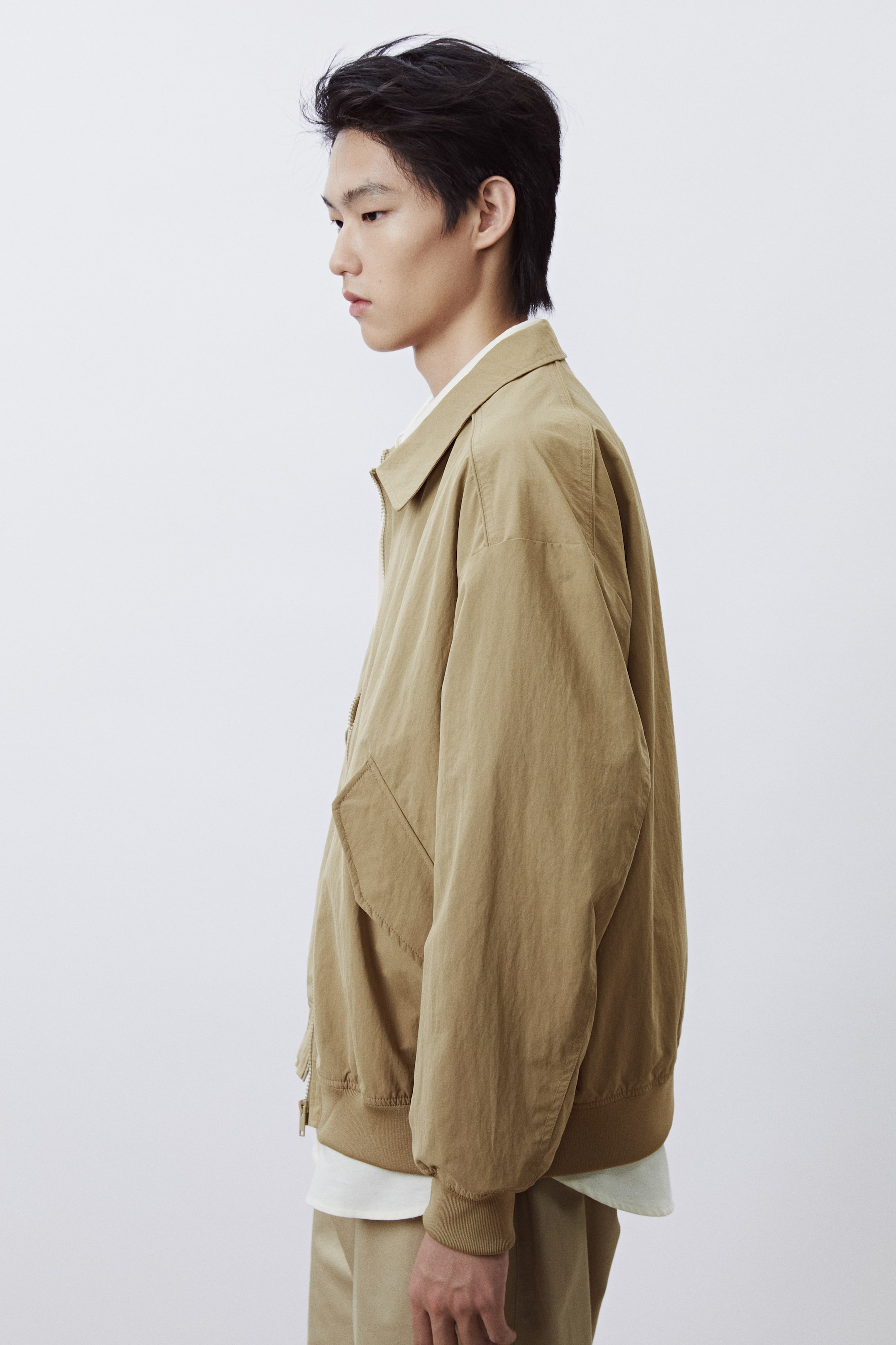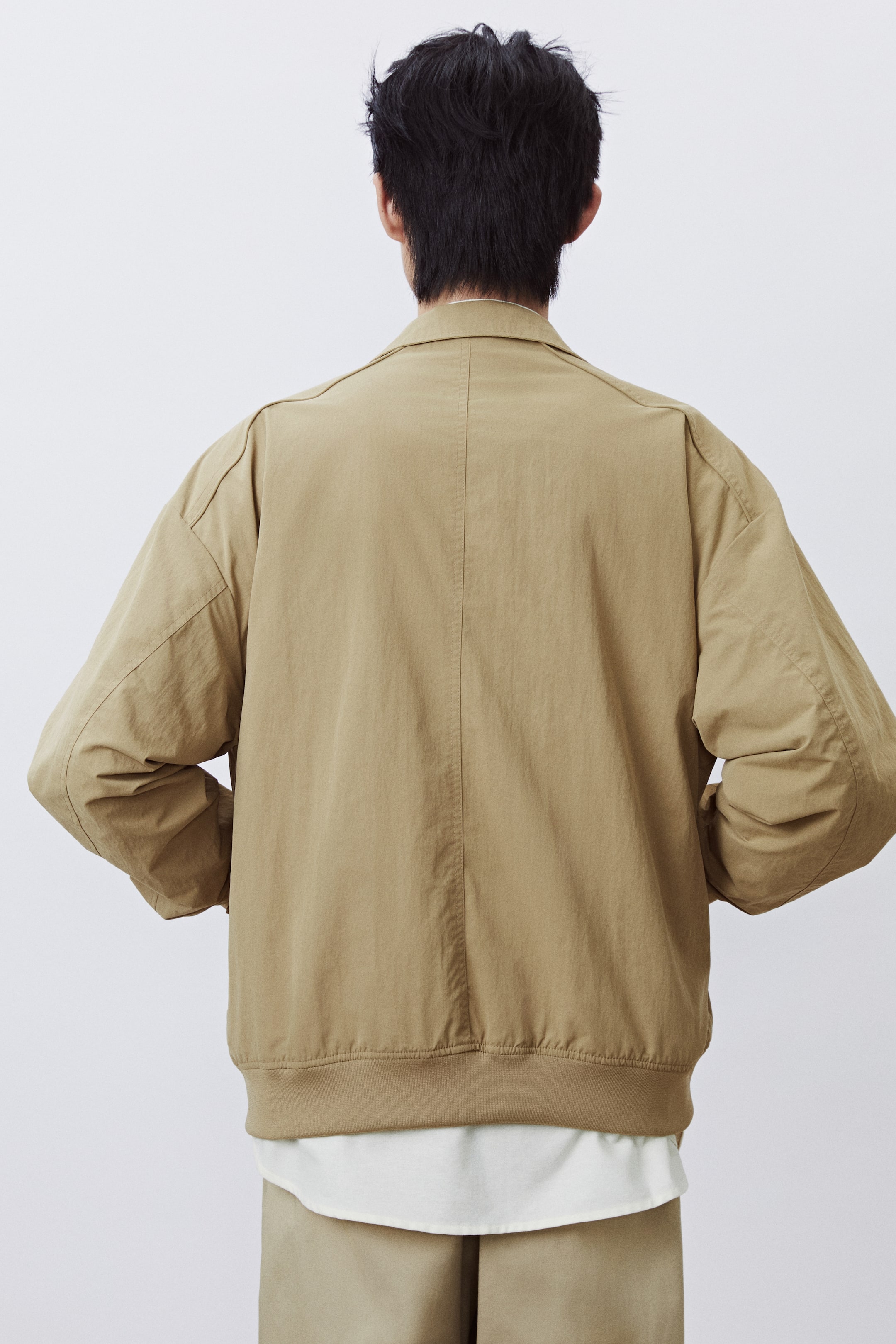 撥水・防風に優れたナイロン素材のコーチジャケット。襟付きで、フロントジップ。ドロップショルダーで、長袖。フラップが付いたサイドポケット浮き。袖口と裾にリブ付き。ルーズフィット。ゆとりがありつつ、オーバーサイズではないシルエット。裏地付き。