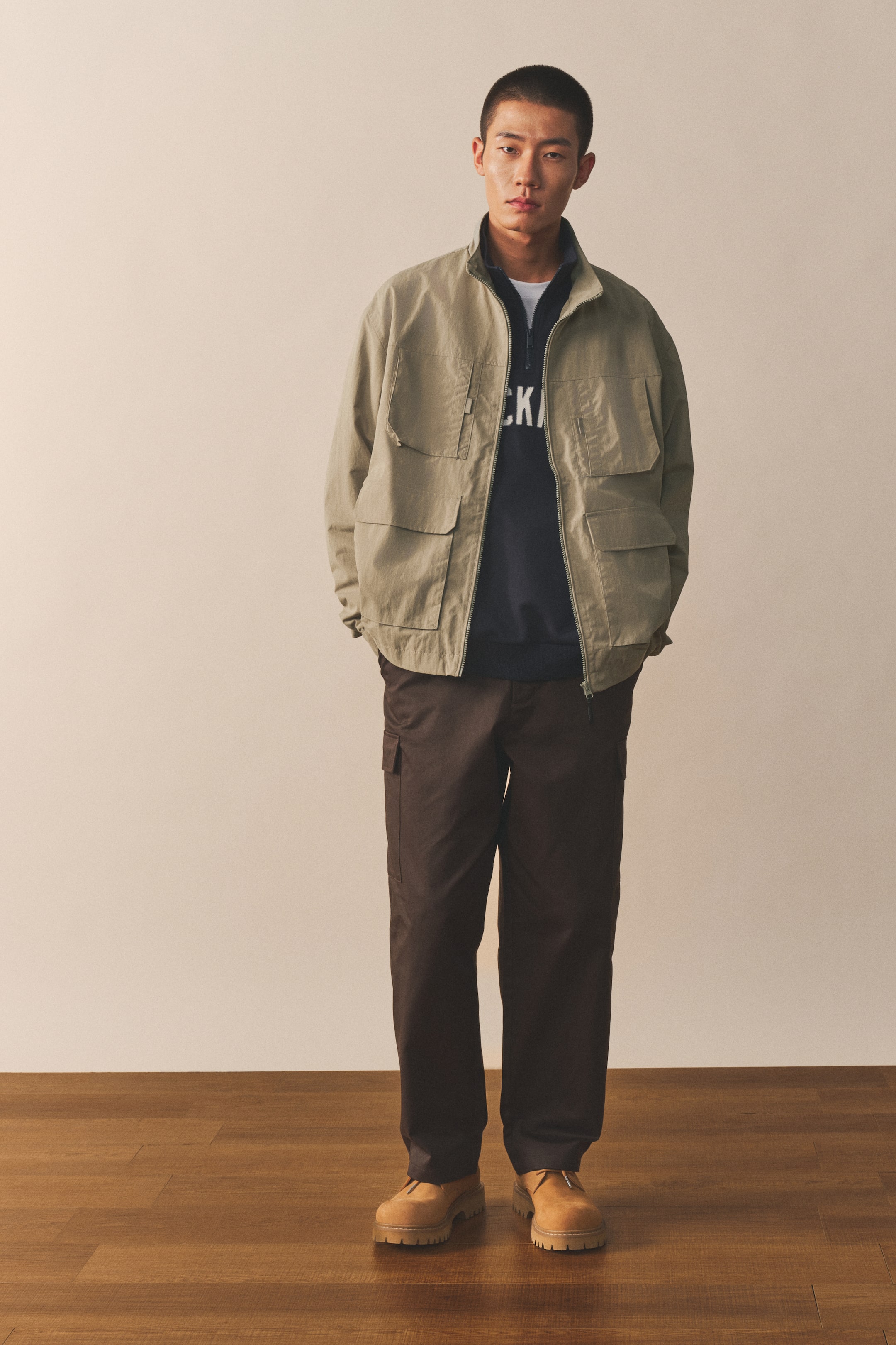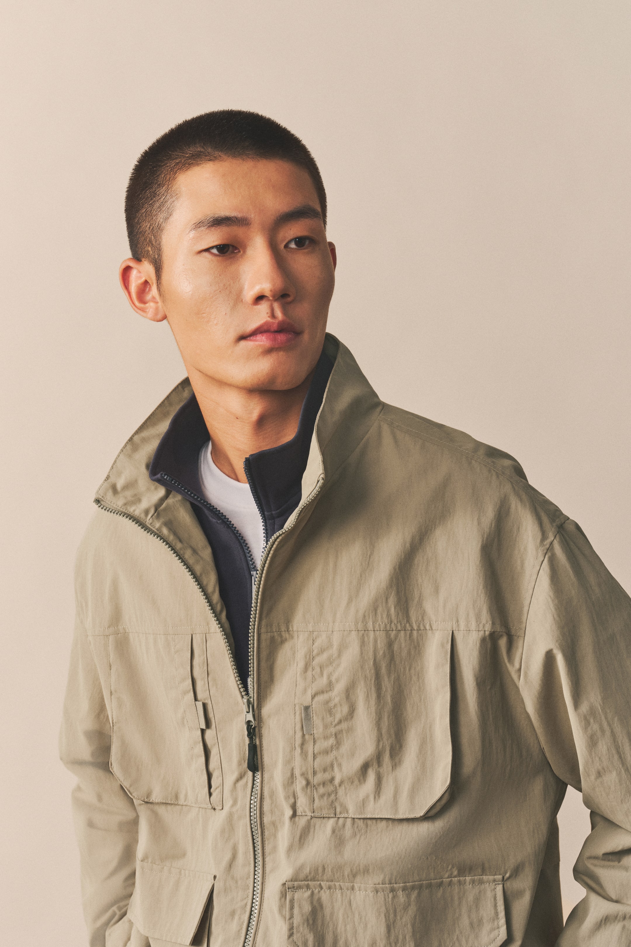 撥水・防風に優れたナイロン素材のジャケット。スタンドカラーで、フロントジップ。フロントにフラップポケット付き。胸ポケットが左右に施されています。袖口周りはスナップボタンで調節可能。裾の内側にゴム入り。ルーズフィット。ゆとりがありつつ、オーバーサイズではないシルエット。