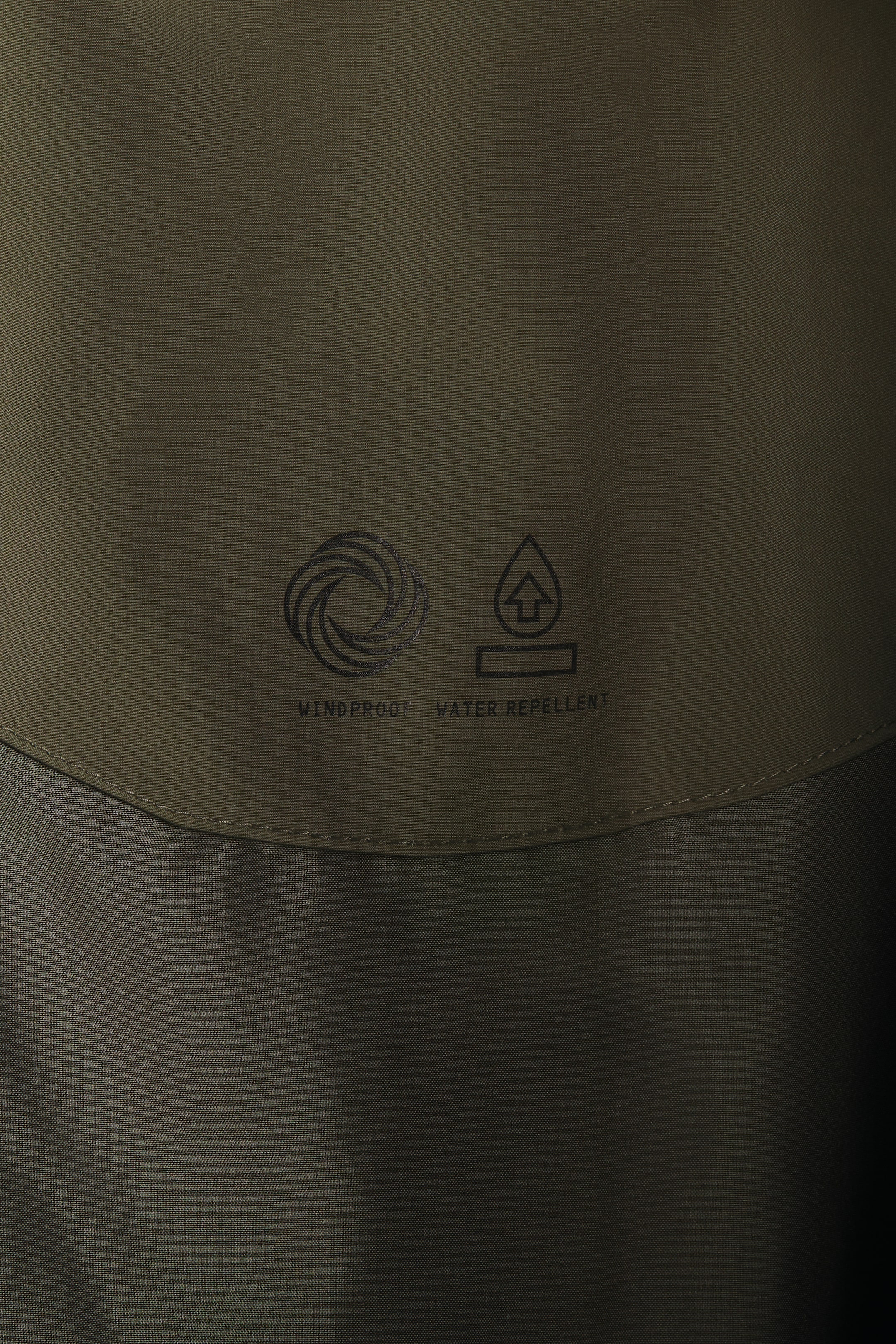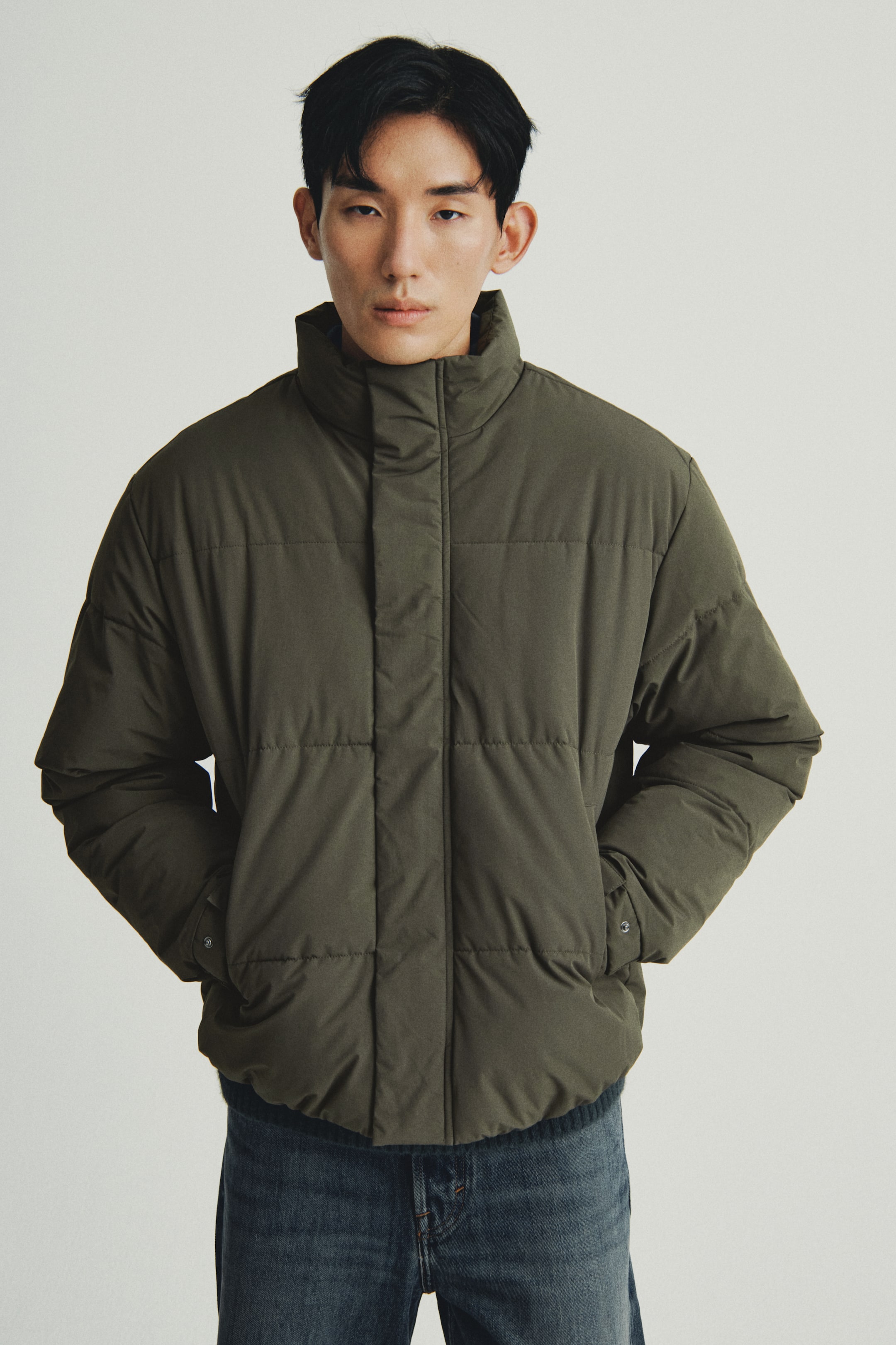中わた入りのキルティングジャケット。表地は撥水・防風に優れた機能性素材。スタンドカラー。フロントジップで、隠しスナップボタン留めの防風フラップも装備。サイドに隠しスナップボタン留めのウェルトポケット付き。ゆるやかなドロップショルダー。袖口はゴム入りで、スナップボタン留めのアジャスタータブ付き。裾の内側にゴム入り。裏地付き。