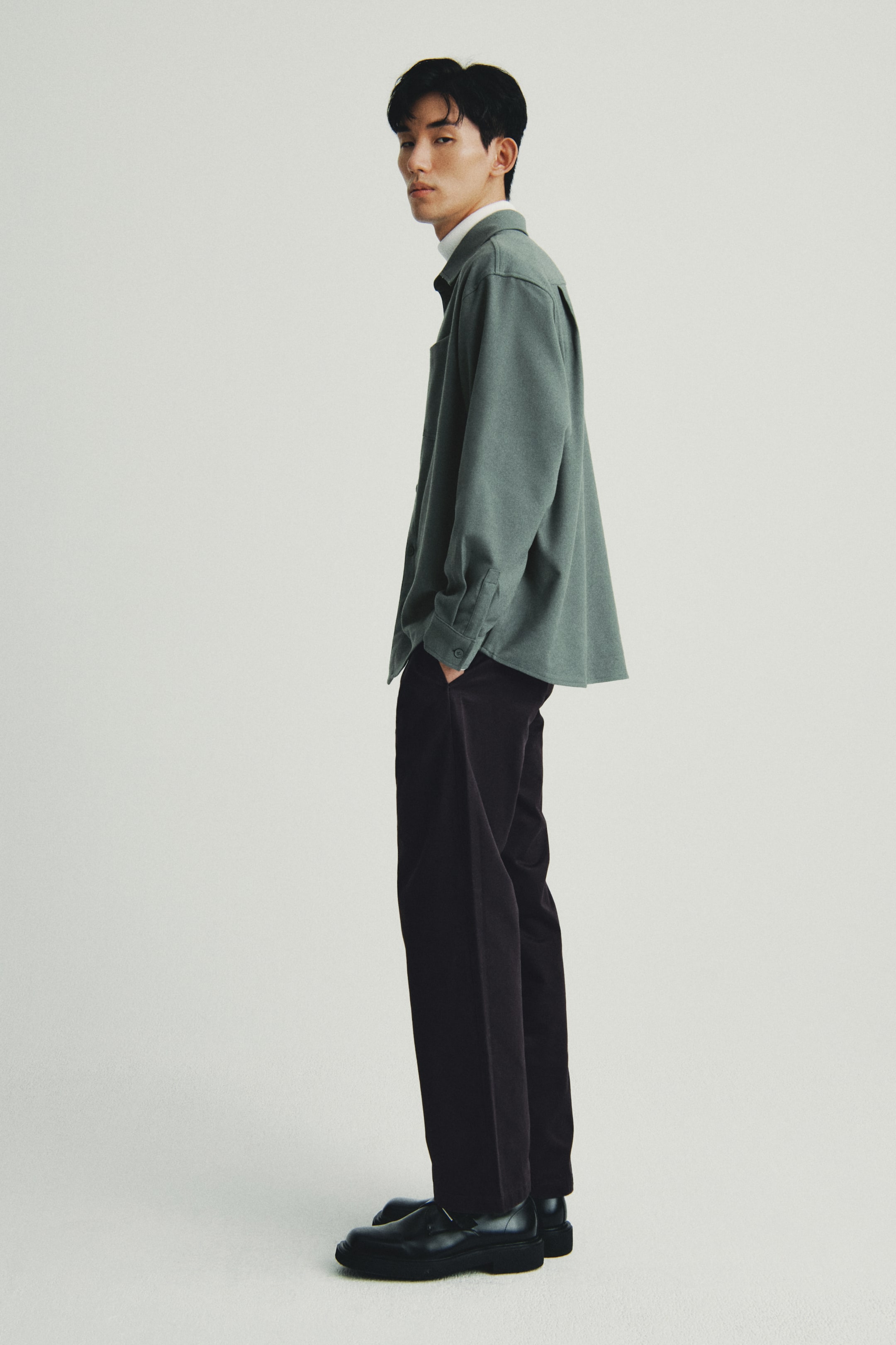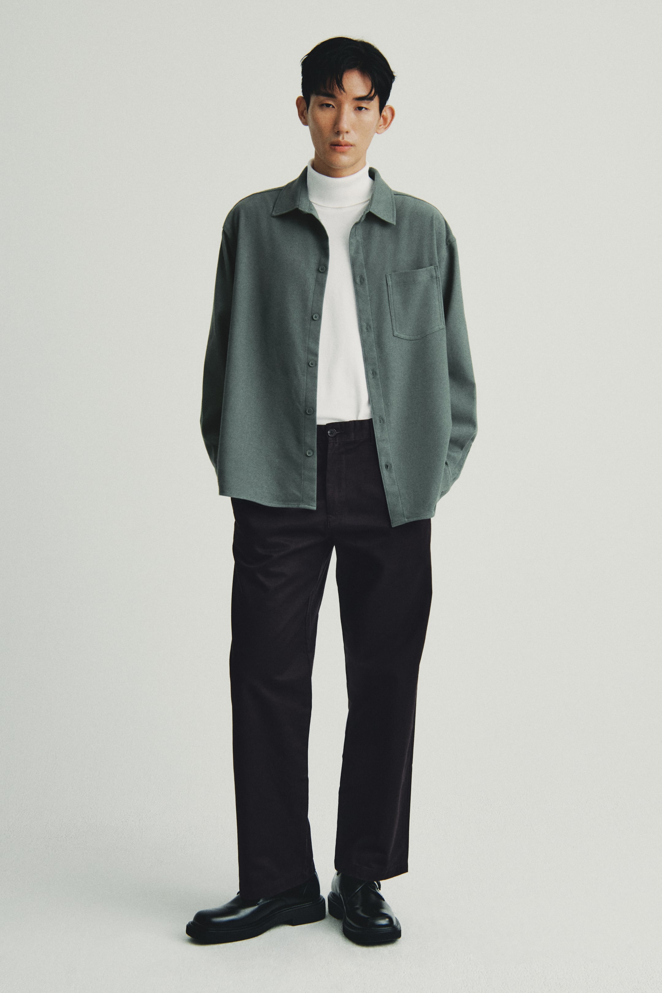 織物素材のオーバーシャツ。ターンダウンカラーで、フロントはクラシカルなデザイン。パッチタイプの片胸ポケット付き。剣ボロが付いた長袖で、ボタン留めのカフス付き。裾はゆるやかなカーブカット。ルーズフィット。ゆとりがありつつ、オーバーサイズではないシルエット。