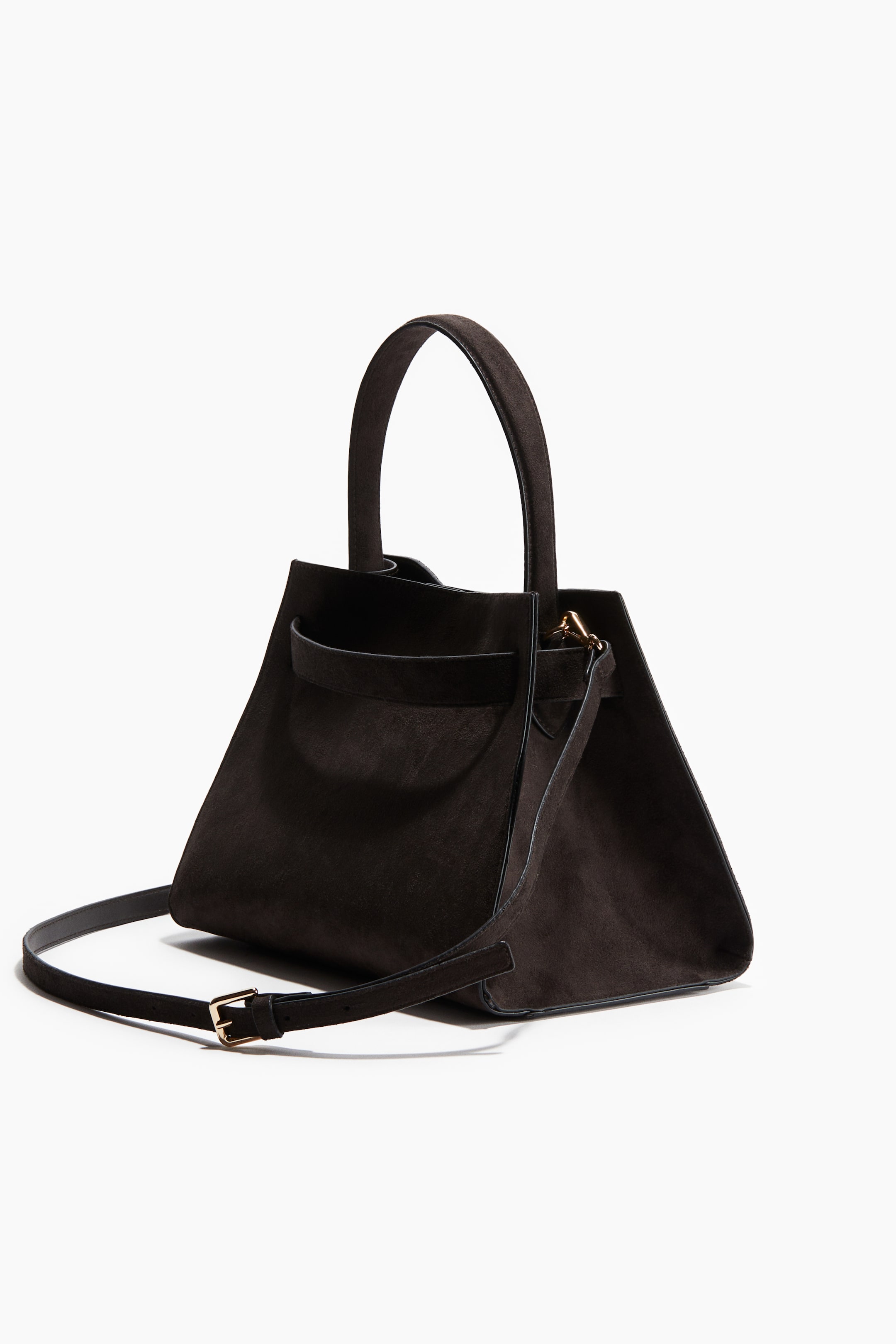 シングルハンドル付きのクロスボディバッグ。トップは隠しマグネットボタン留め。上部にメタルバックルが付いた飾りストラップ付き。ショルダーストラップは長さ調節可能。カラビナフックが付いているので、取り外すこともできます。