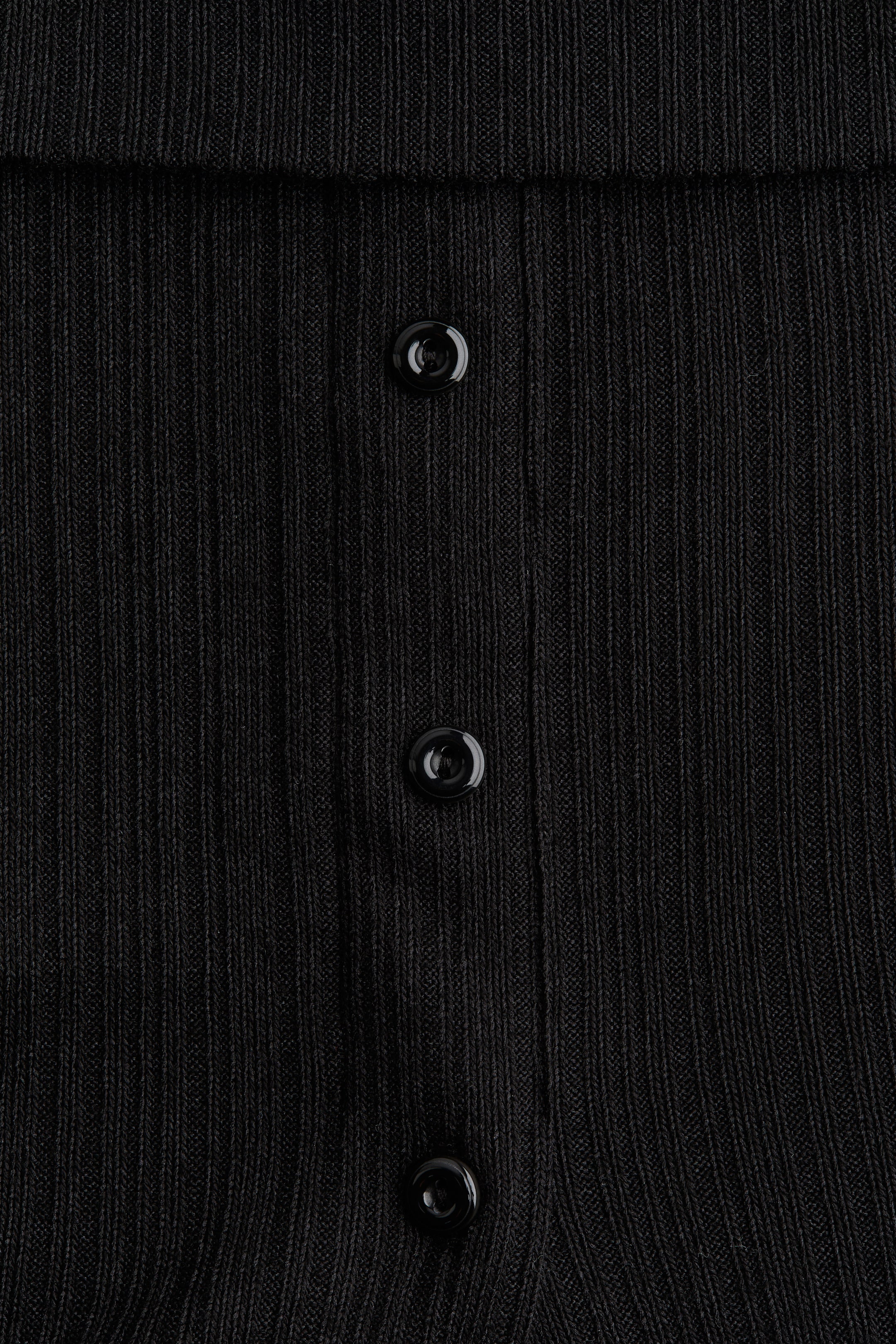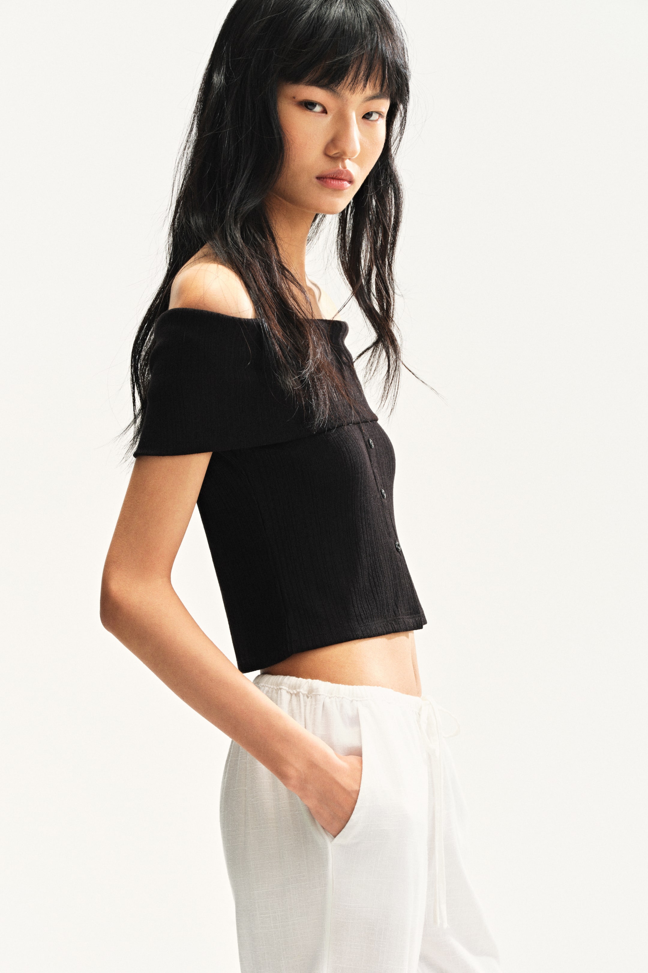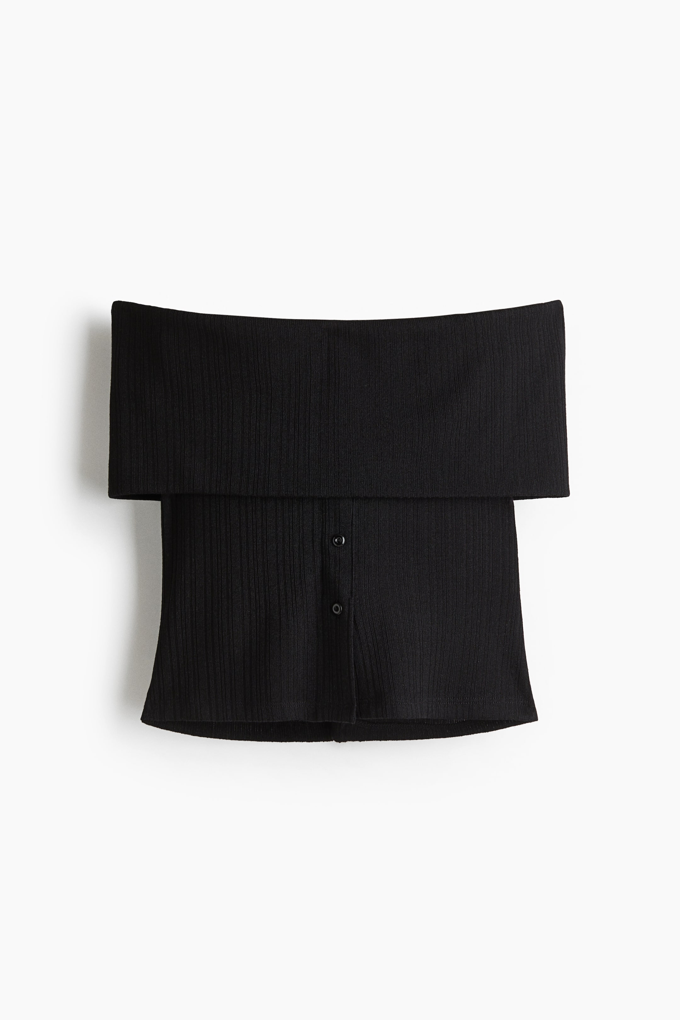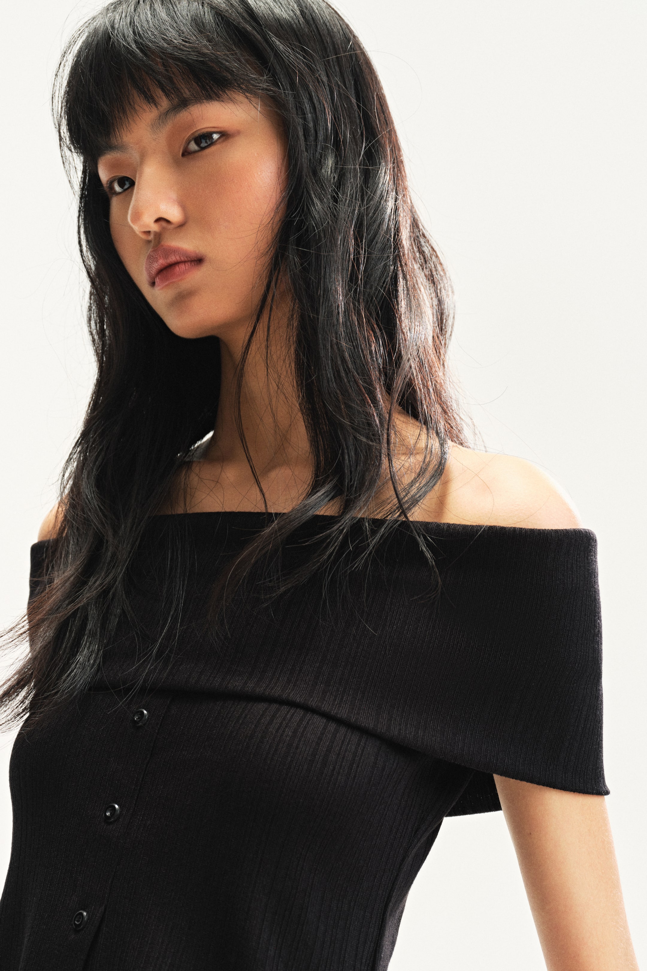 リブジャージー素材で、ボディにフィットする半袖トップス。トップラインを折り返したオフショルダースタイル。フロントに飾りボタン付き。