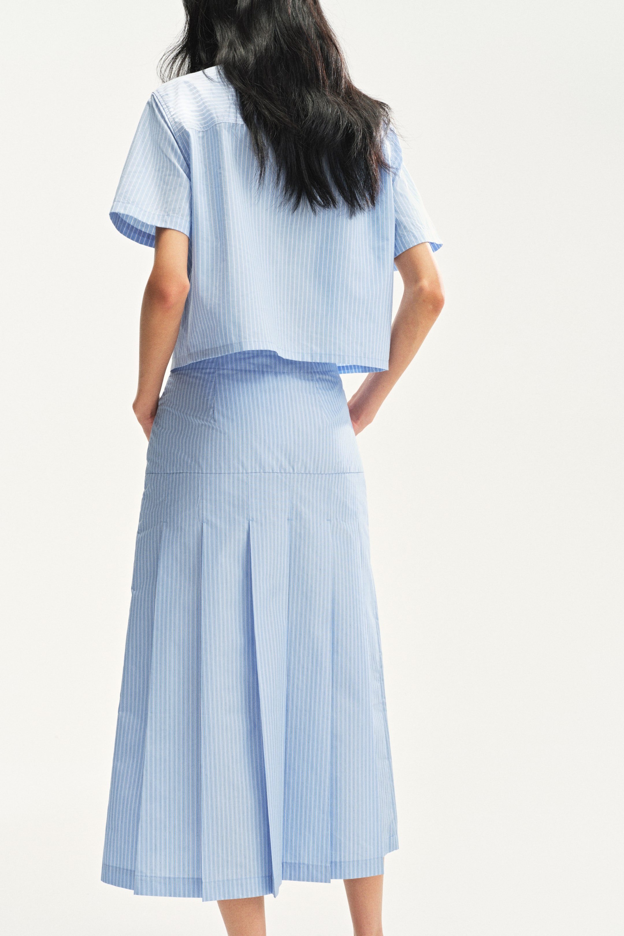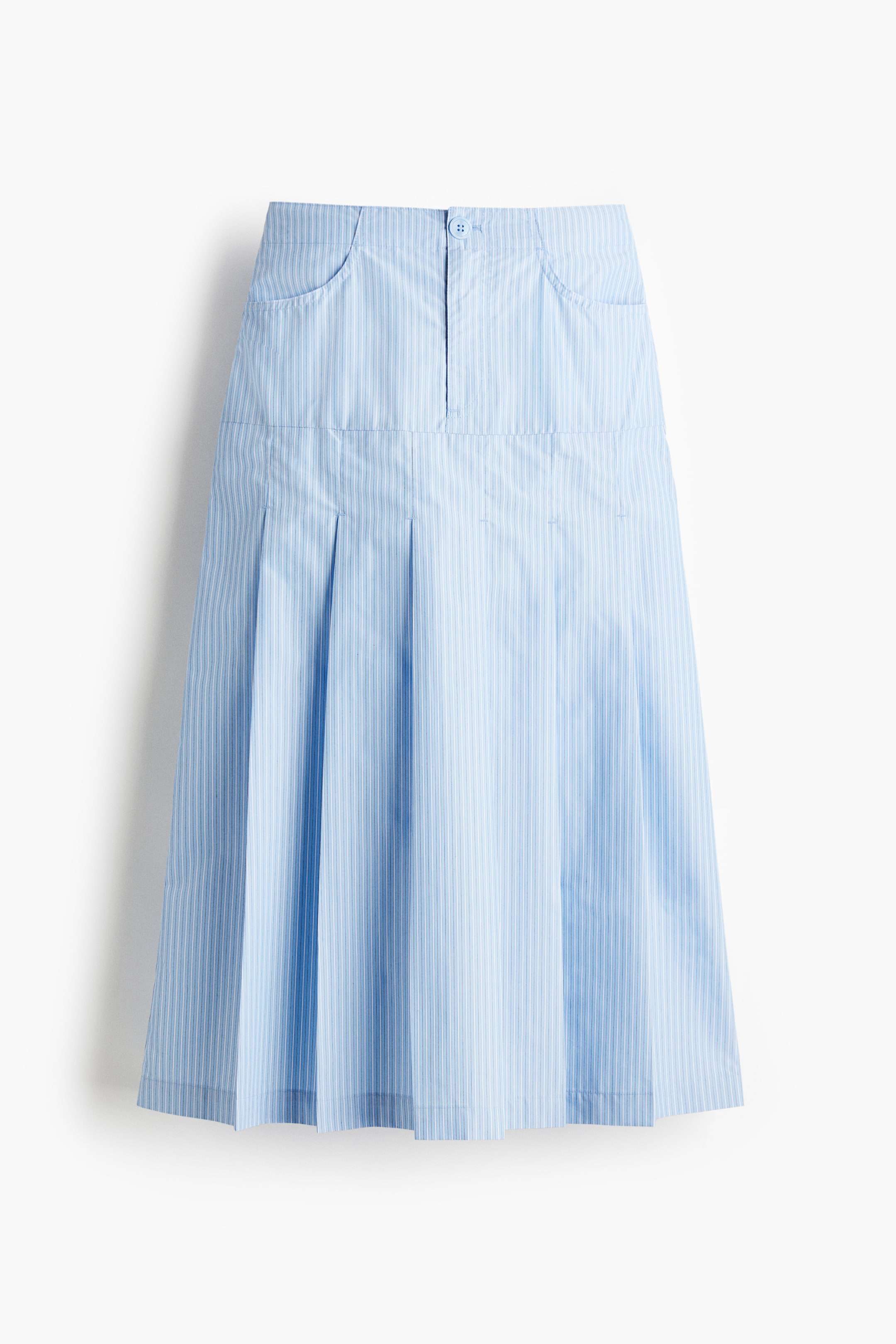 織物素材のミモレ丈フレアスカート。フロントポケット付き。ボタン&ジップフライ。バックにダーツ入り。全体にぐるりと入ったプリーツがボリューム感をアップさせています。裏地なし。