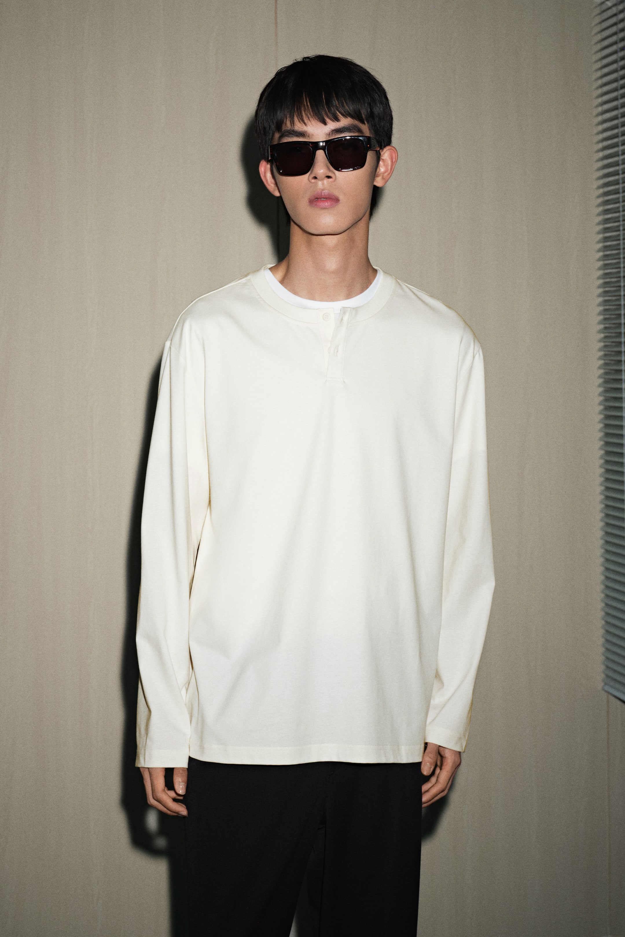 ジャージー素材の長袖トップス。ラウンドネックで、首元にボタン付き。裾はストレートカット。ルーズフィット。ゆとりがありつつ、オーバーサイズではないシルエット。