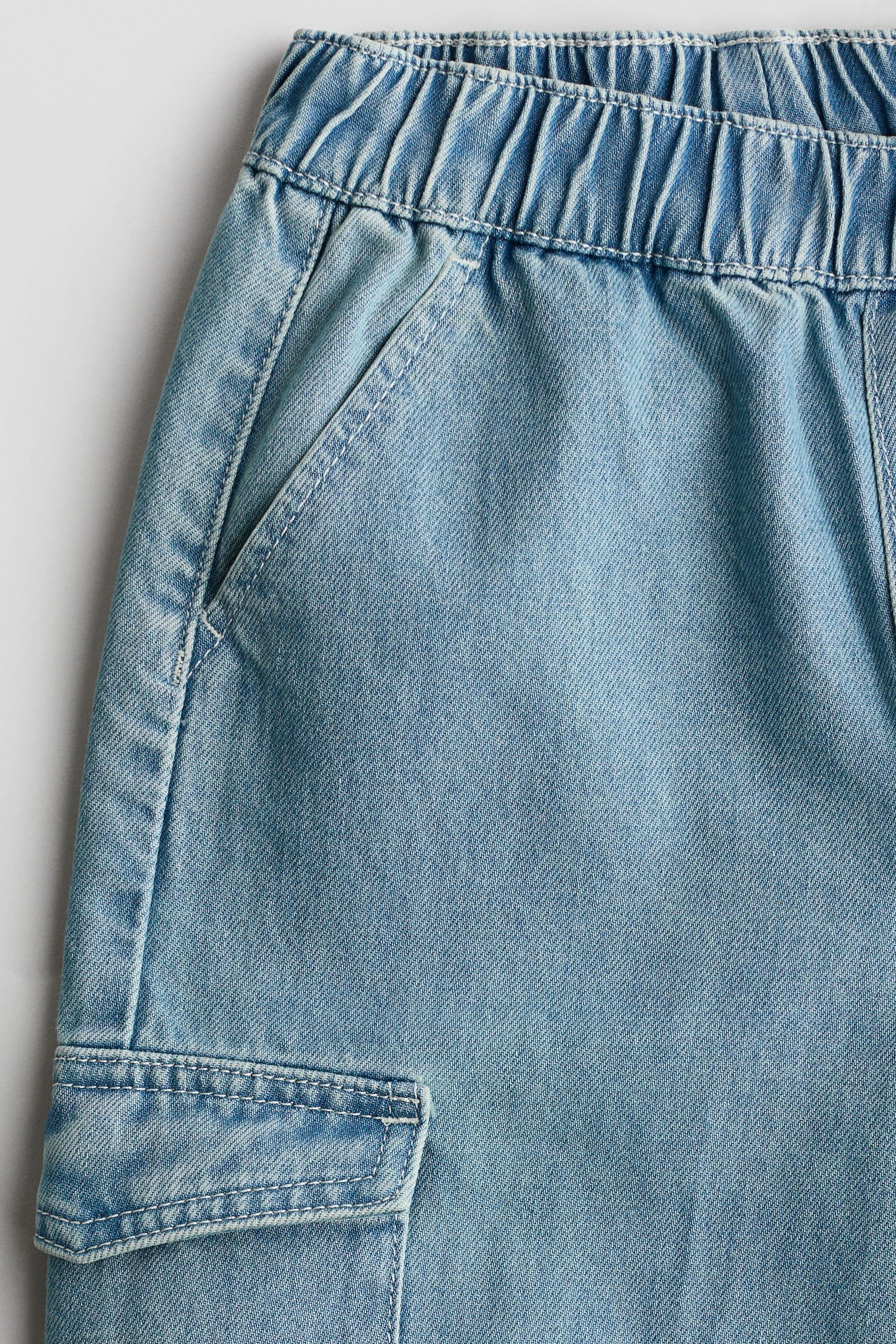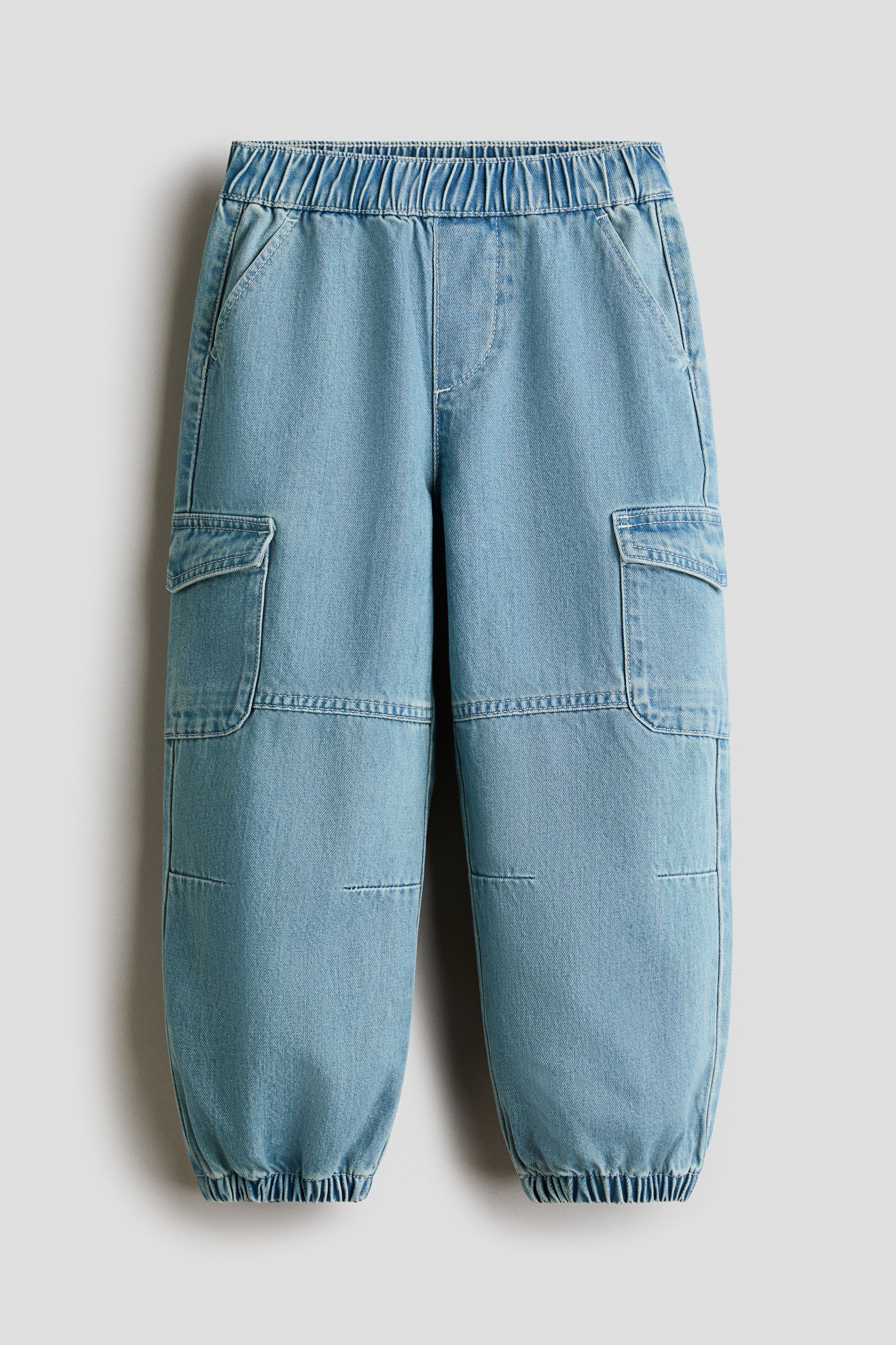 ソフトなコットンデニムのカーゴスタイルジョガーパンツ。ゴムウエストで、前開きはフェイク。斜めフロントポケット付き。レッグ部分にフラップポケット付き。裾の内側にゴム入り。