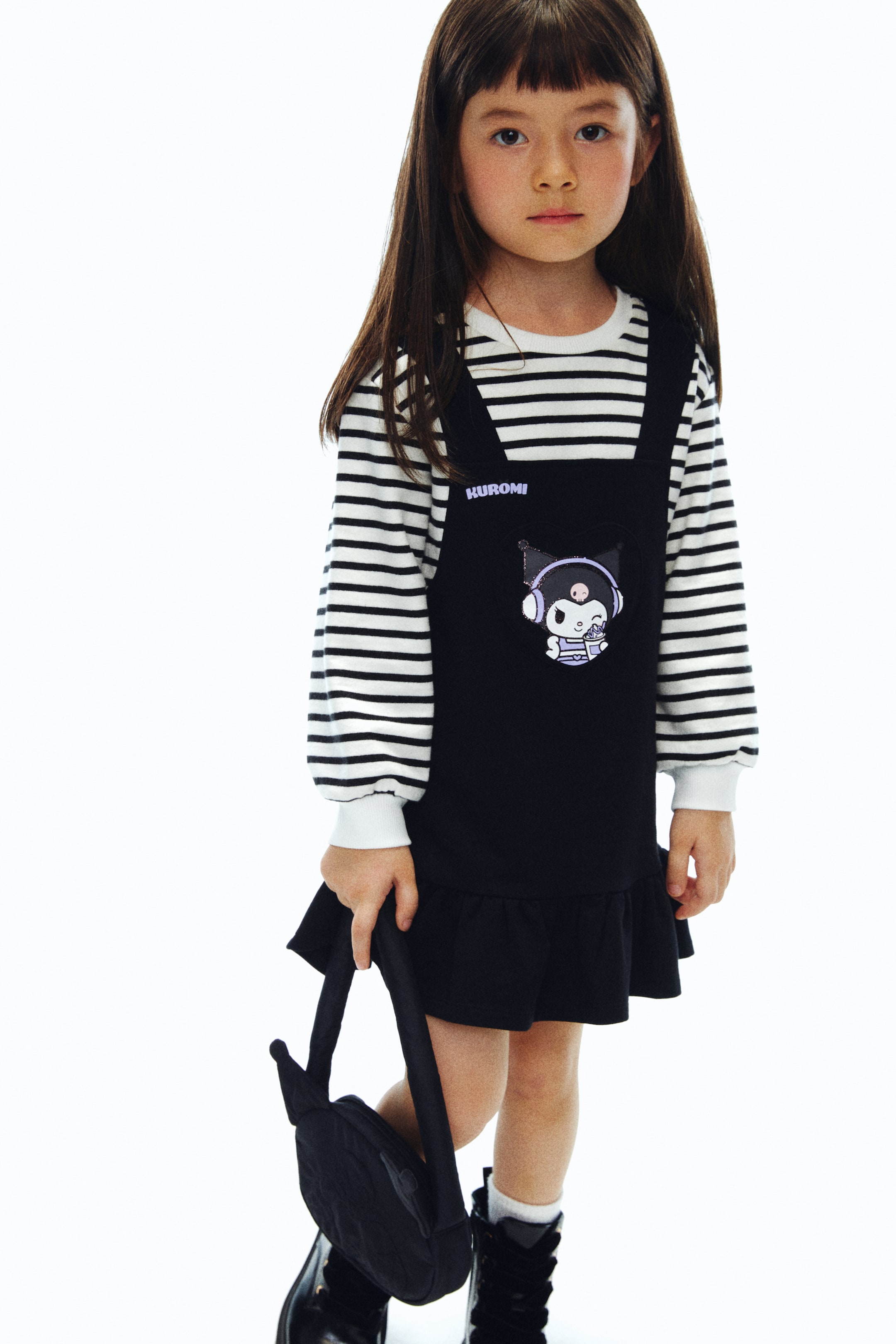 軽量スウェット素材のワンピース。サロペットスカート風のデザインで、フロントにディテールが施されています。ラウンドネックで、ネックラインにリブのトリム付き。ドロップショルダー。長袖で、袖口にリブ付き。裾はギャザーを寄せたフレアフリル仕立て。