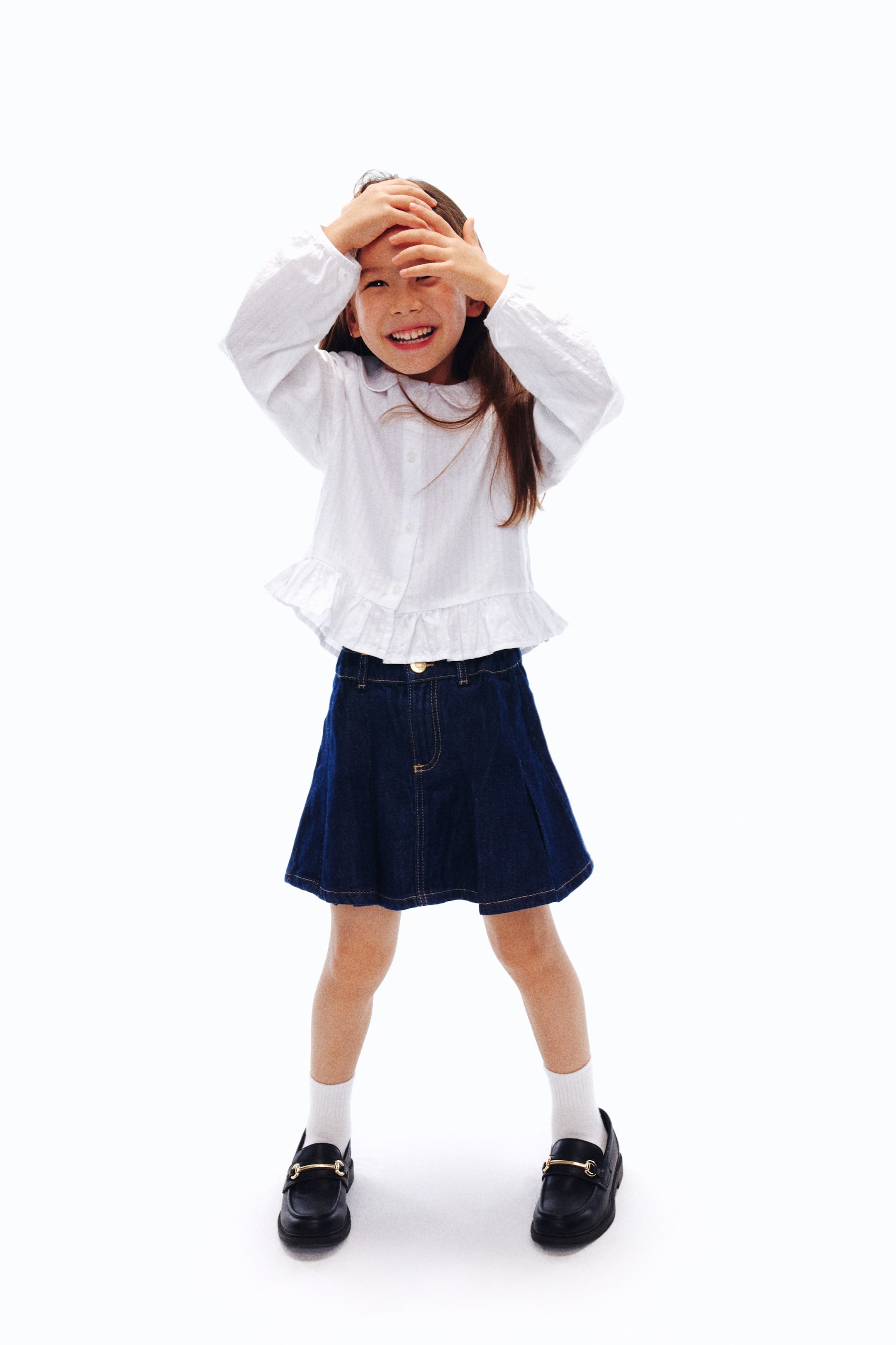 ソフトなコットン織物素材のブラウス。ラウンドカラー。フロントボタン。長袖で、袖口にトリム付き。裾にギャザーを寄せたフリルが施されています。