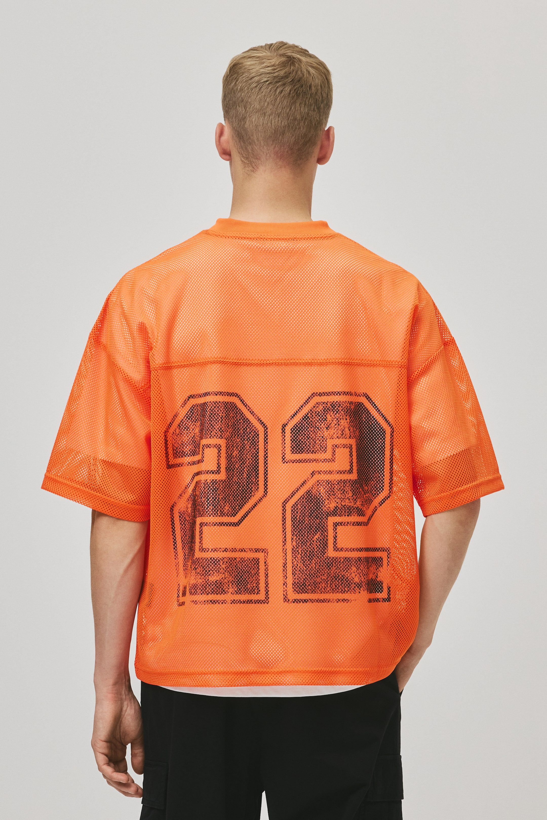 メッシュ素材のVネックTシャツ。プリントをあしらったデザイン。ドロップショルダー。裾はストレートカット。フロントもバックもヨーク付き。オーバーサイズフィット。エクストラルーズなバギーシルエット。