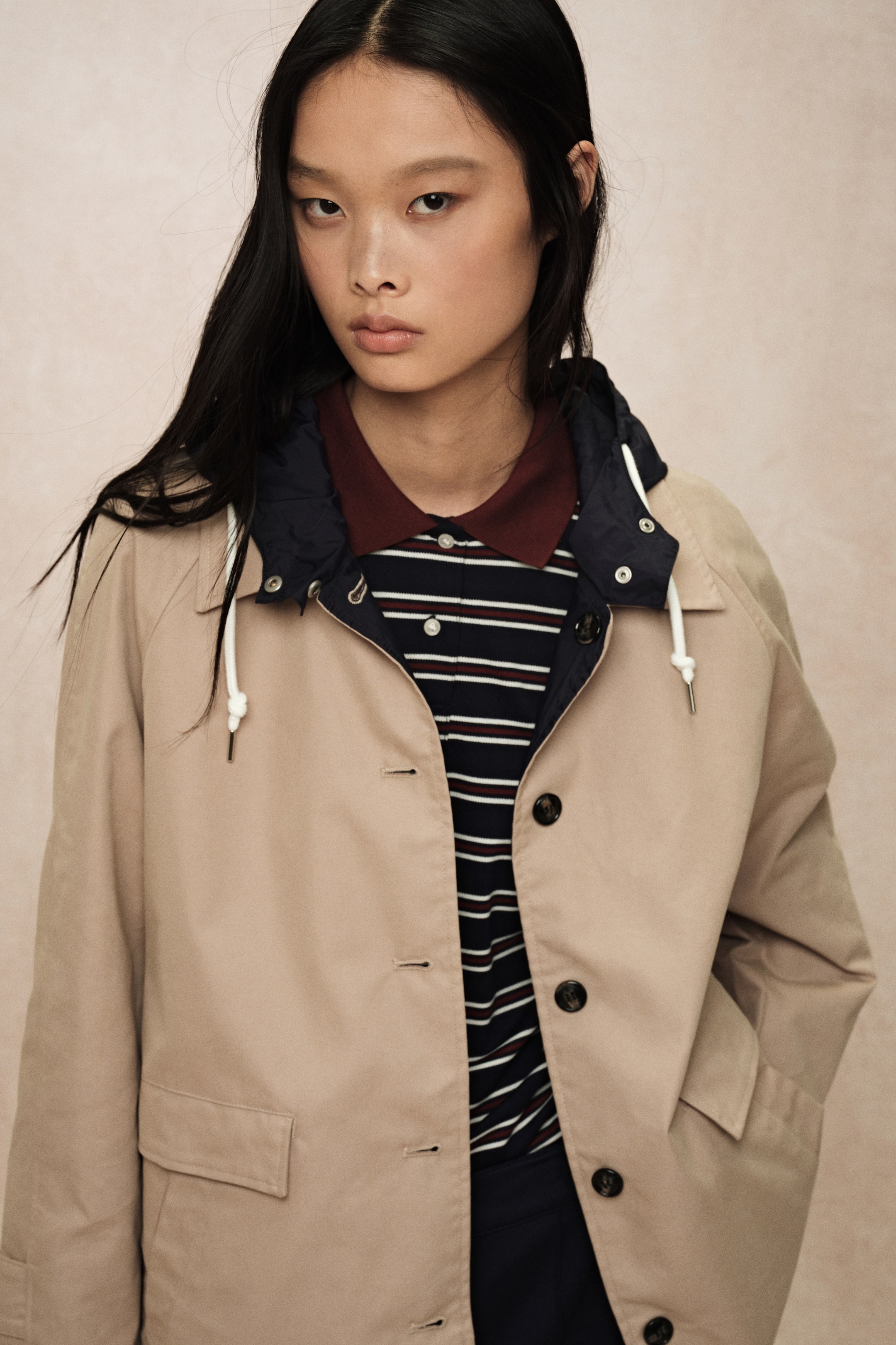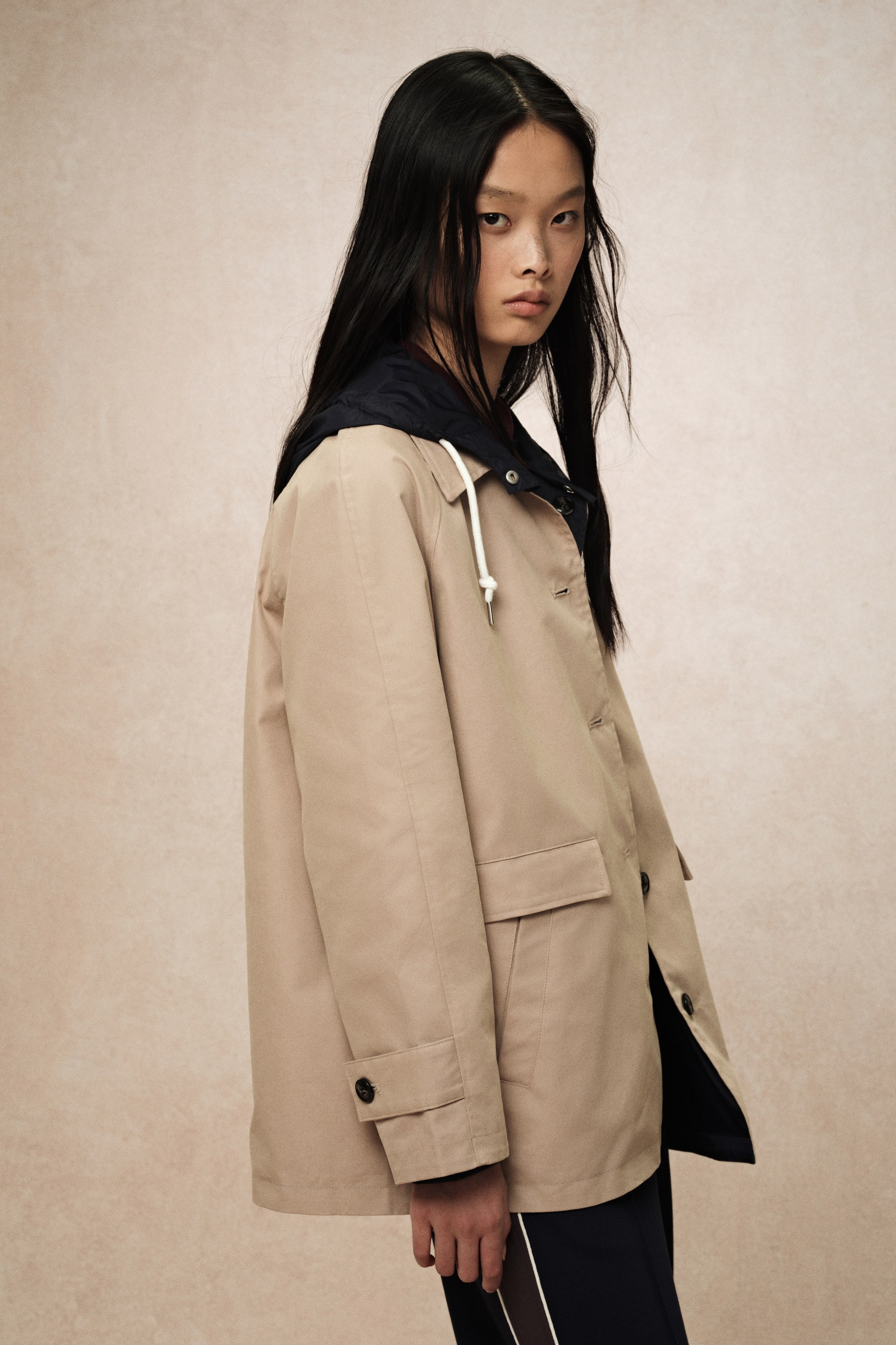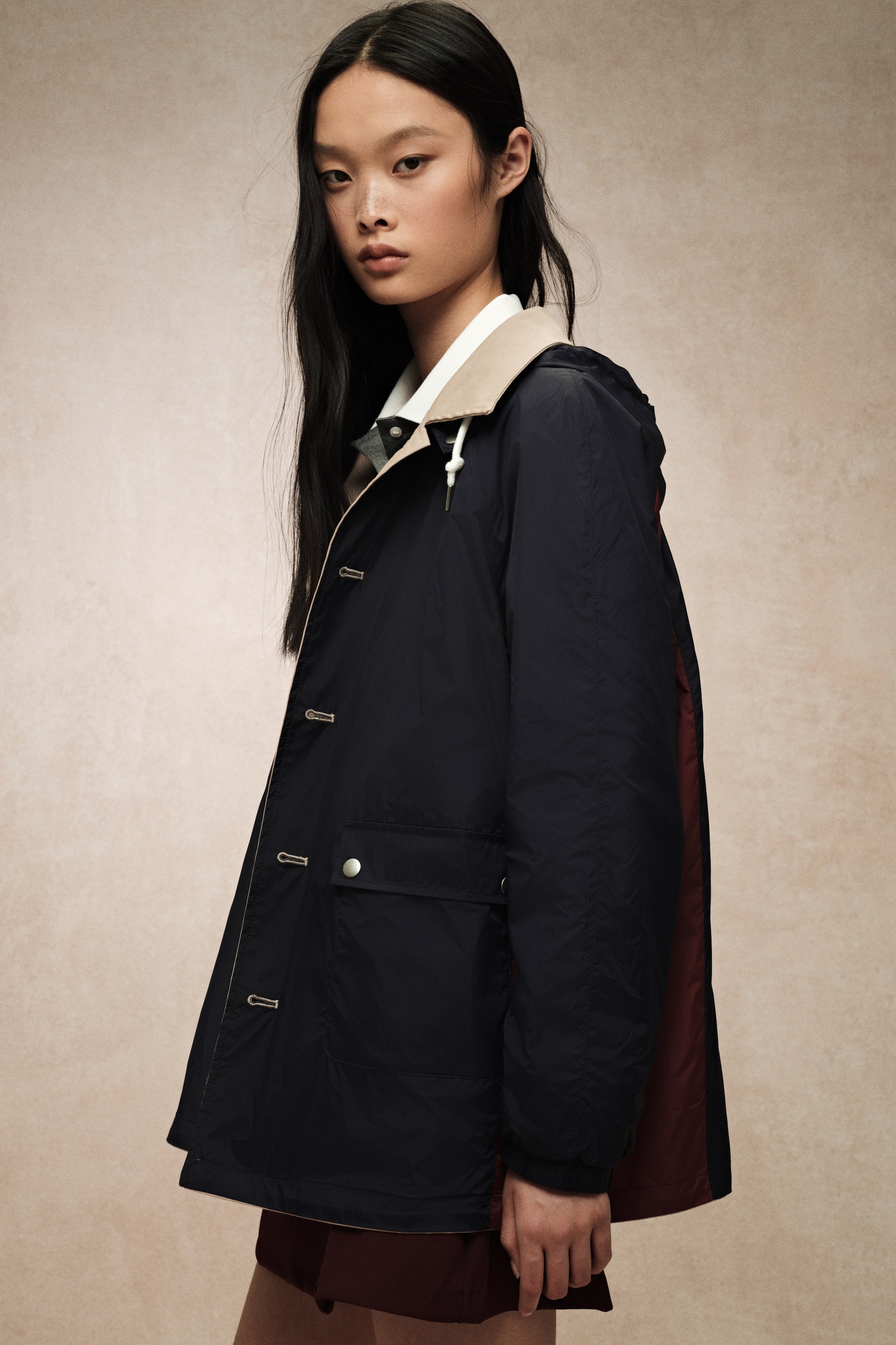 片面にツイル素材、もう片面にナイロン素材を使用したリバーシブルジャケット。首元にスナップボタンが付いたドローストリングフード付き。襟付きで、フロントはボタン留め。長袖のラグランスリーブ。ツイル素材側はフロントにフラップポケット付き。サイドにウェルトポケット付き。袖口にボタン留めのアジャスタータブ付き。ナイロン素材側はフロントにスナップボタン留めのフラップポケット付き。袖口の内側にゴム入り。