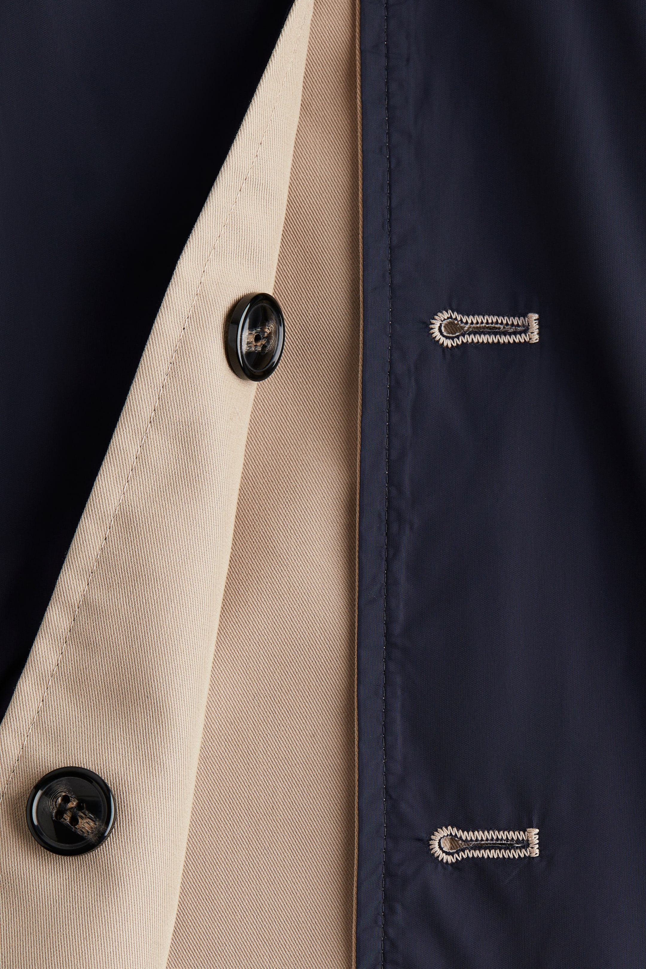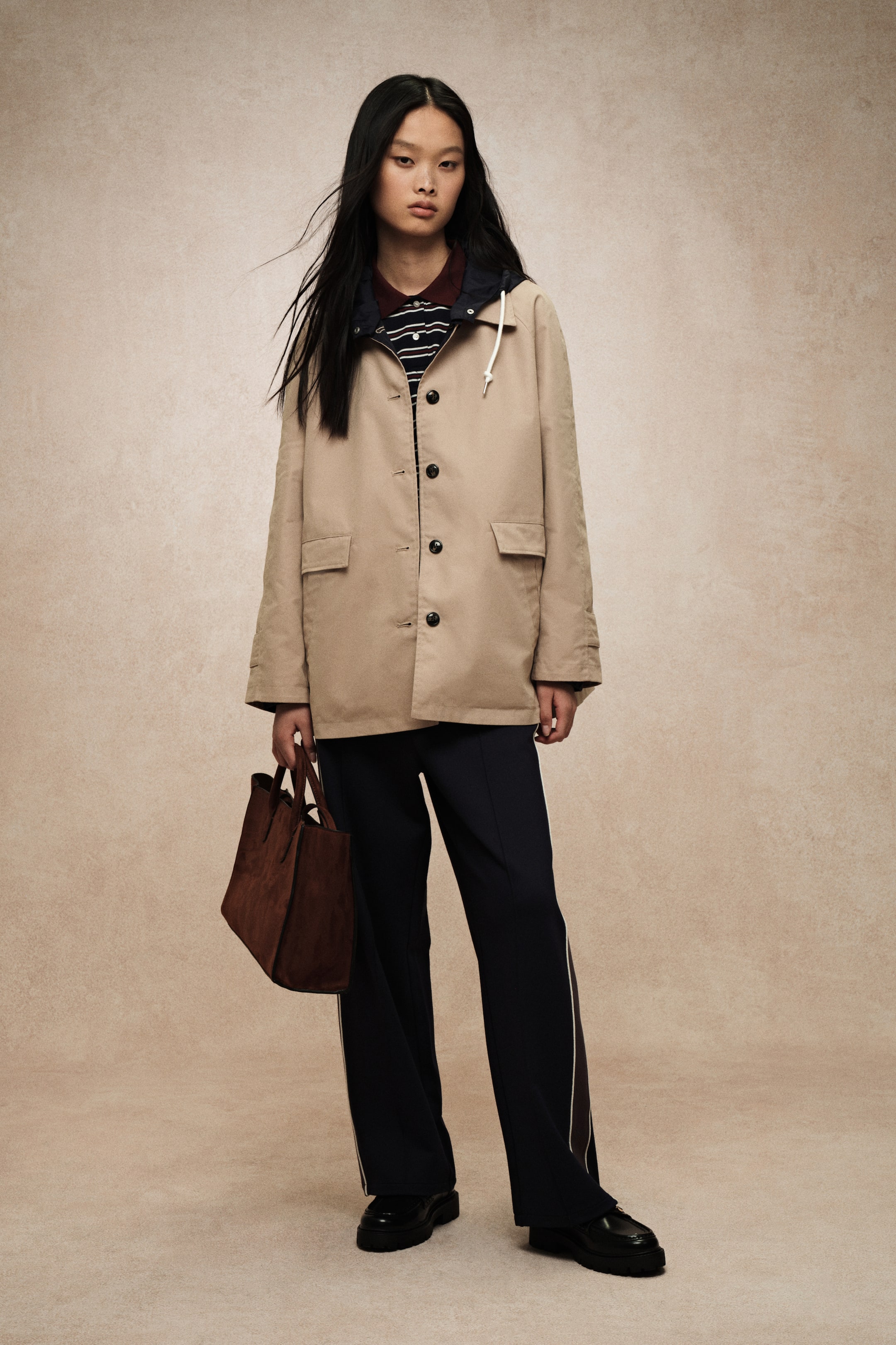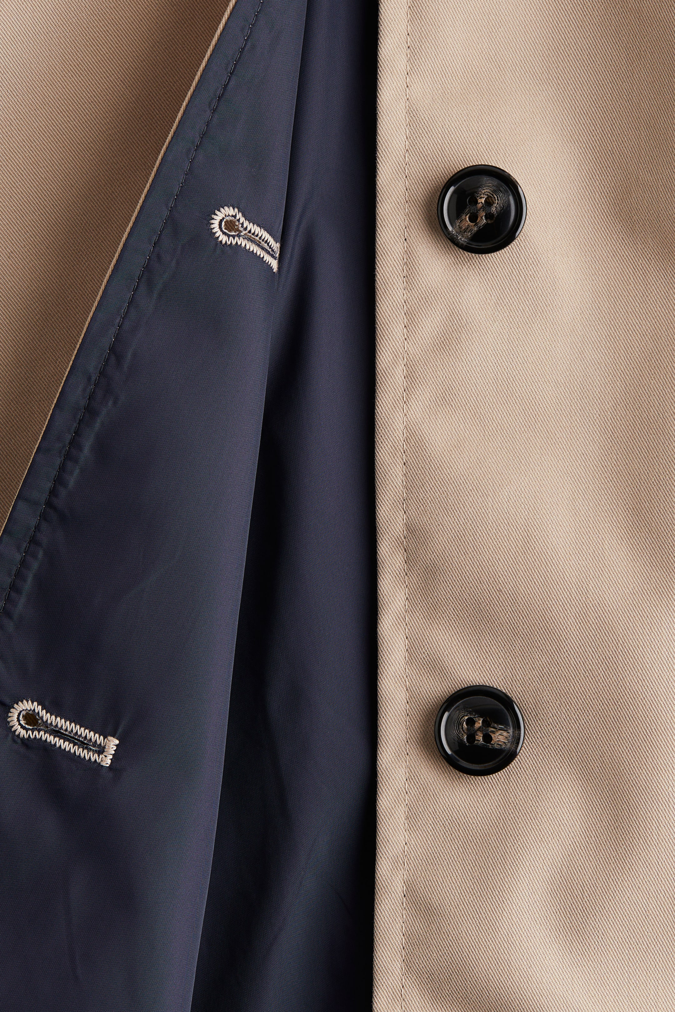片面にツイル素材、もう片面にナイロン素材を使用したリバーシブルジャケット。首元にスナップボタンが付いたドローストリングフード付き。襟付きで、フロントはボタン留め。長袖のラグランスリーブ。ツイル素材側はフロントにフラップポケット付き。サイドにウェルトポケット付き。袖口にボタン留めのアジャスタータブ付き。ナイロン素材側はフロントにスナップボタン留めのフラップポケット付き。袖口の内側にゴム入り。