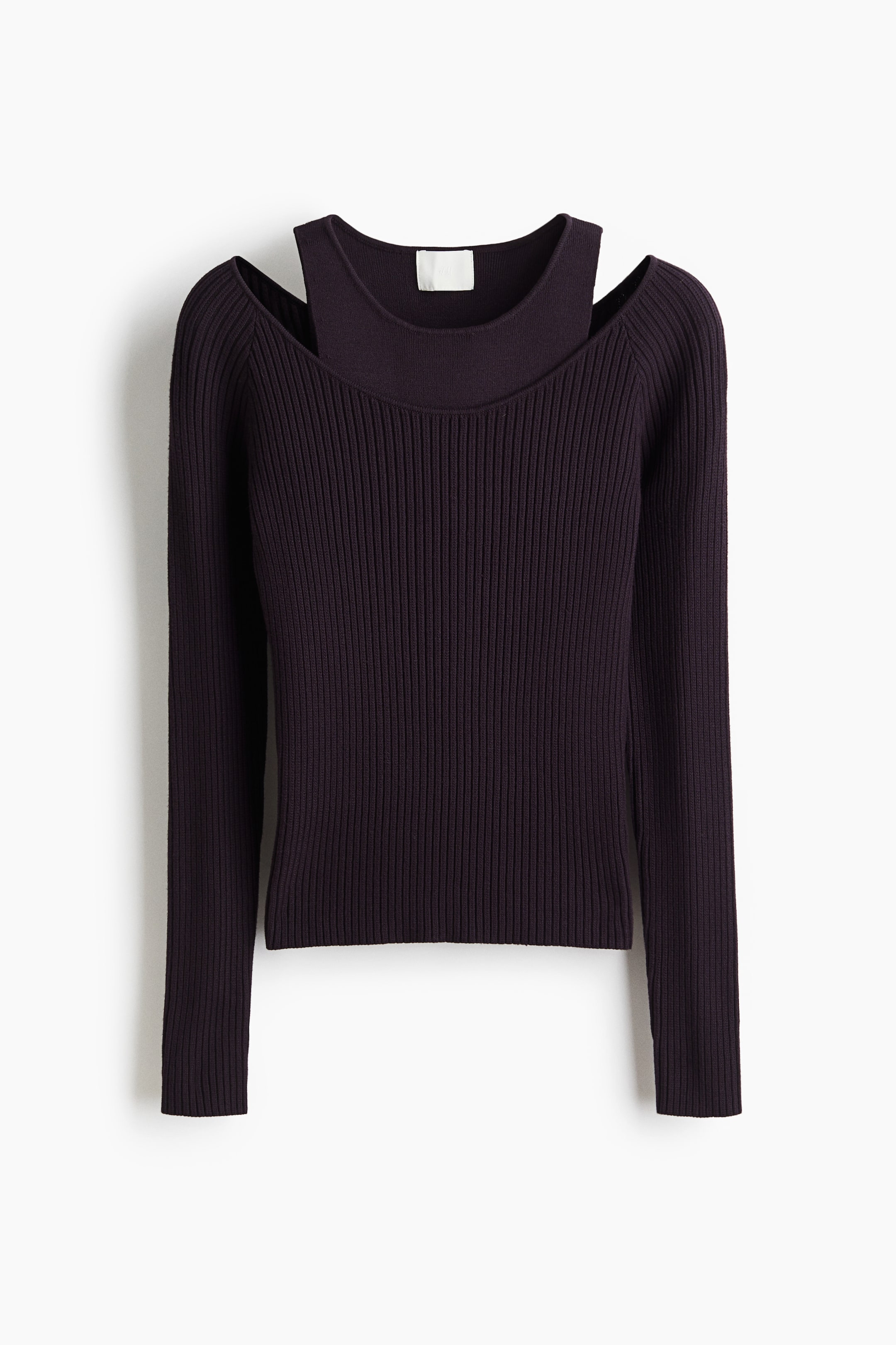 リブニットで、ボディにフィットするトップス。ワイドなネックライン。長袖のラグランスリーブ。ファインニットのタックトップを下に重ねたスタイル。