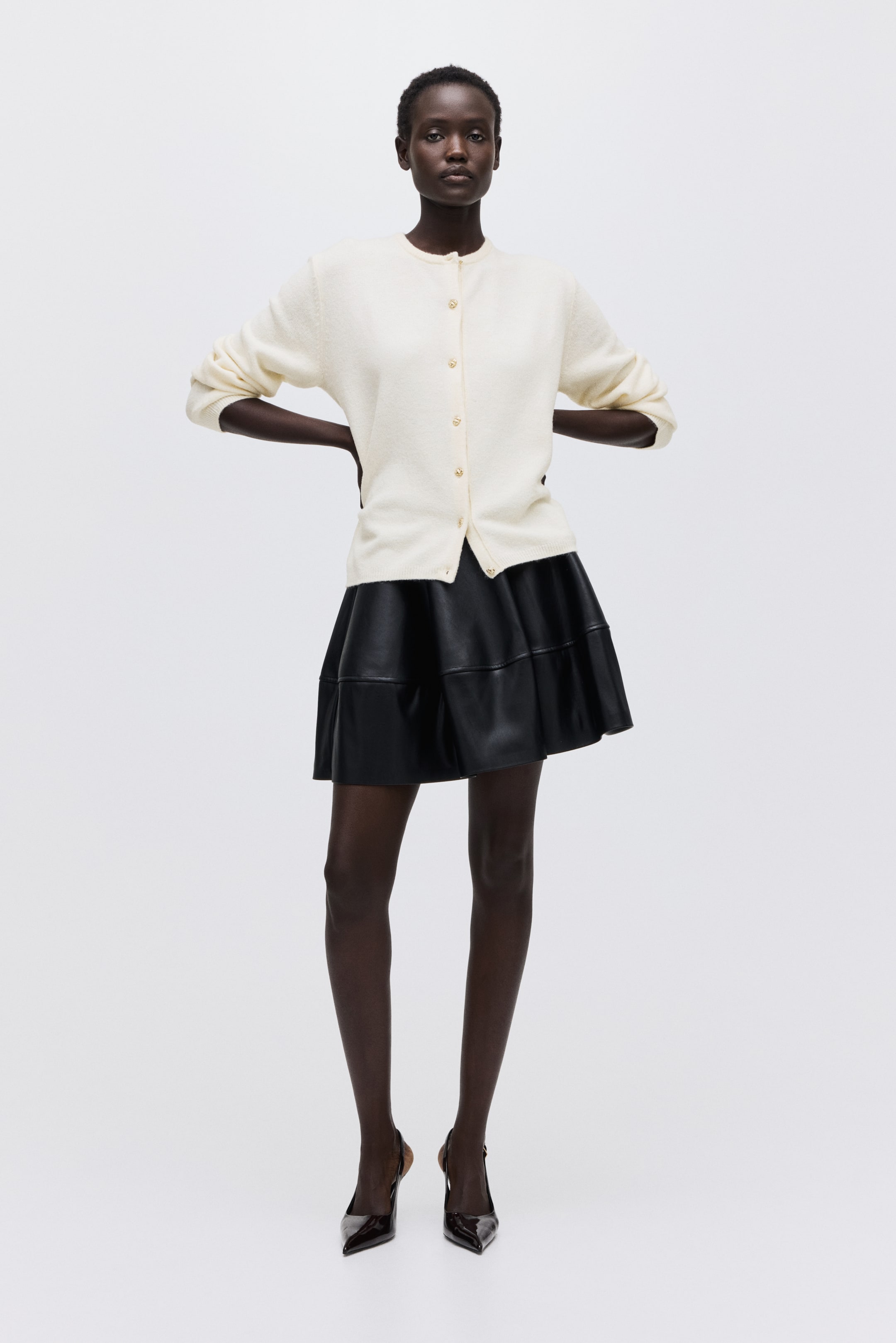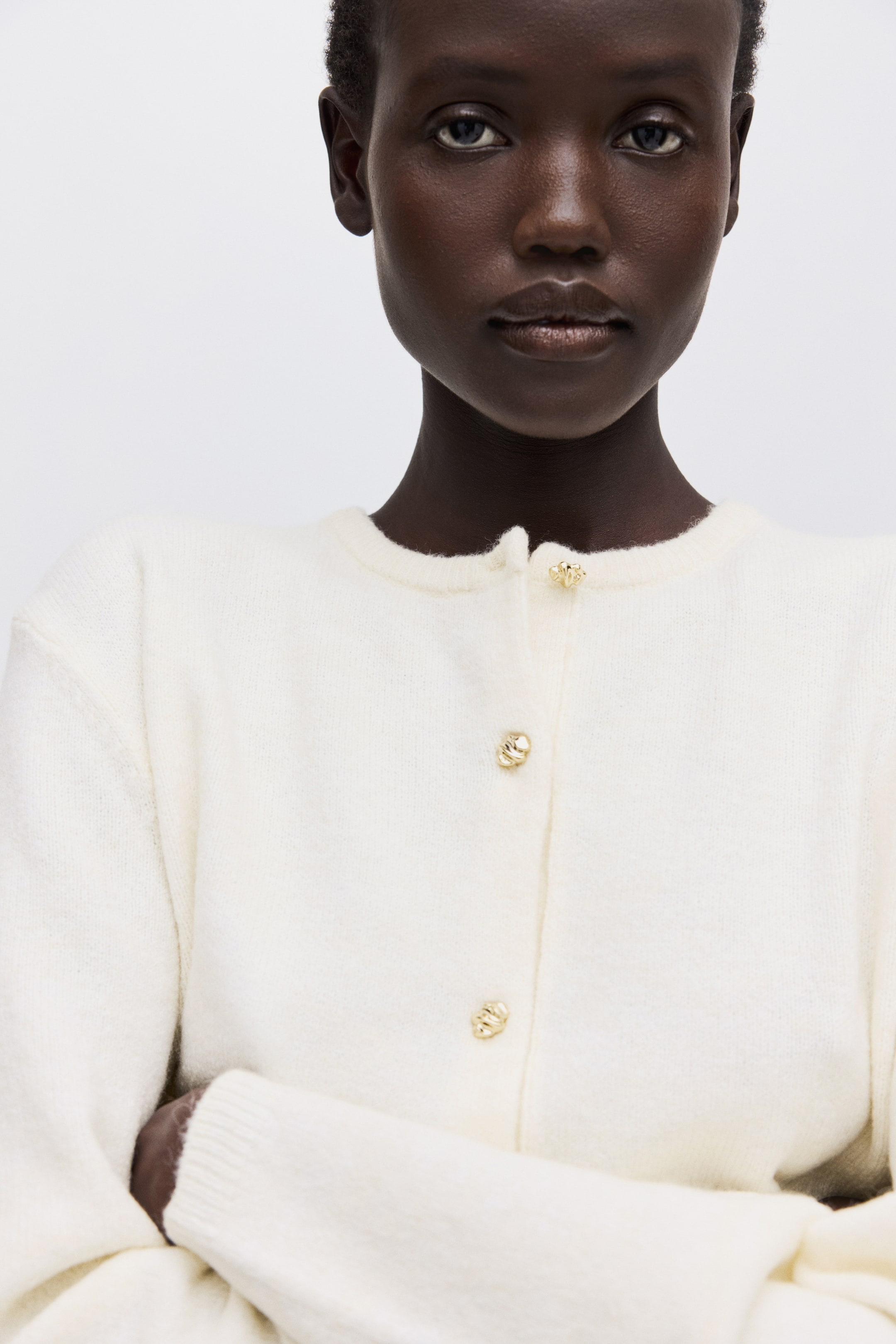 ウールを含む、ソフトなファインニットのカーディガン。ラウンドネック。フロントはメタルボタンを使用したボタン留め。ネックライン、袖口、裾はリブ編みで、細幅。