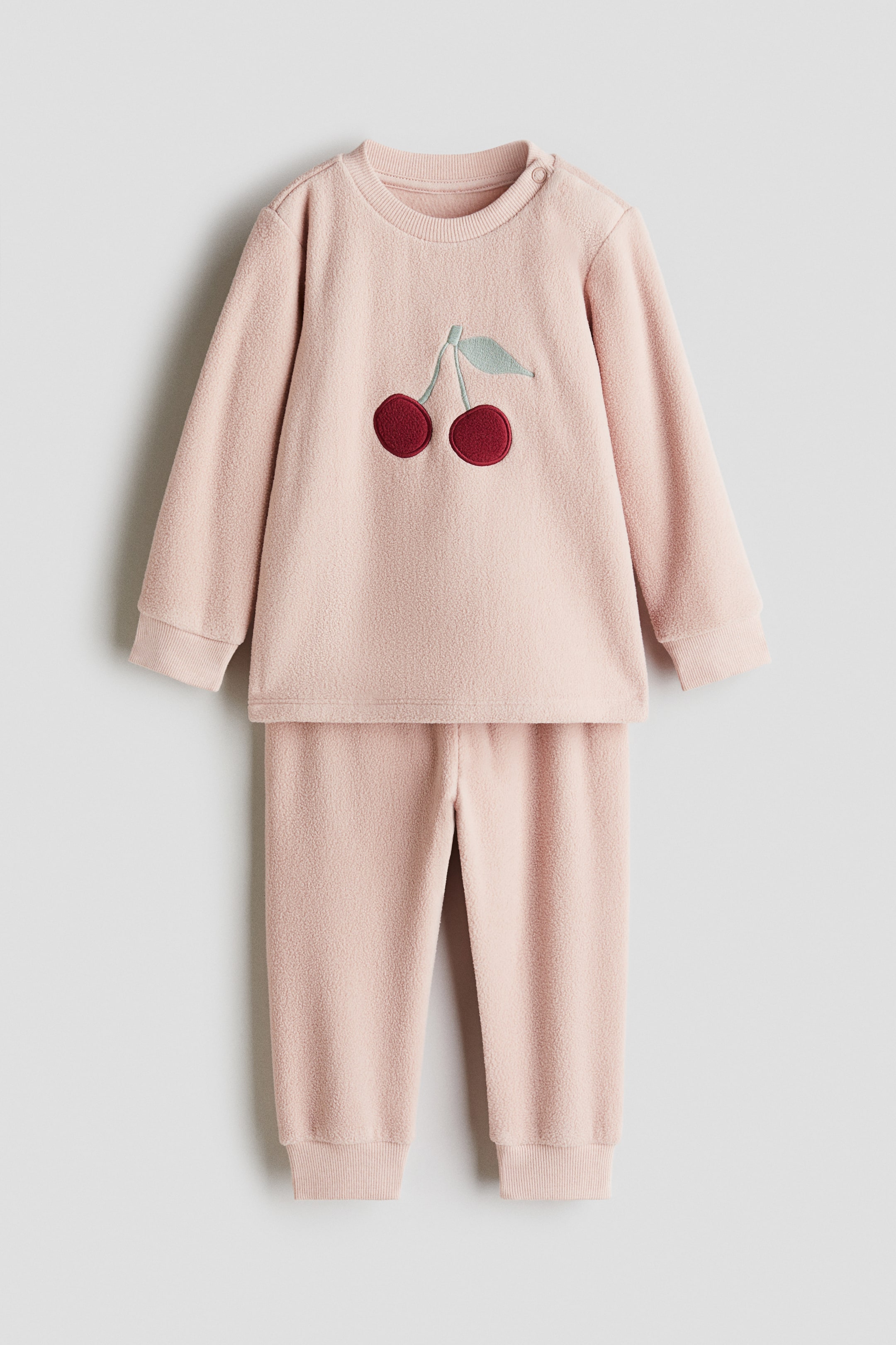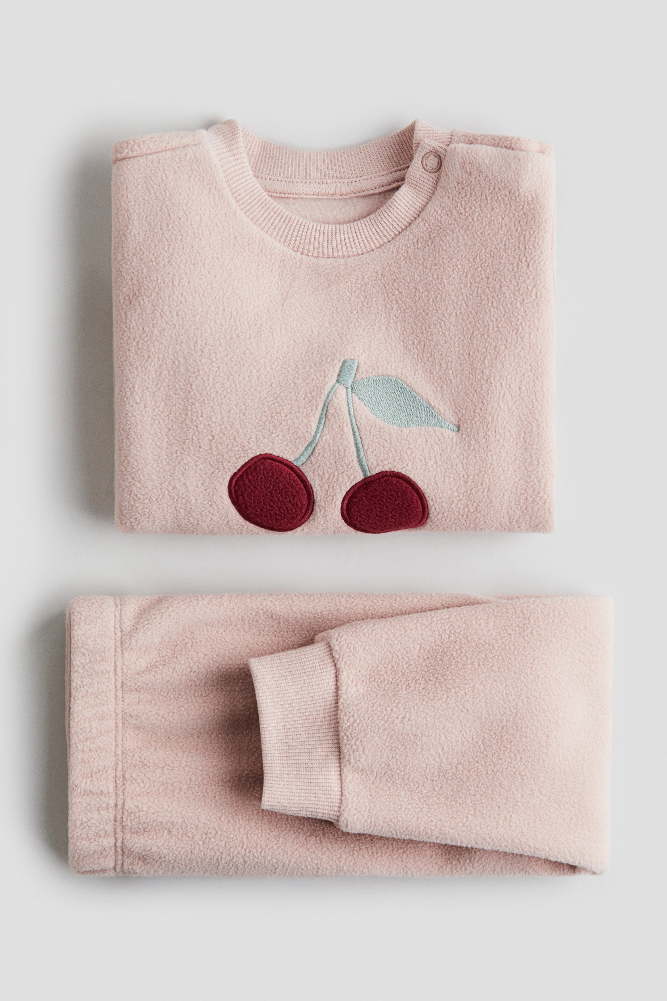 부드럽고 포근한 플리스 소재의 파자마 세트. 상의 - 긴소매 탑. 한쪽 어깨 부분에 스냅버튼이 있음(2~4Y 사이즈는 스냅버튼 생략). 리브드 마감된 네크라인과 소맷단. 하의 - 신축성 허릿단과 리브드 마감 아랫단의 팬츠.