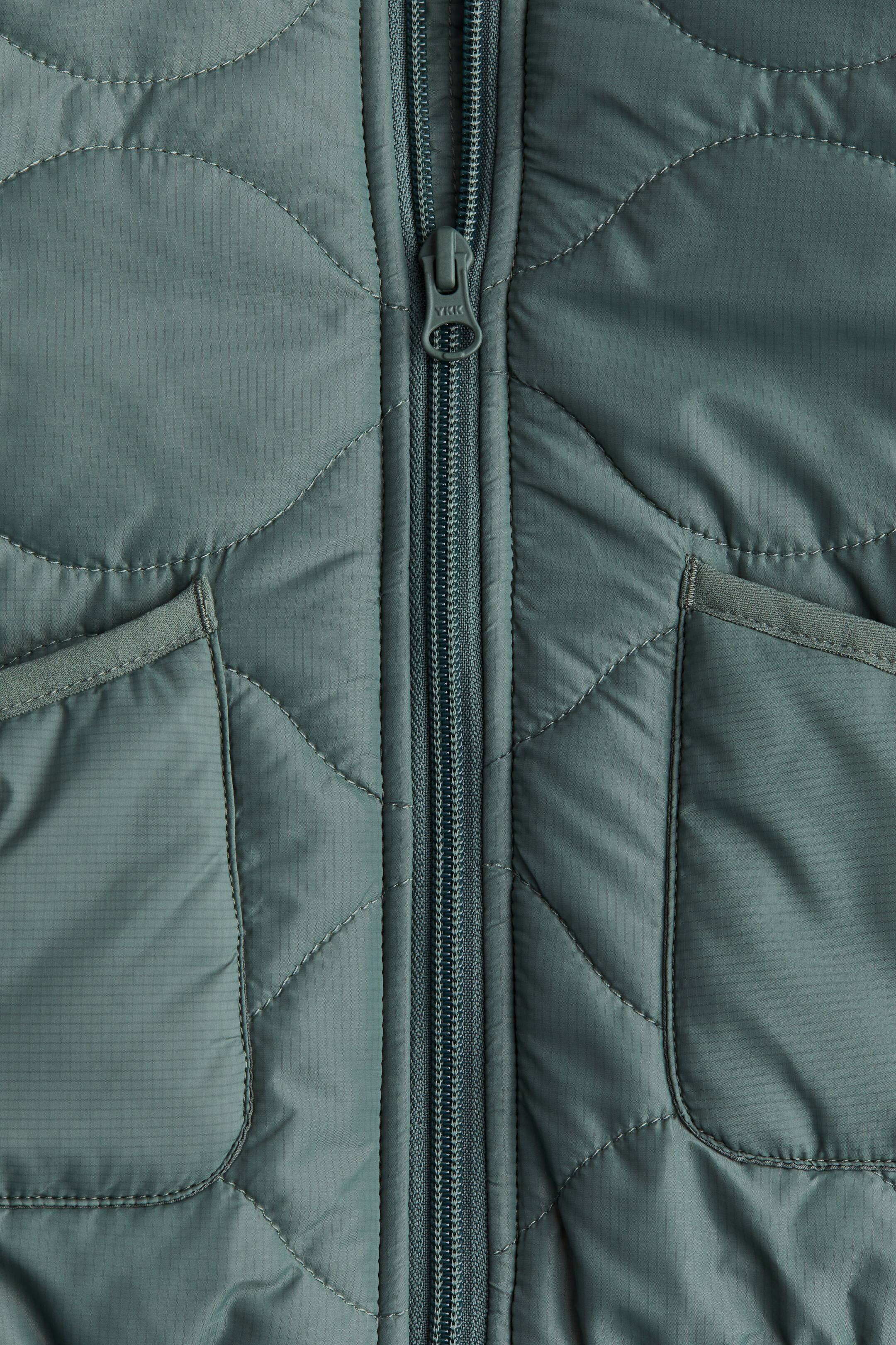 기능성 발수 소재의 얇은 패딩 재킷. 스웨트셔츠로 마감된 탈부착식 후드에 안감이 부착됨. 지퍼 클로저. 앞면 패치포켓. 신축성 있게 마감된 옷단. 안감 부착.