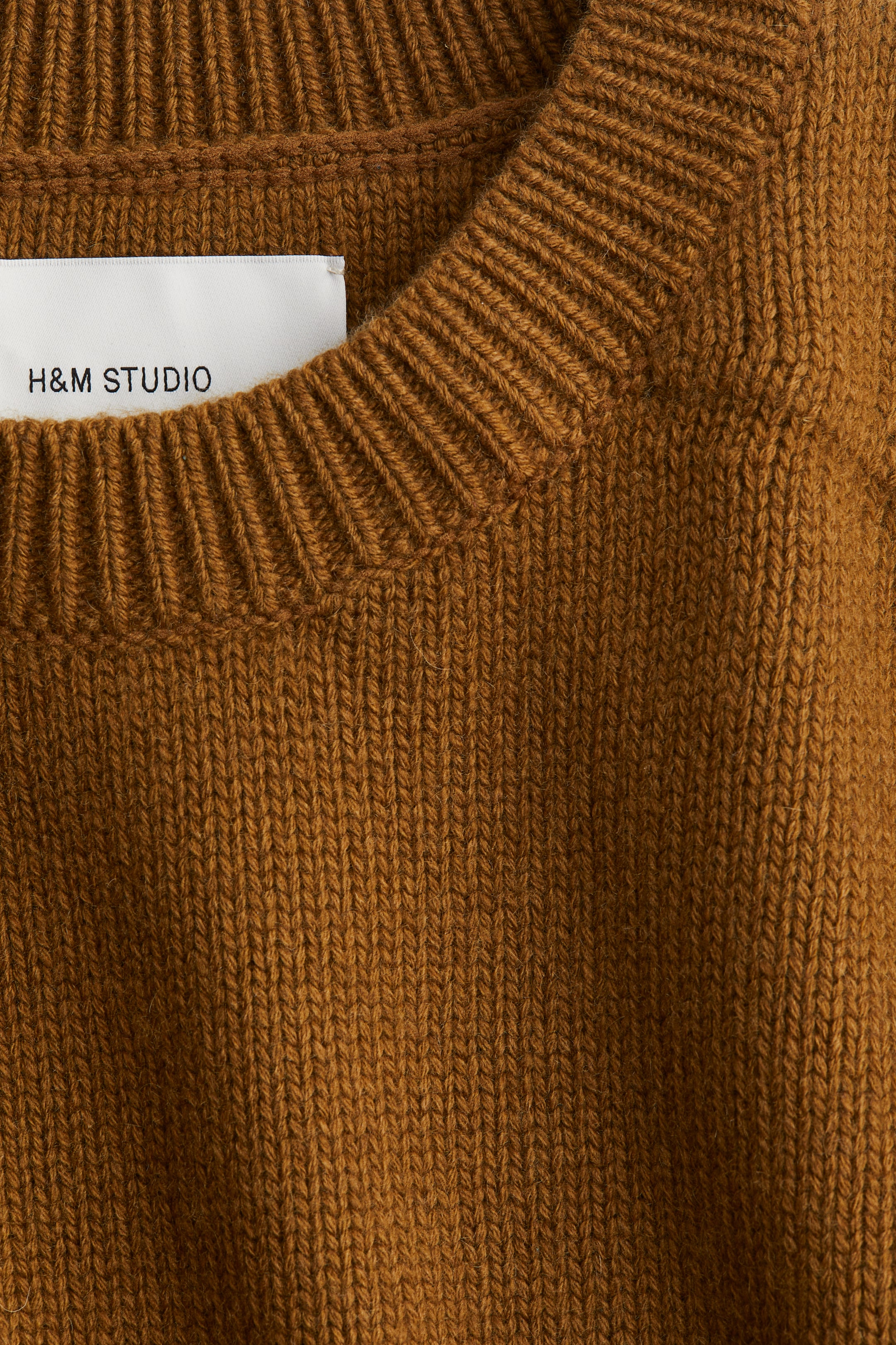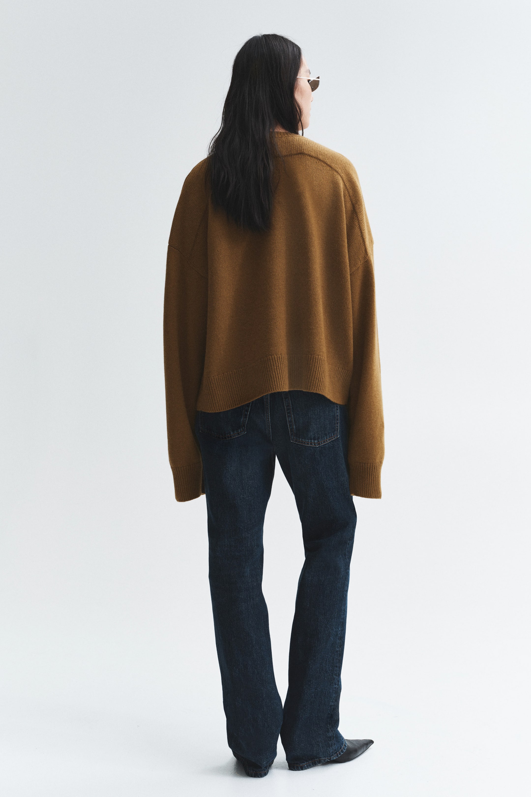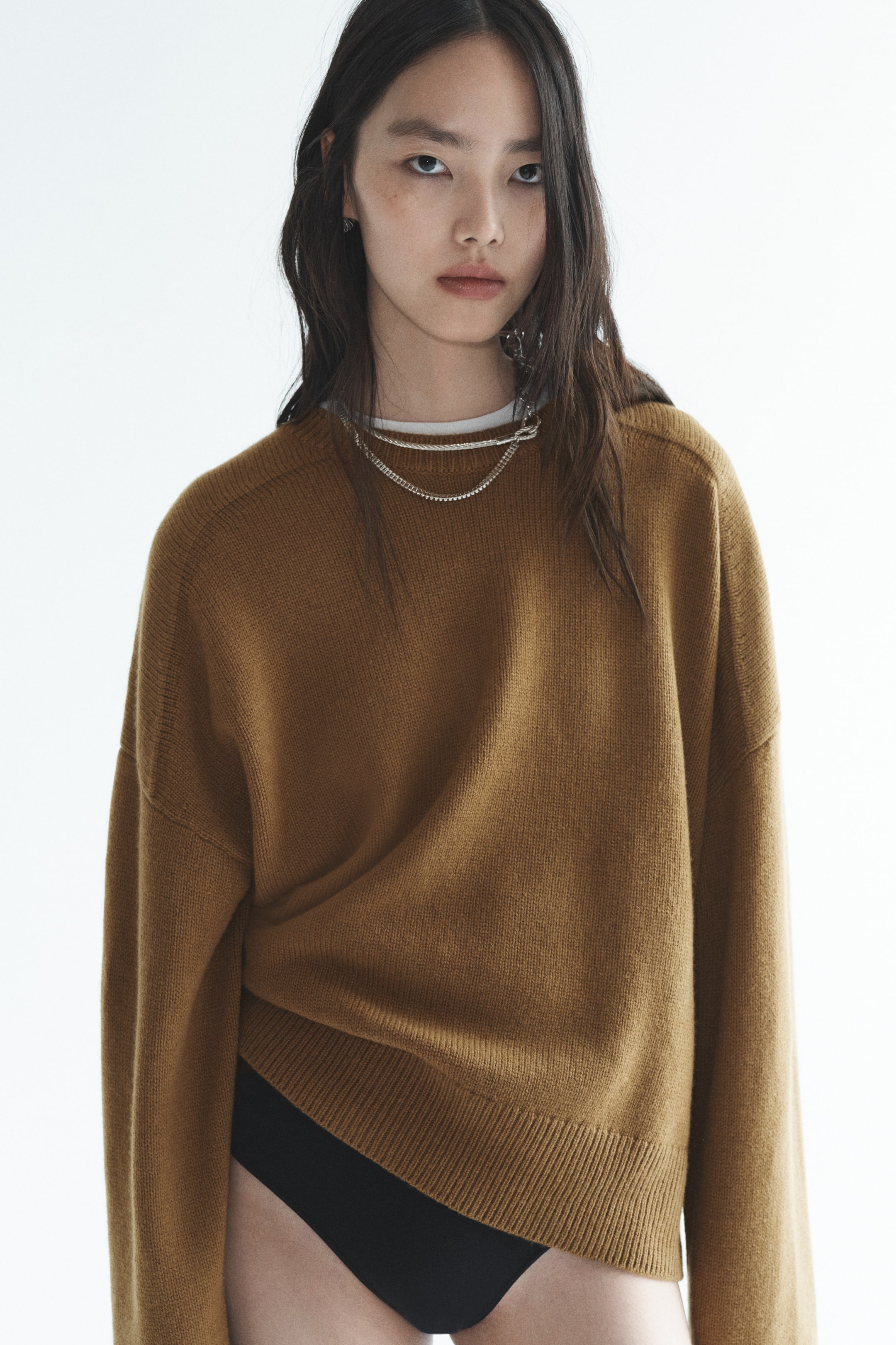 캐시미어와 울이 혼방된 부드러운 니트 소재의 스웨터. 리브드 마감된 크루넥. 어깨 부분을 강화하여 라인을 살린 실루엣. 긴소매. 리브드 마감 소맷단과 아랫단.