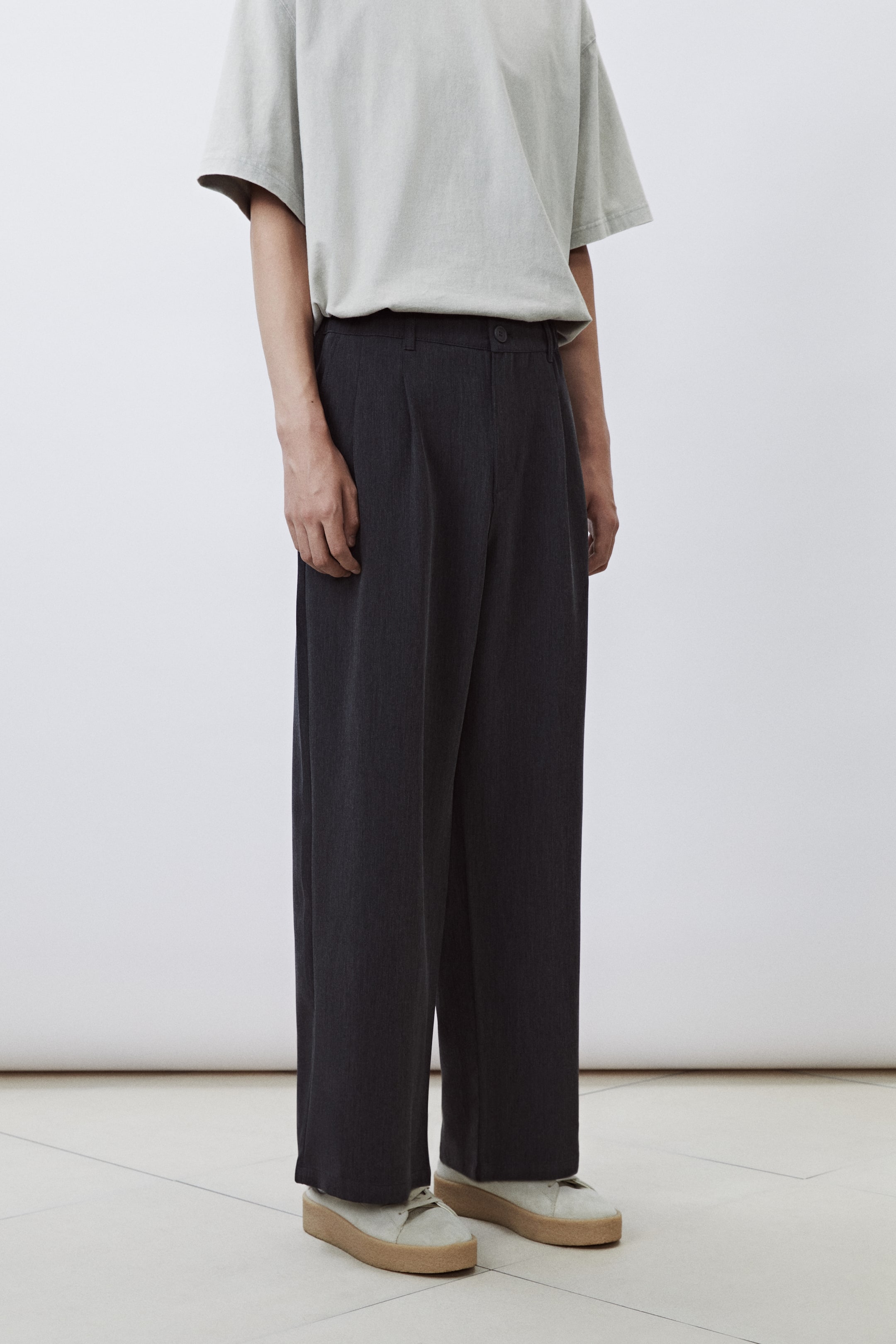 허릿단 뒷면에 밴딩이 내장된 부드러운 소재의 팬츠. 지퍼와 버튼 클로징. 상단 플리츠 디테일. 사선 방향의 옆면 포켓. 뒷면 페이크 웰트포켓. 넉넉하지만 오버사이즈보다는 약간 피트되는 루즈핏 실루엣.