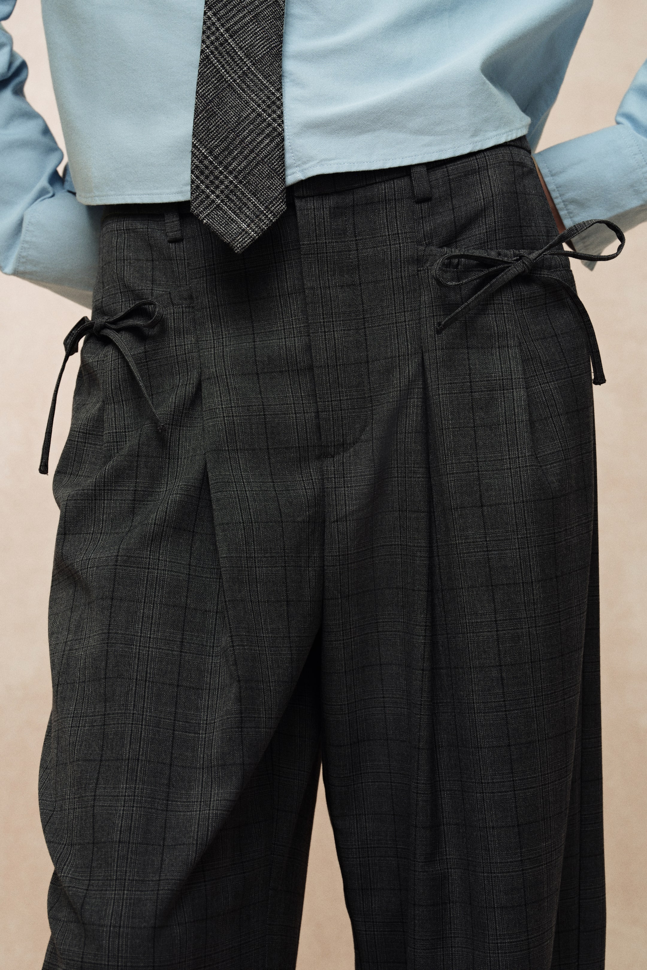지퍼와 히든 후크, 버튼으로 여미는 팬츠. 입구 부분이 신축성 있게 처리된 앞면 포켓에 가는 끈이 있음. 뒷면 웰트포켓. 앞면에 플리츠가 잡힌 와이드 레그.