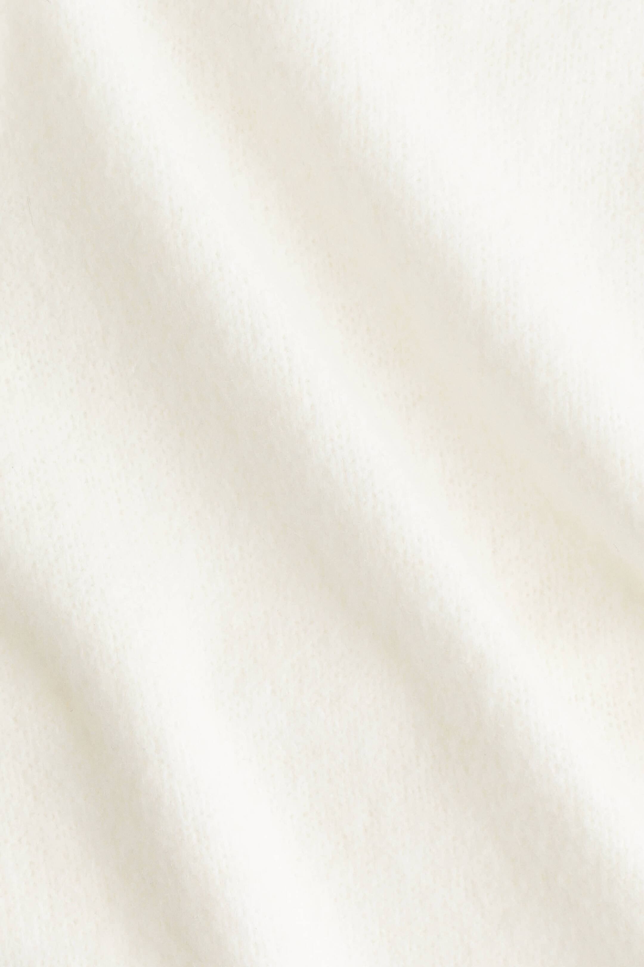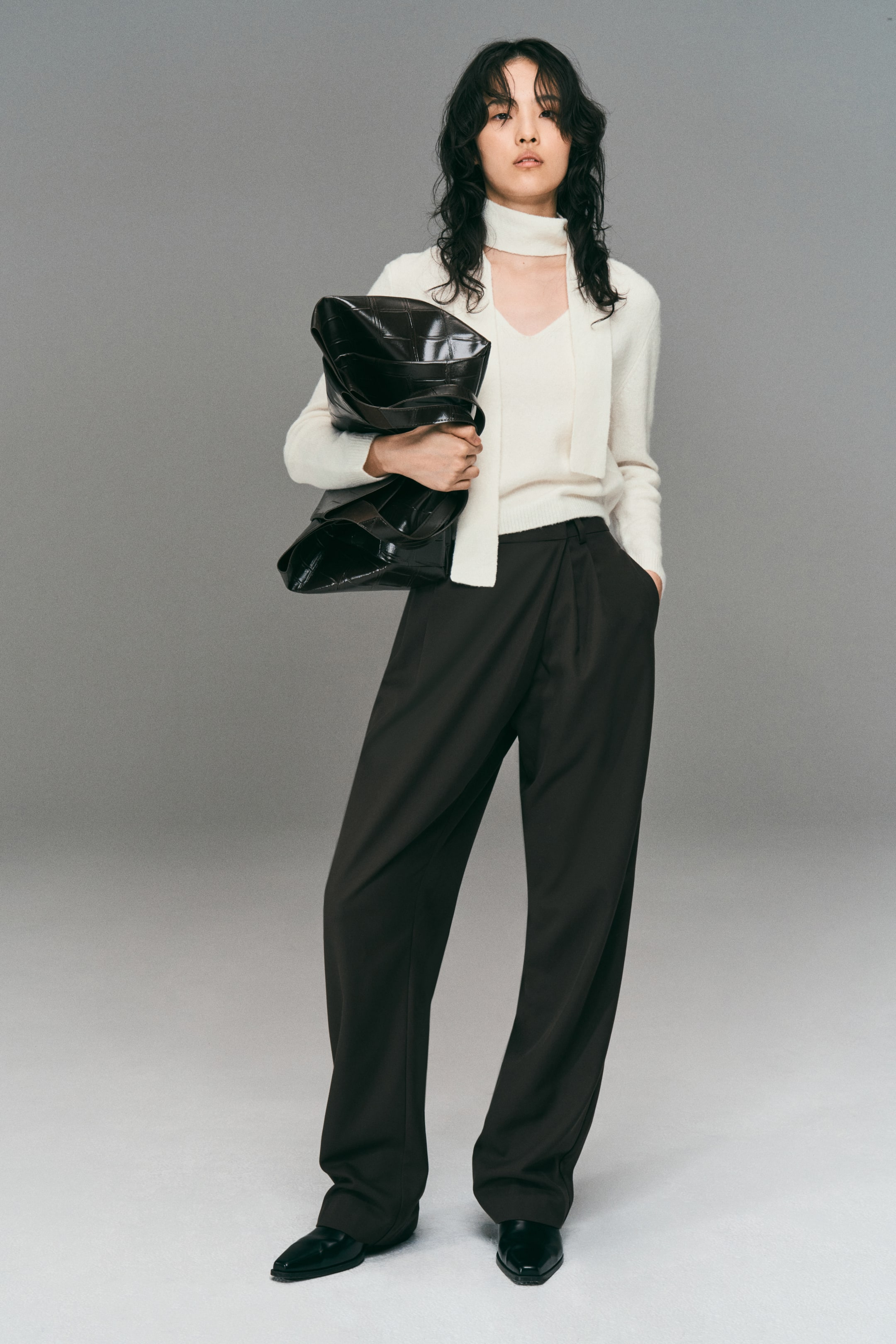 부드러운 니트 소재의 V넥 스웨터. 스카프 칼라. 세미 드롭 숄더. 긴소매. 리브드 마감 소맷단과 아랫단.