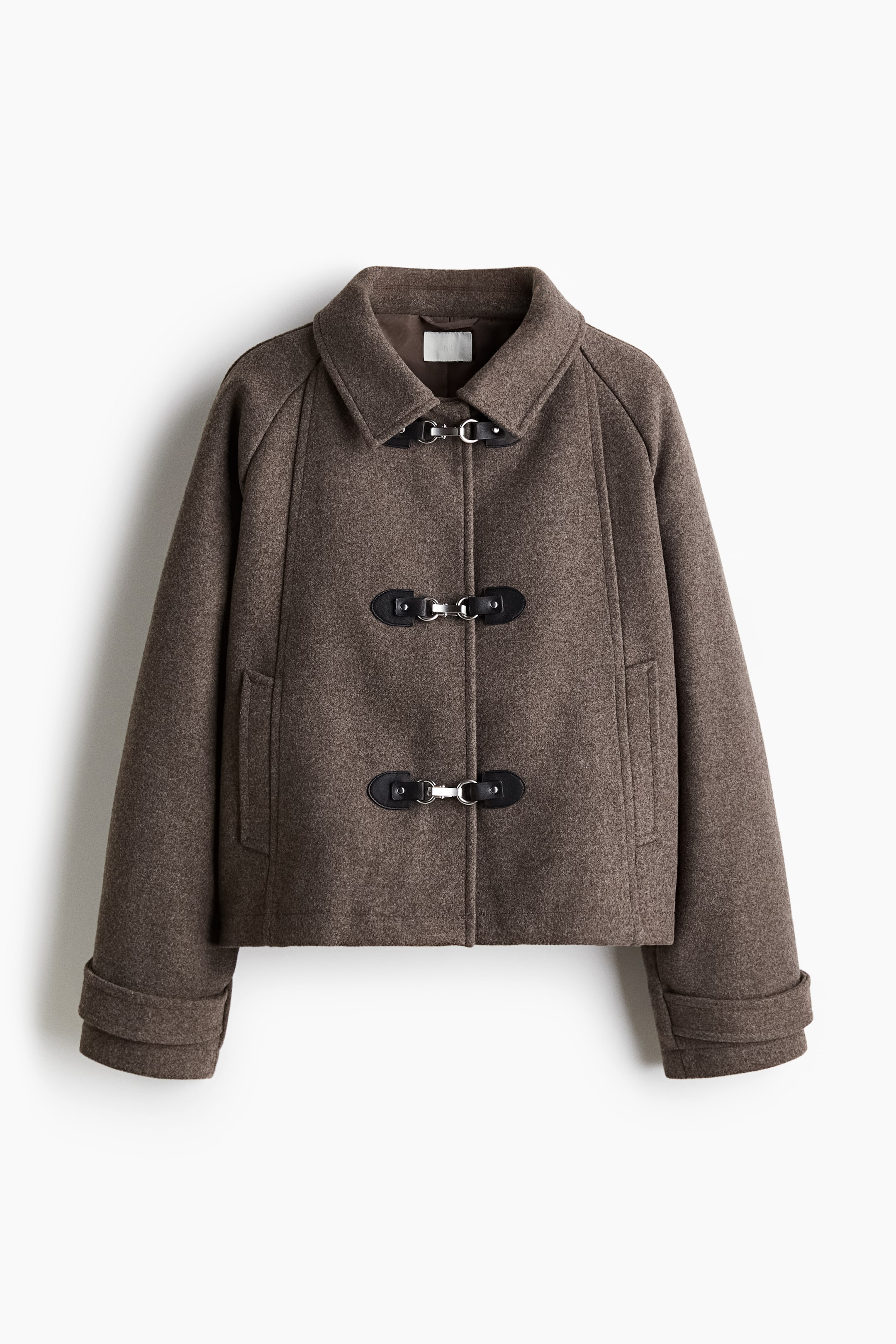 펠트 소재의 짧은 더플 스타일 재킷. 칼라와 앞면 버클 클로저가 있음. 옆면 웰트포켓. 래글런 스타일의 긴소매. 탭과 버튼으로 소맷단 핏 조절. 안감 부착.