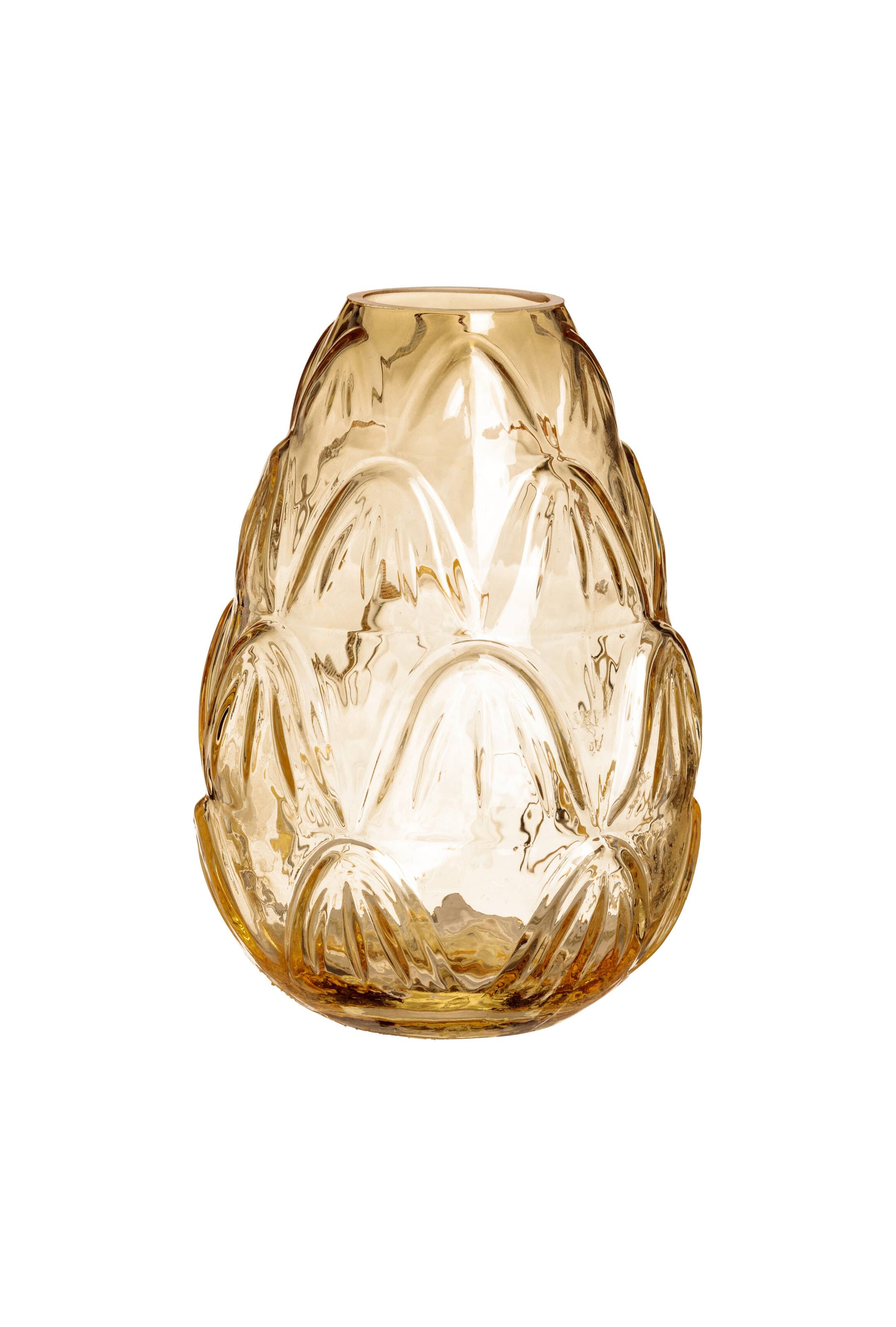 Een druppelvormige minivaas van helder glas met een reliëfdessin. Diameter bovenaan 2,5 cm. Hoogte 11,5 cm.