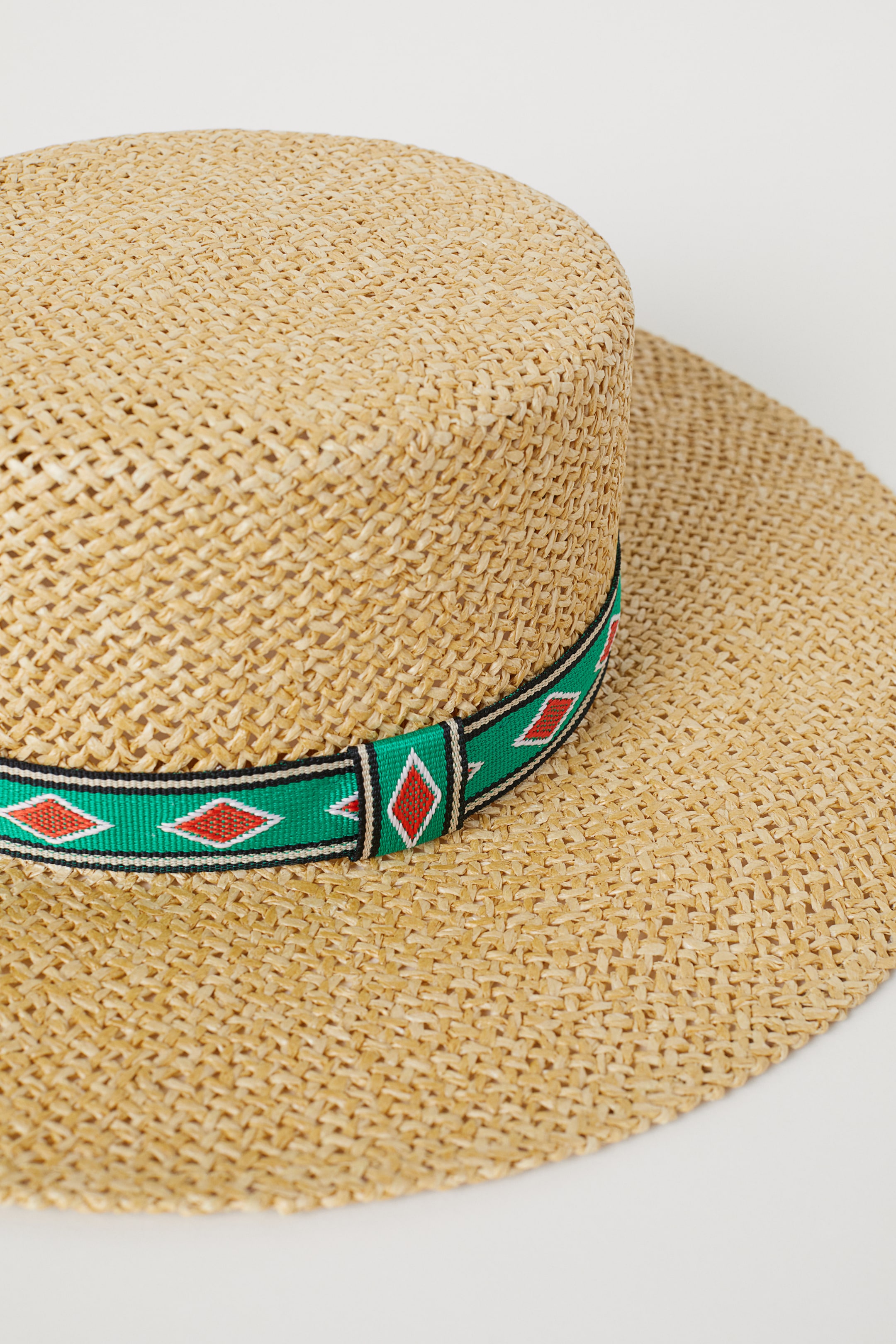 Een hoed van gevlochten papierstro met een geribde band. Breedte hoedrand 9 cm.