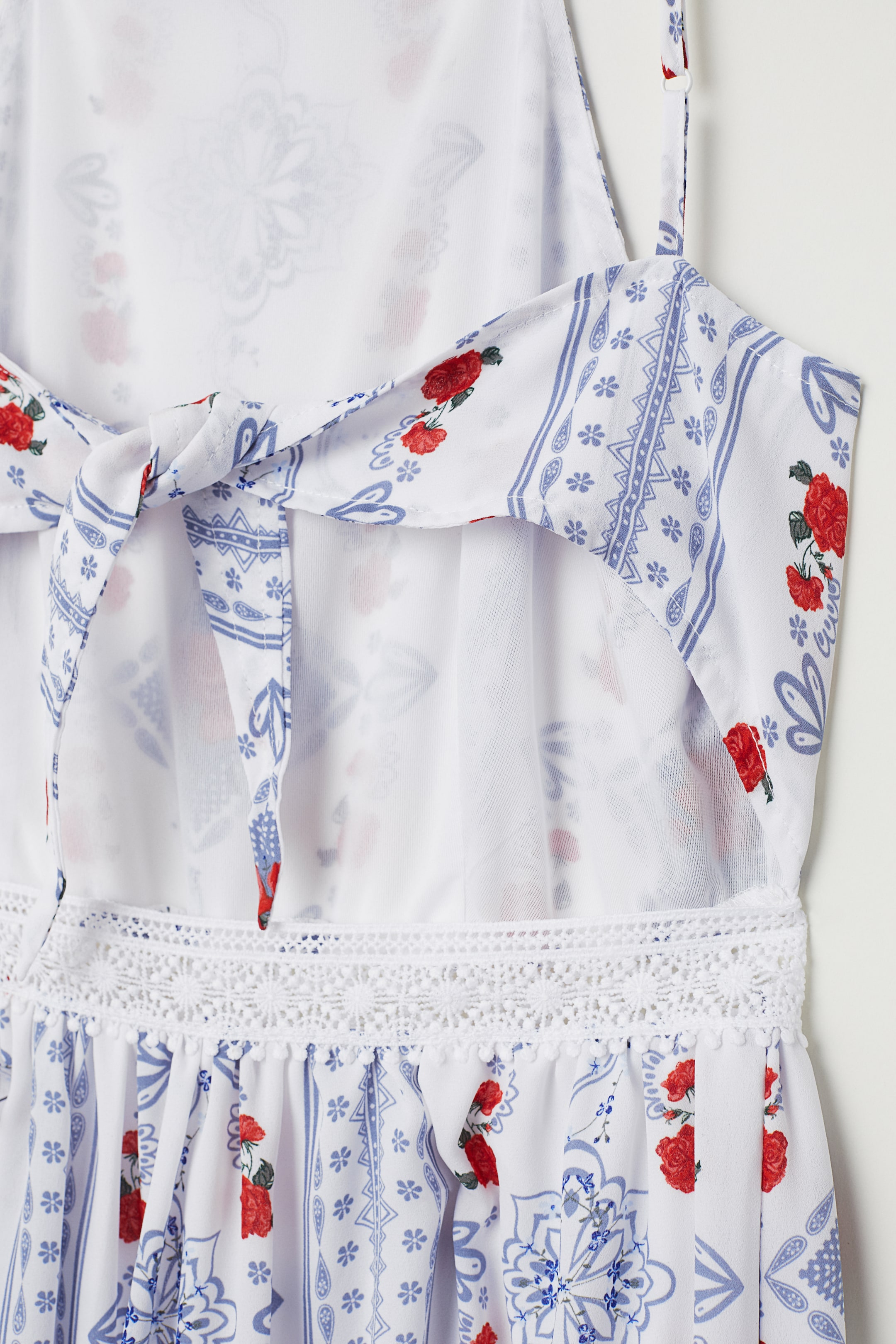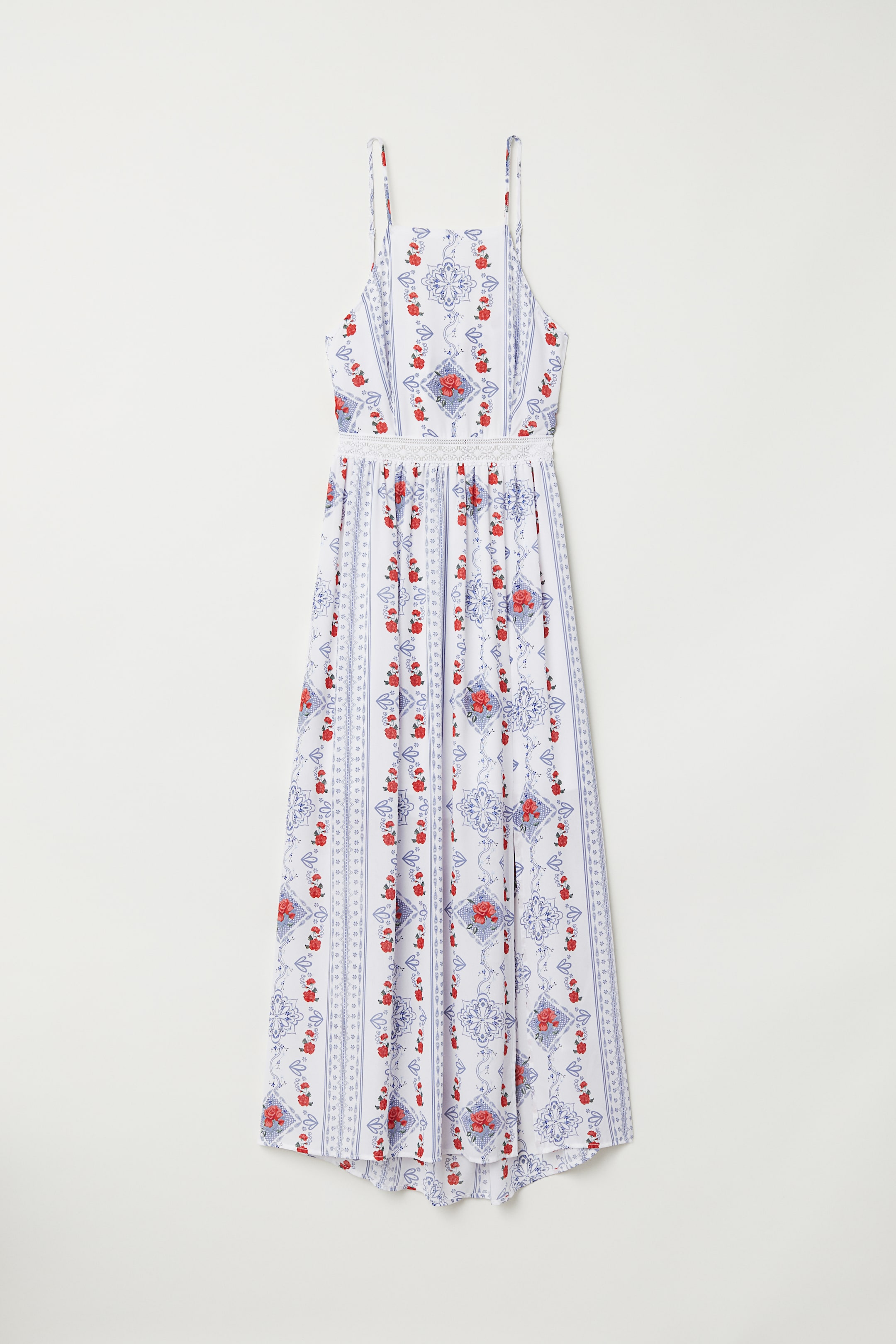 Een maxi-jurk van geweven stof met een geprint dessin. De jurk heeft een smalle snit bovenaan, verstelbare spaghettibandjes, een onbedekte rug met horizontale striklintjes, een kanten bies in de taille en een blinde zijrits. Deels gevoerd.