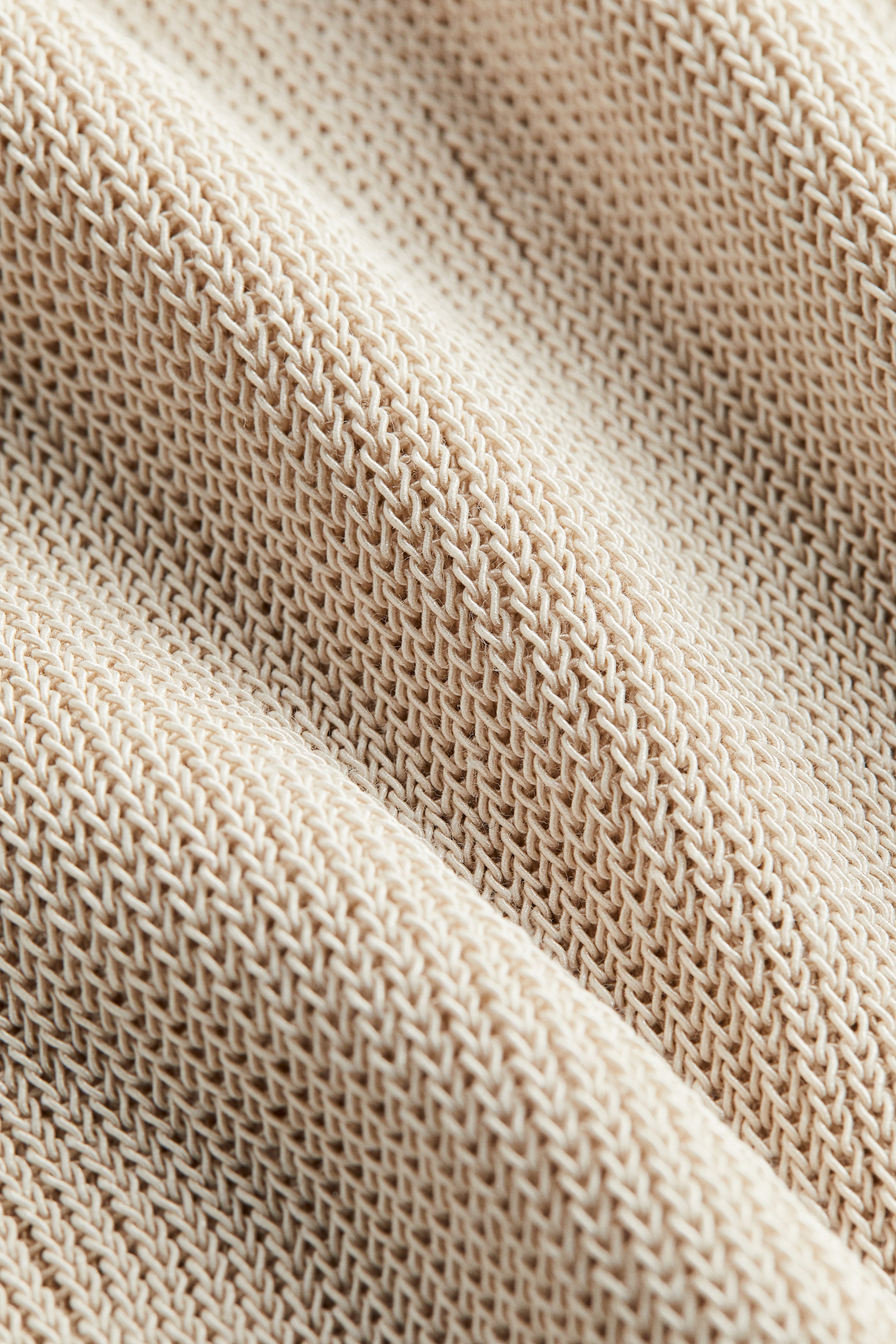 Een nauwsluitende, gebreide midi-jurk. Het model heeft een diepe V-hals vooraan, ajourgebreide cups, smalle schouderbandjes en een ronde ruguitsnijding.