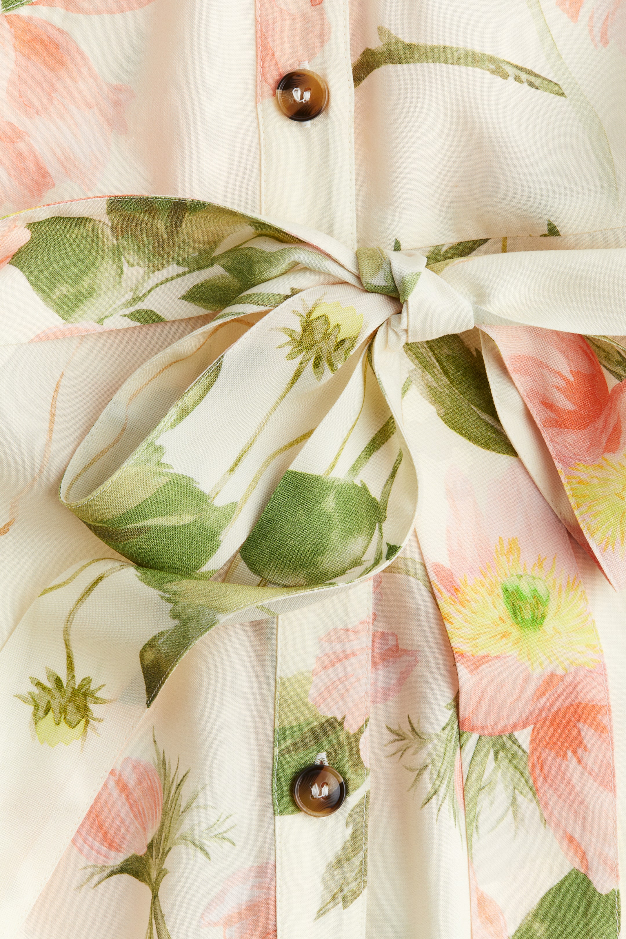 Een korte jurk van geweven stof. Het model heeft een kraag, een V-hals, een knoopsluiting, raglanmouwen tot op de elleboog, borstzakken en een breed, afneembaar striklint. Ongevoerd.