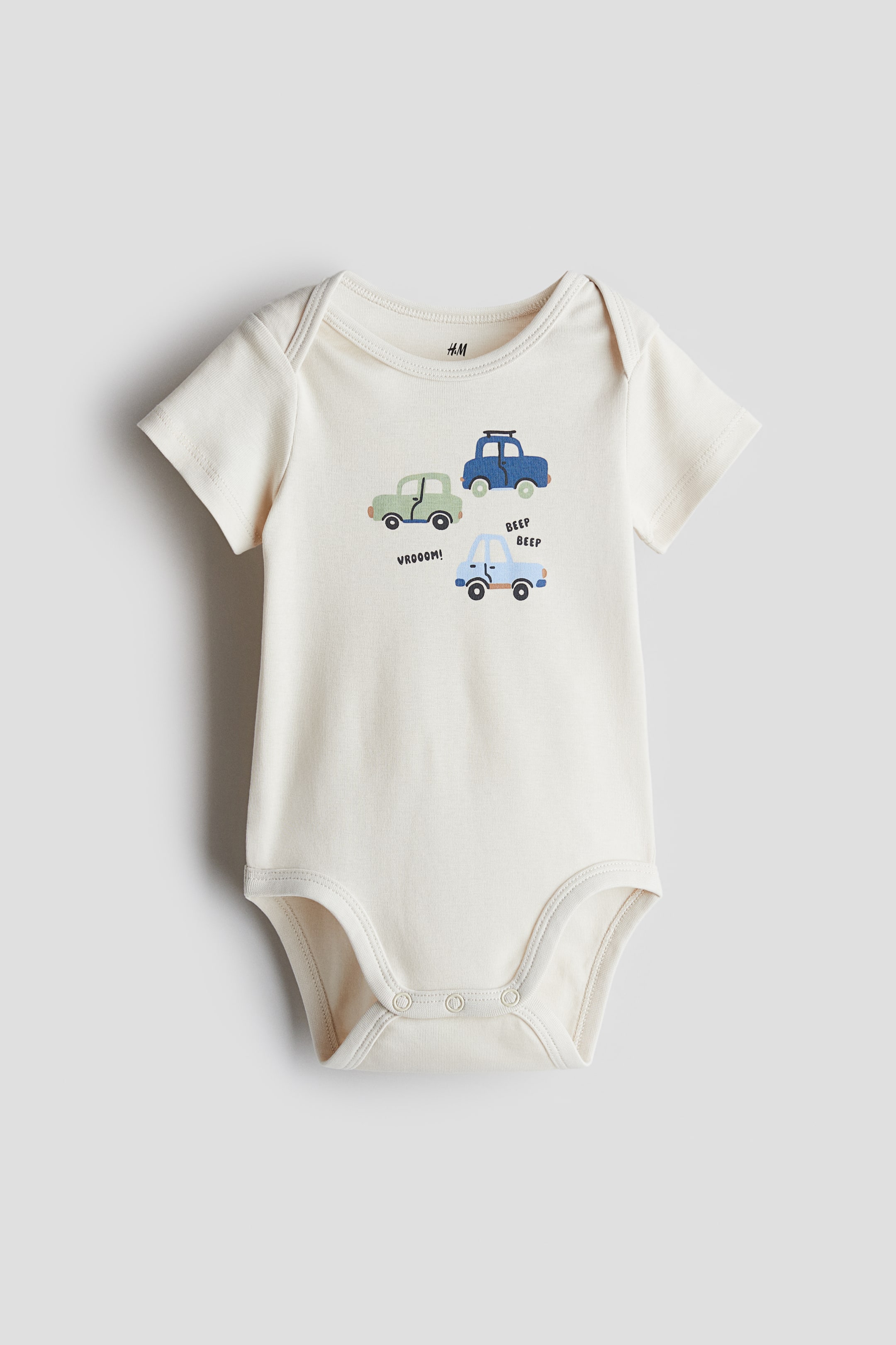 Een body van superzacht katoentricot met een print. Het model heeft korte mouwen en een overslag bij de hals en een drukknoopsluiting in het kruis om de body makkelijker aan en uit te trekken.