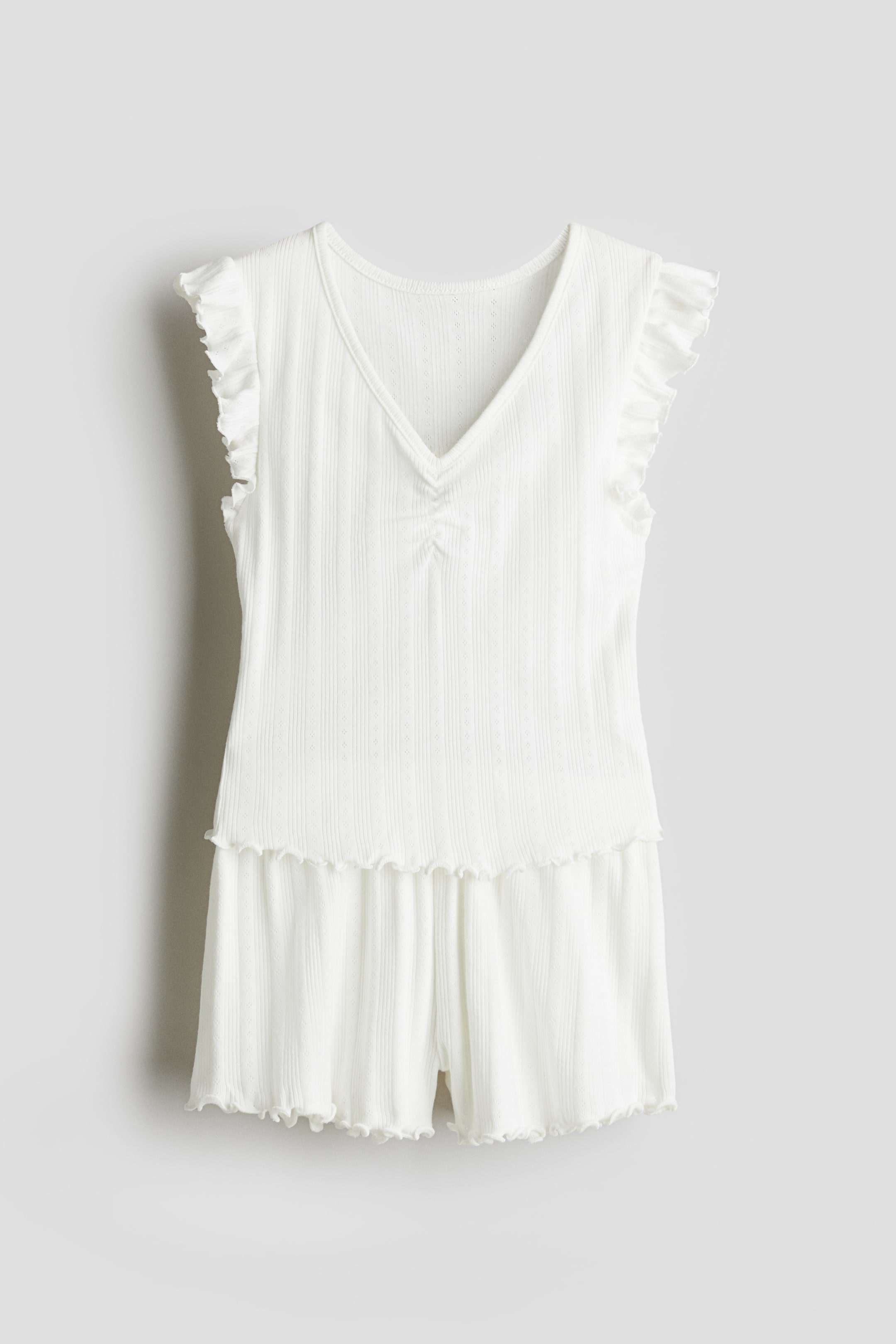 Een pyjama van zacht katoentricot met een pointelledessin en overlockte randen. De top heeft een V-hals, plooitjes aan de voorkant en volantmouwen. De short heeft een elastische taille.