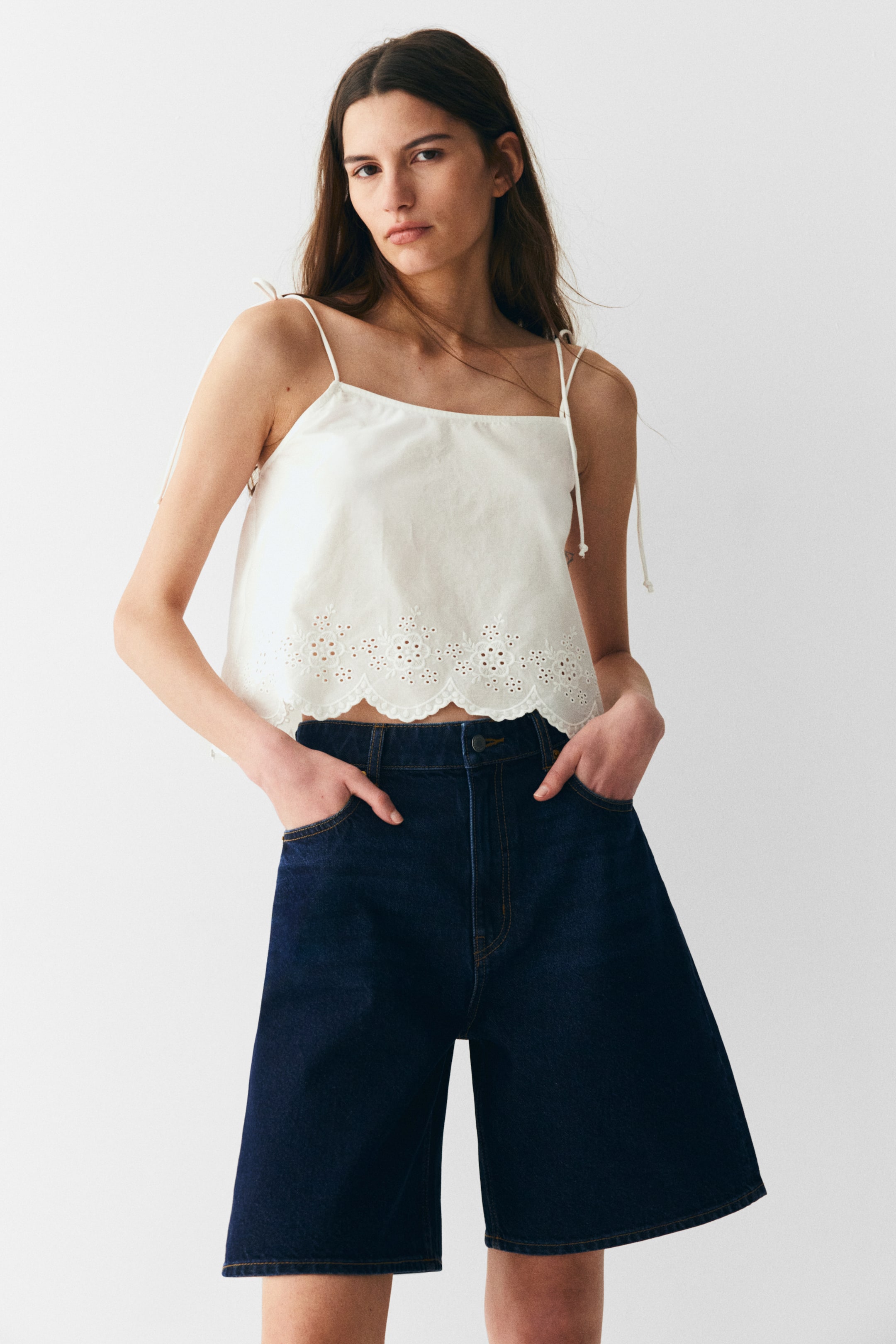 Een knielange 5-pocketshort van katoendenim met een hoge taille en een gulp met ritssluiting en knoop.