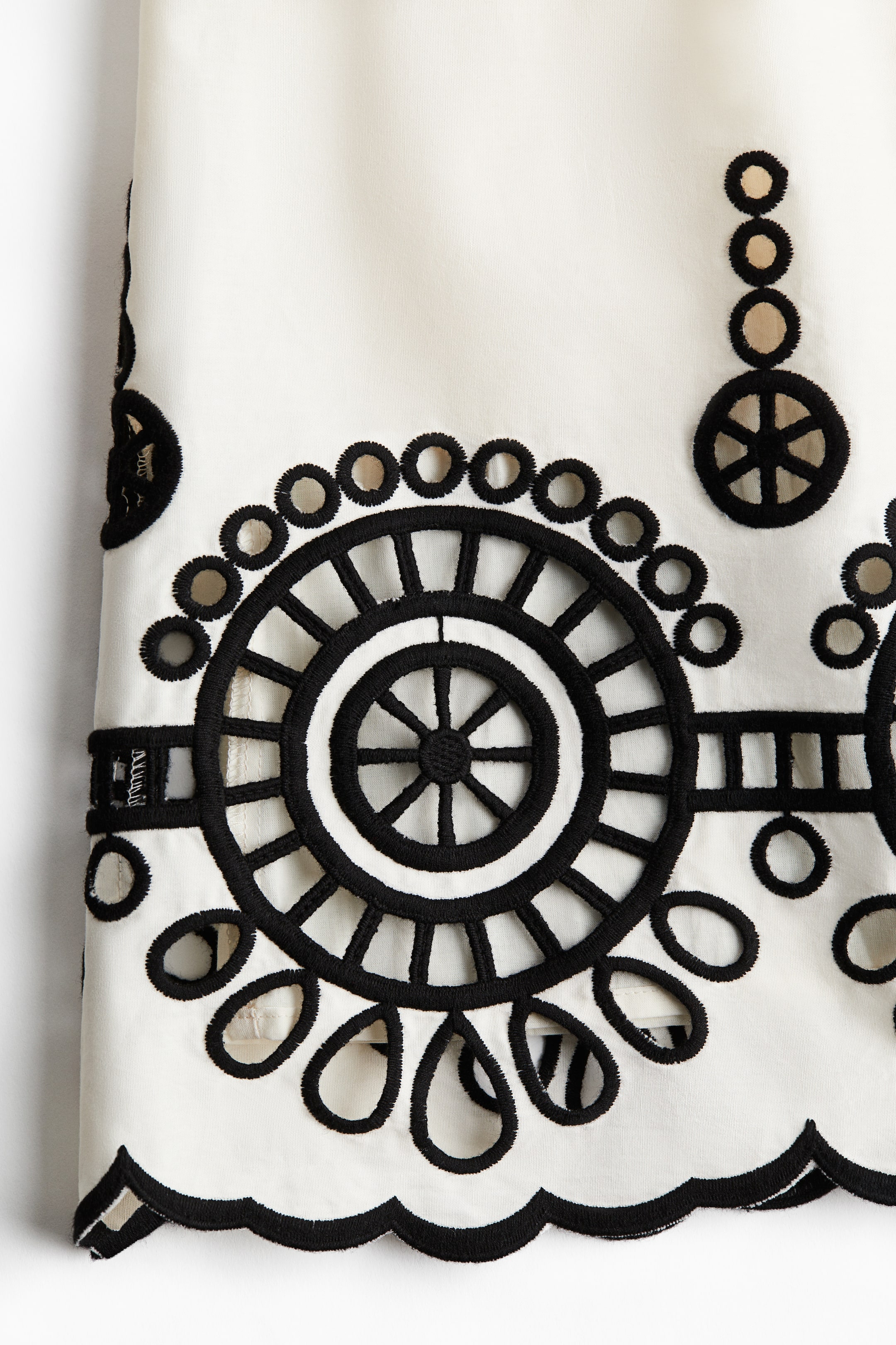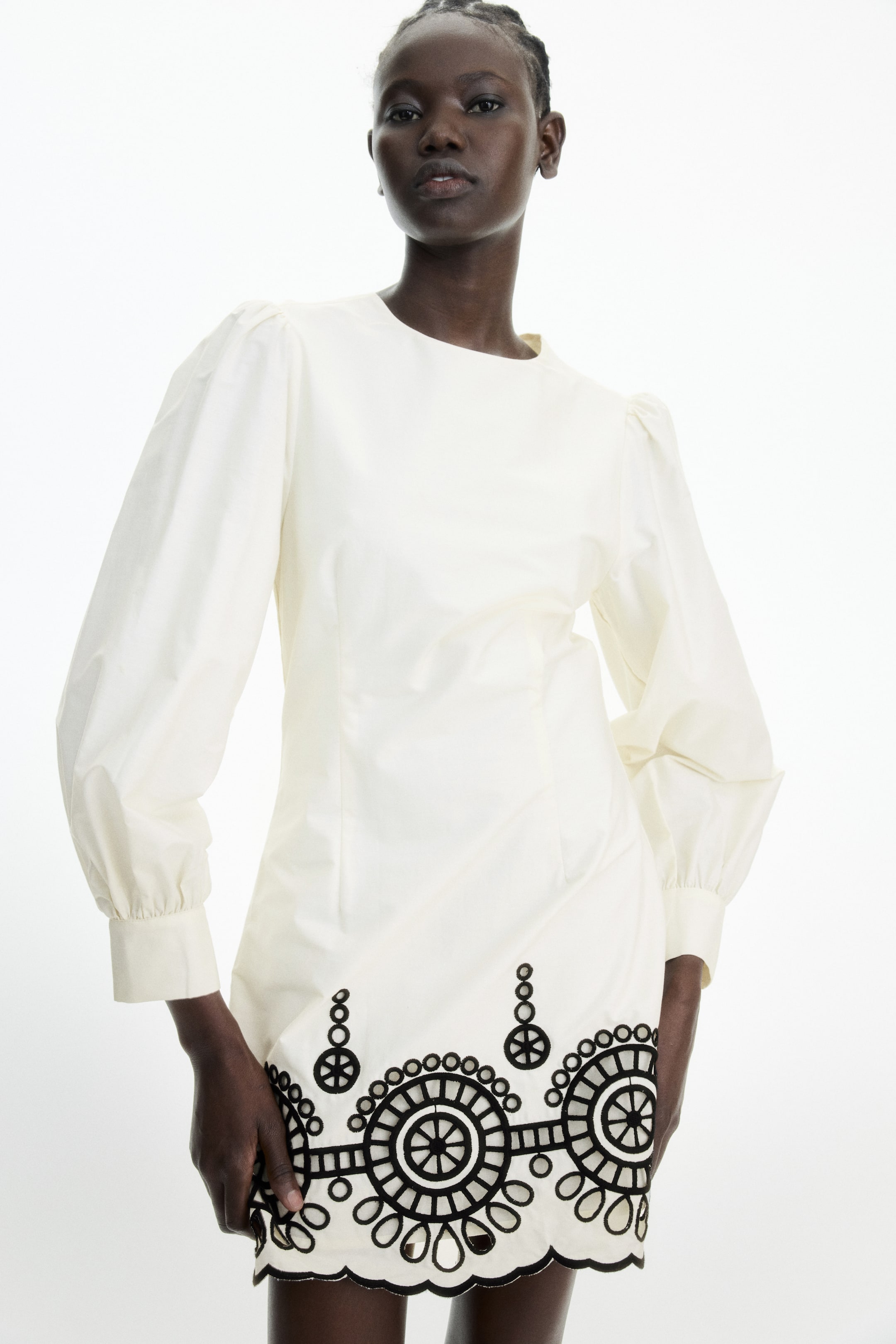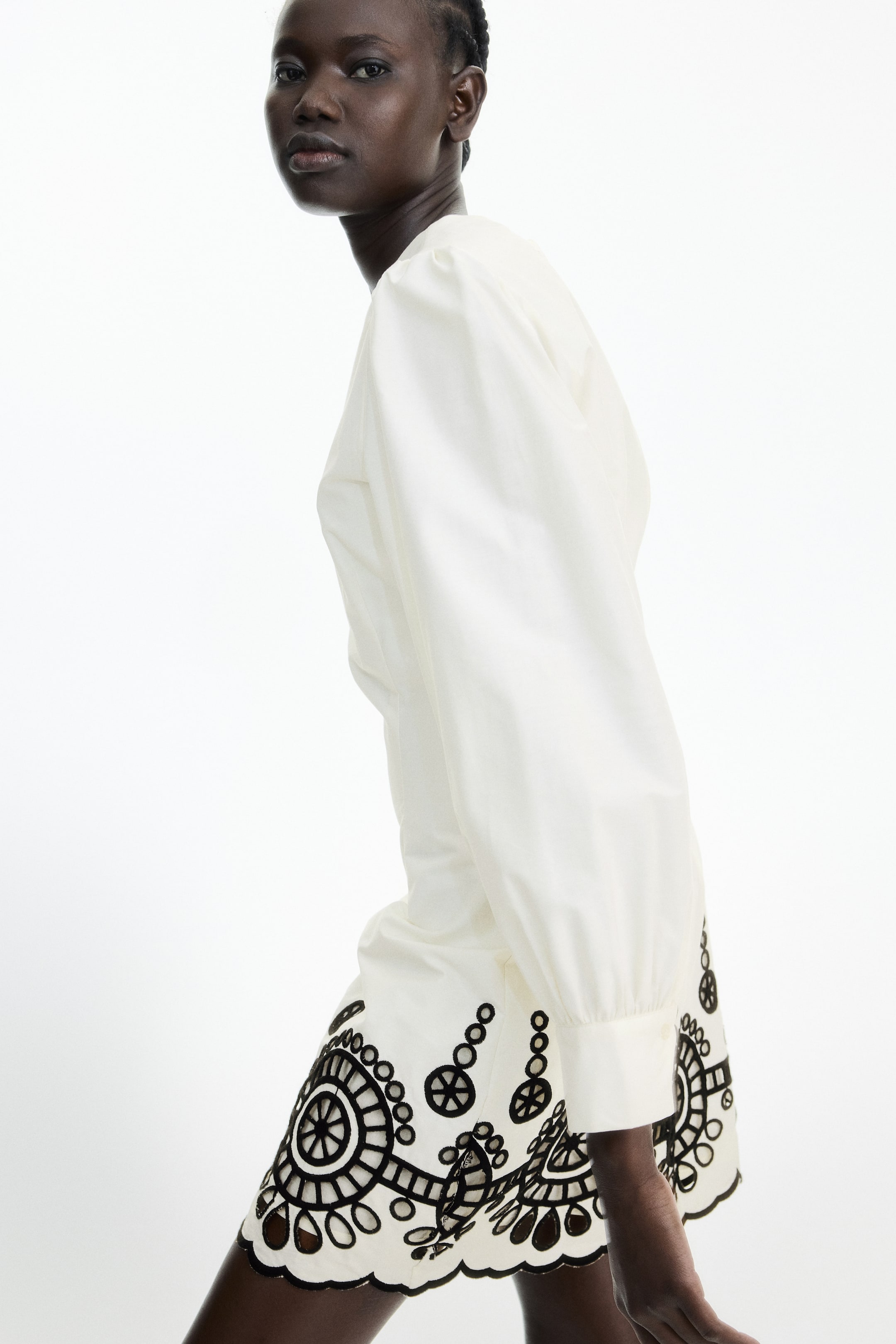 Een korte jurk van knisperend popelinekatoenen met contrasterende broderie anglaise op de rok. Het model heeft een ronde hals, lange pofmouwen met een manchet met knoopsluiting, een blinde rits en haak-en-oogsluiting op de rug en smokwerk achteraan in de taille voor een flatterend silhouet. Gevoerd.