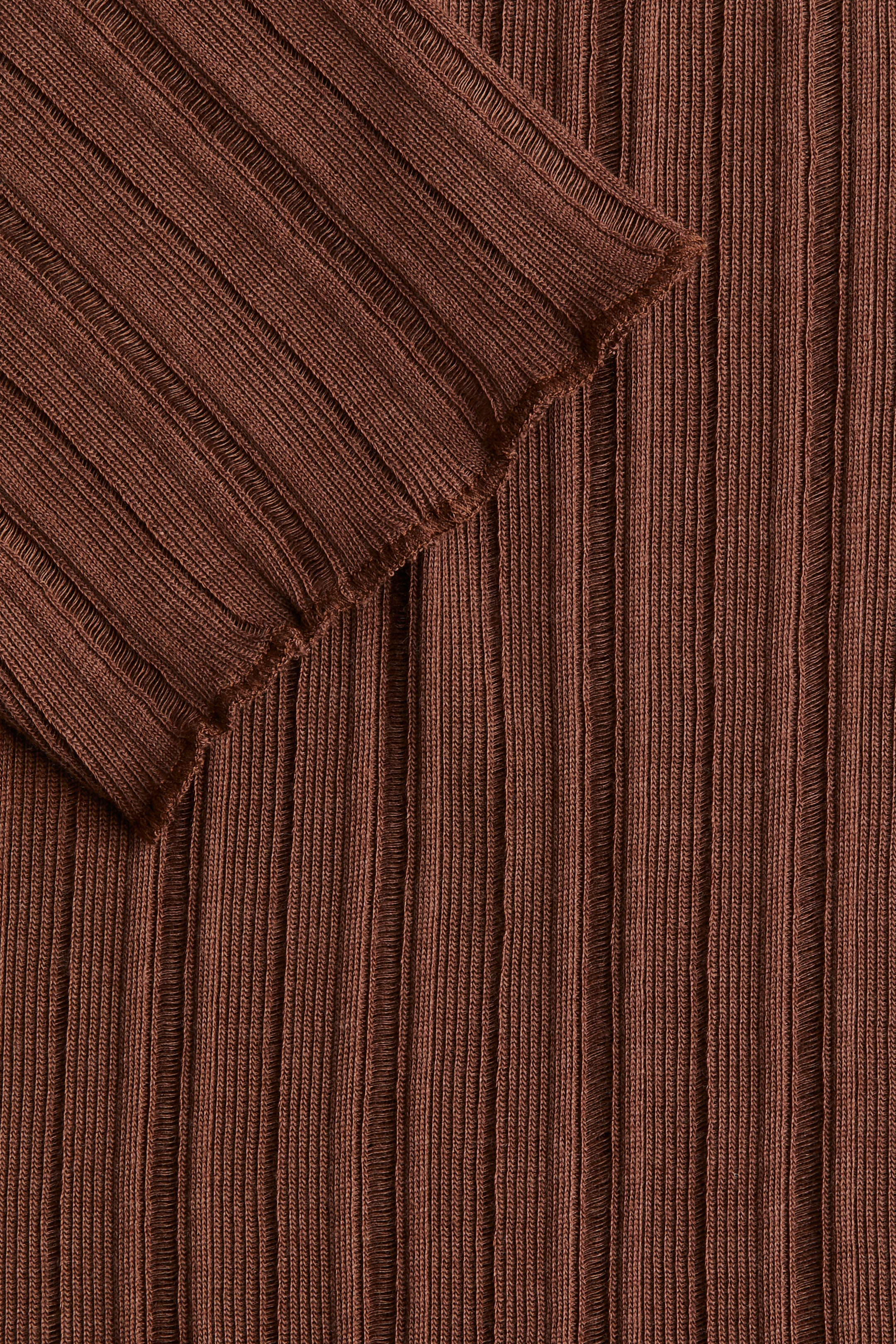 Een geribde top van losgebreide stof. Het model heeft een ronde hals en korte mouwen. De onderkant en de mouwen zijn overlockt.