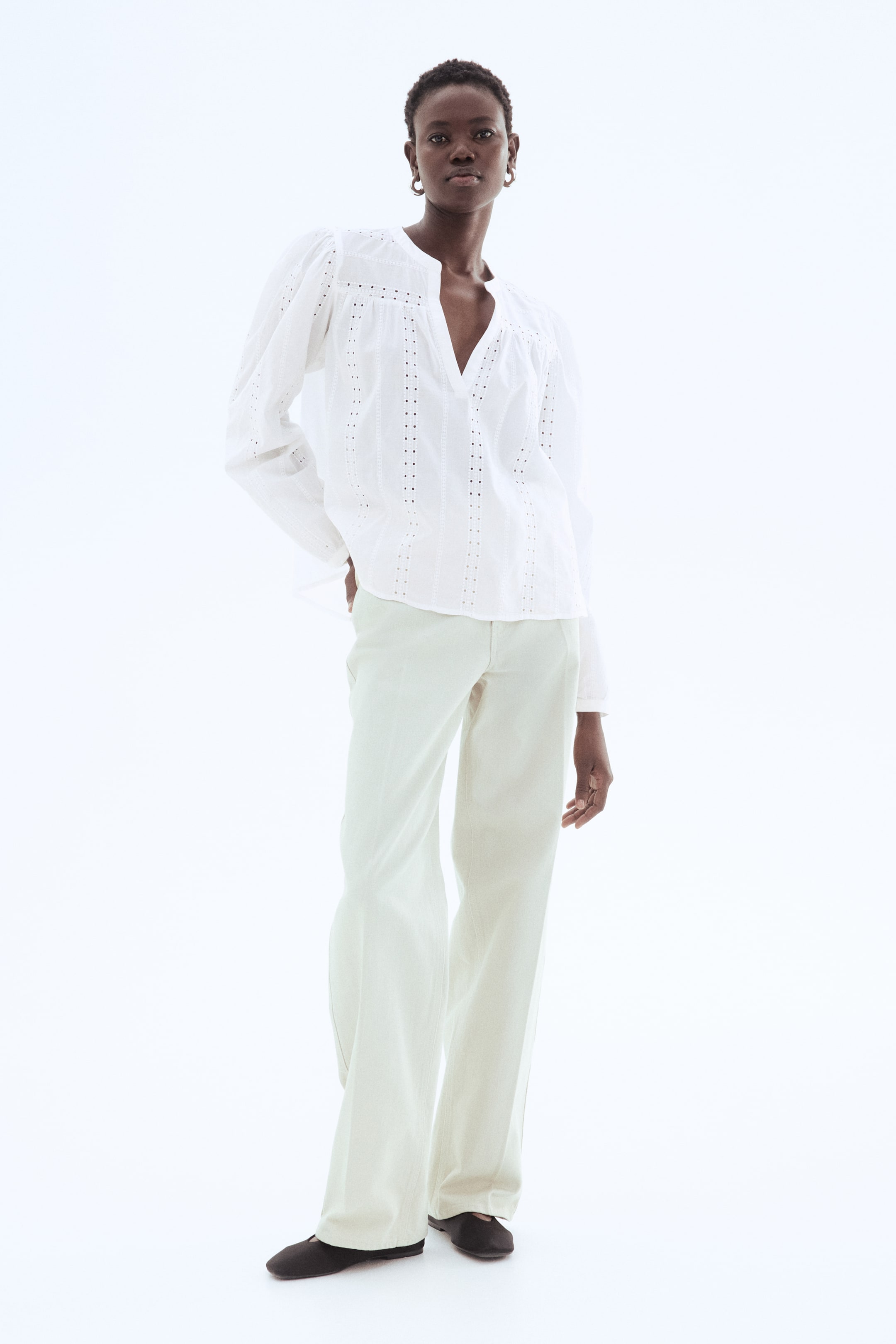 Een bloes van luchtig, geweven katoen met een ton sur ton strependessin van broderie anglaise. Ruime pasvorm. De bloes heeft een halsboordje, een V-splitje, een gefronste schouderpas voor- en achteraan en lange pofmouwen met een smalle manchet met knoopsluiting.