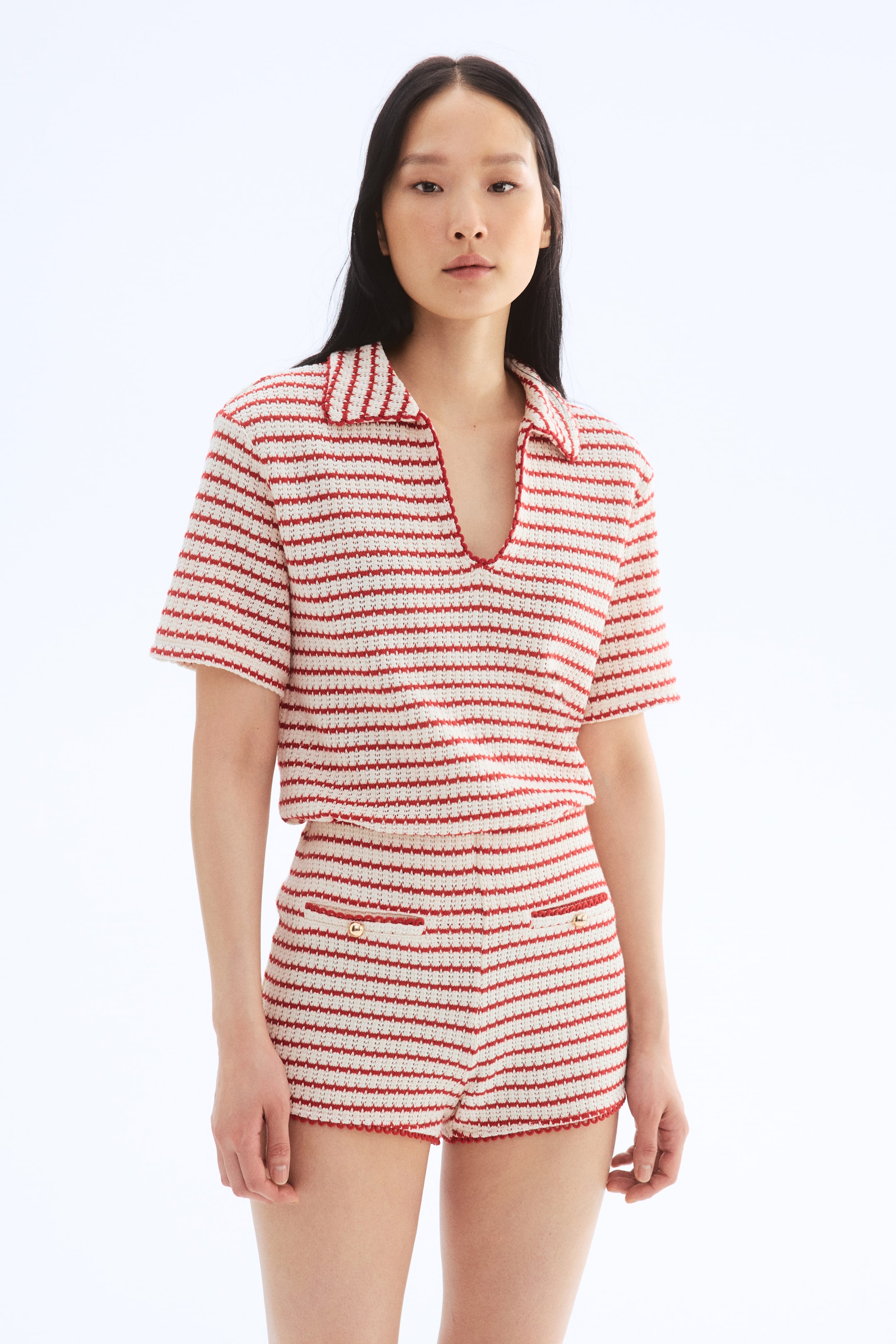 Een nauwsluitende short van katoenmix met een ingebreide structuur. Het model heeft een hoge taille met blind elastiek en valse voorzakken met paspel en glanzende metalen knoop.