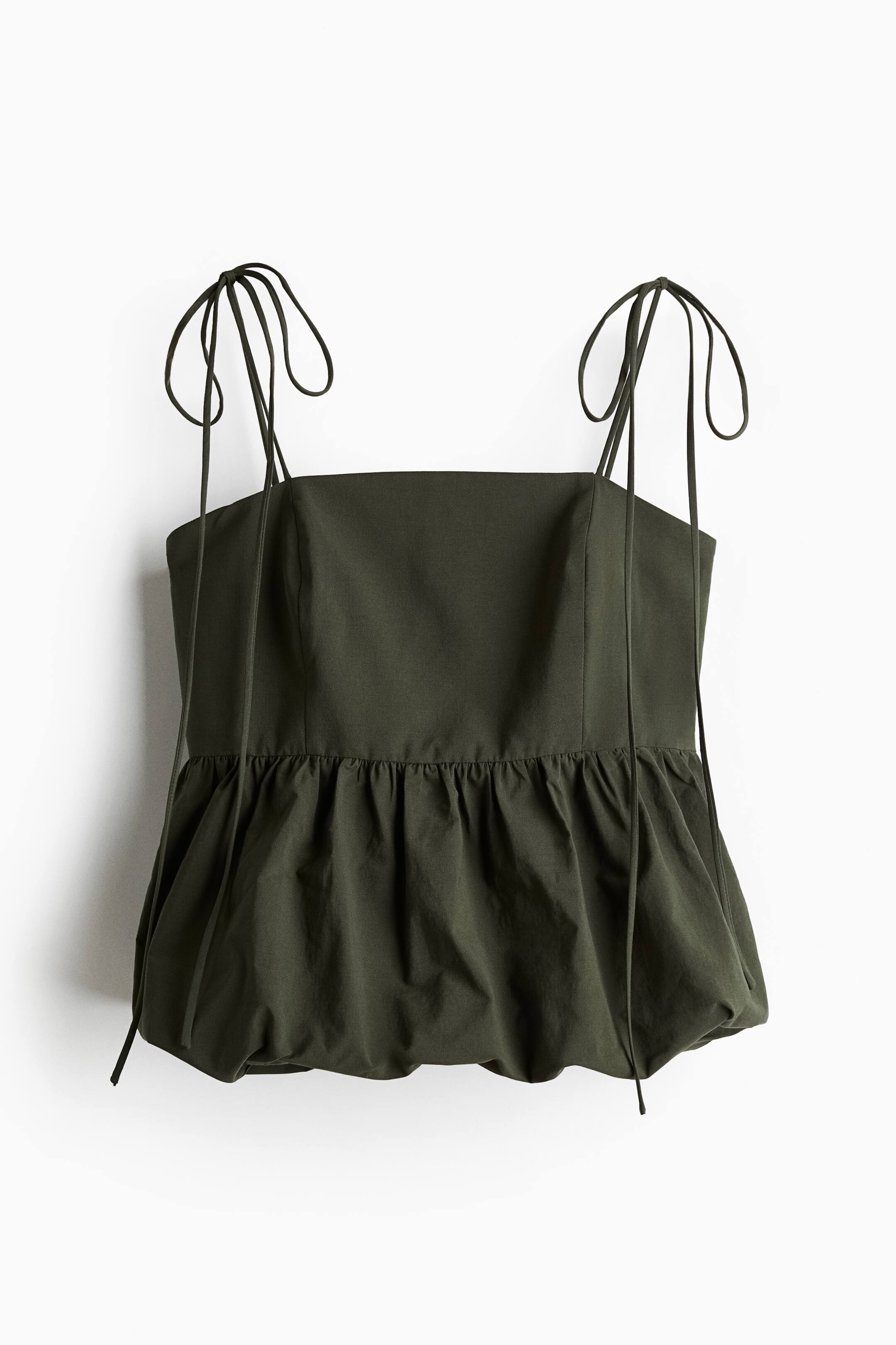 Een top van geweven stof. Nauwsluitende pasvorm. Het model heeft supersmalle schouderbandjes die je vanboven strikt, een blinde zijrits, een brede strook met fronsjes in de taille en een opgebolde rand onderaan voor een pofeffect.