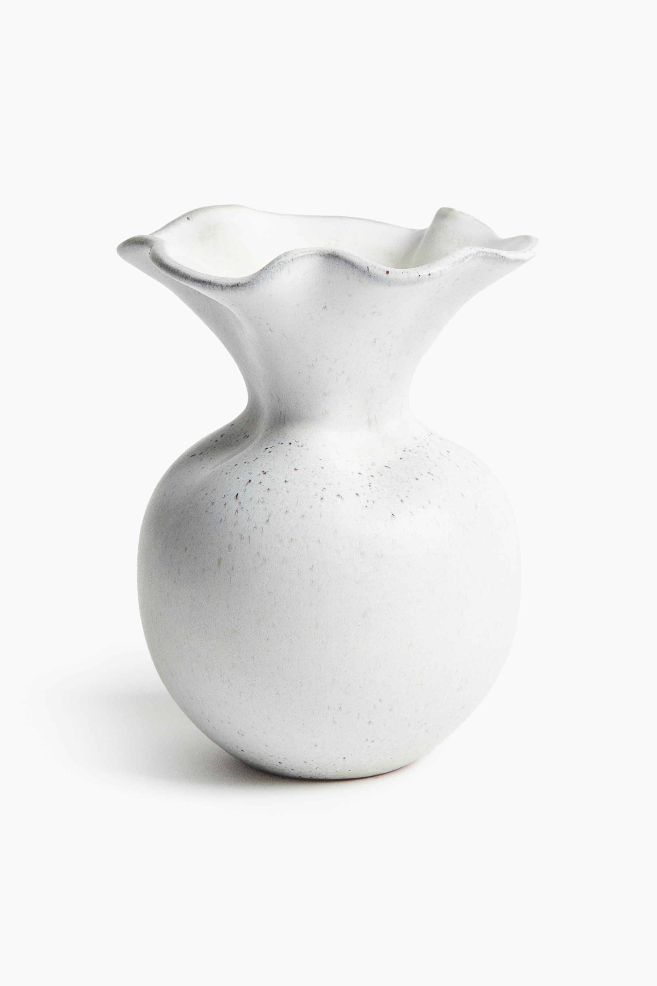 Een vaas van geglazuurd terracotta. De vorm doet denken aan zacht geplooid inpakpapier rond een bos bloemen. Perfect om een boeket mooi te schikken. Breedte op het breedste punt 16 cm. Hoogte 22 cm.